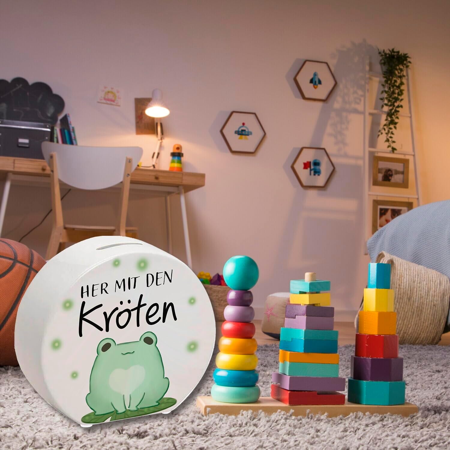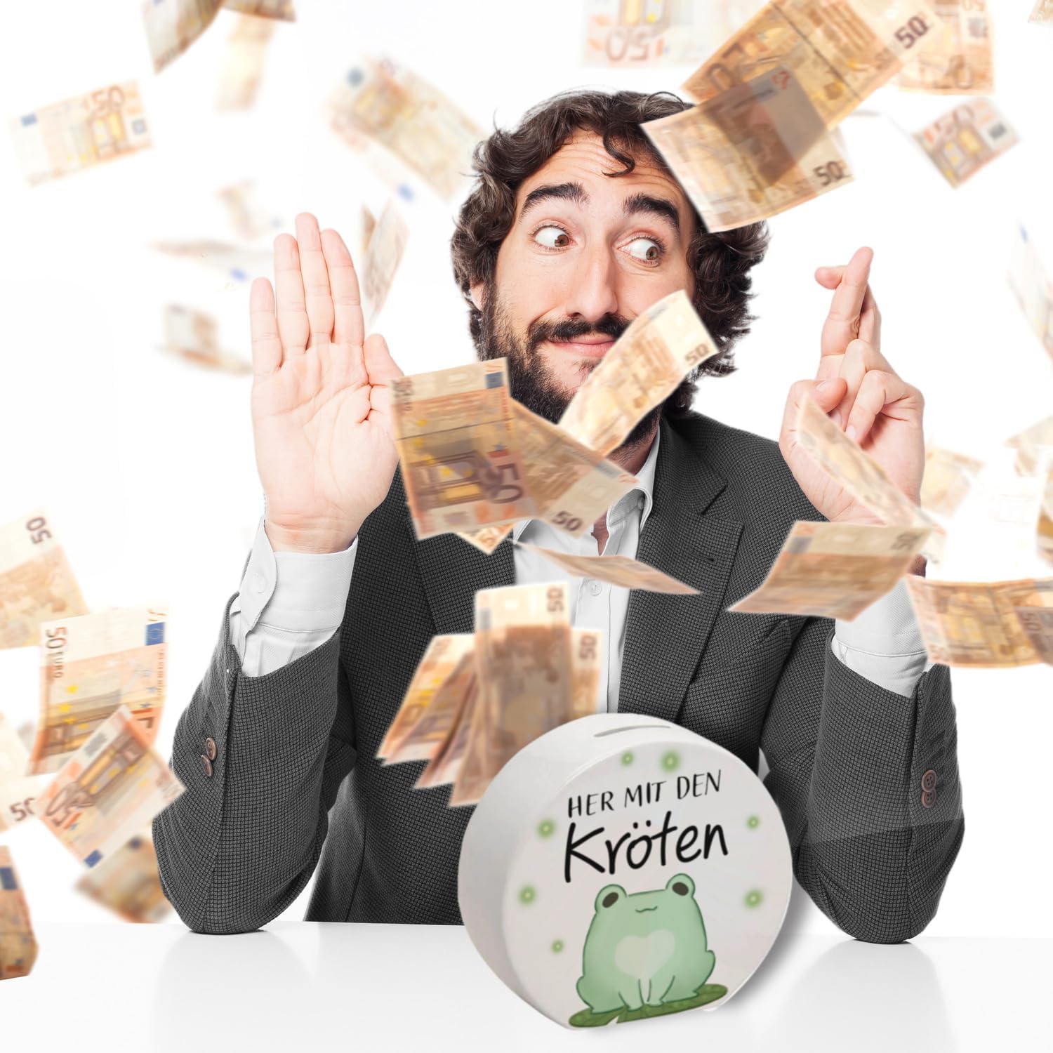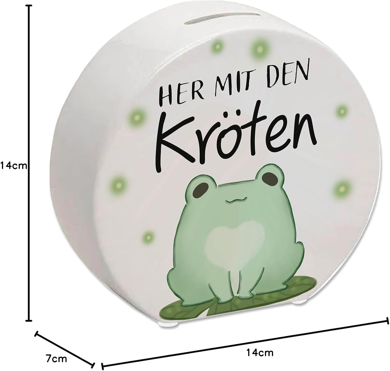 Fornitura: 1x salvadanaio a forma di rana con la scritta Bring on the rospi. Il salvadanaio è decorato con una simpatica rana sorridente che tiene al sicuro le tue monete e banconote. Questo design a fumetti kawaii porta un tocco allegro nella stanza di ogni bambino. I salvadanai sono ideali per insegnare a bambini e ragazzi il valore del denaro e del risparmio. Il detto Portate i rospi è un divertente gioco di parole che riprende il motivo della rana. Rospo in gergo significa denaro, quindi la rana incoraggia indirettamente le persone a mettere più soldi nel salvadanaio. È un piccolo incentivo per non dimenticare di risparmiare. Stai cercando un regalo carino e divertente per il compleanno di un adolescente? Questo salvadanaio è perfetto! Puoi anche riempirlo con un piccolo capitale iniziale. È anche un ottimo regalo per ogni occasione in cui un po' di umorismo e un suggerimento salvifico non farebbero male. Salvadanaio in ceramica di alta qualità con stampe colorate. Con tappi di plastica sul fondo. Altezza ca. 13 cm, larghezza ca. 14 cm e profondità ca. 5 cm. Peso ca. 380 g.