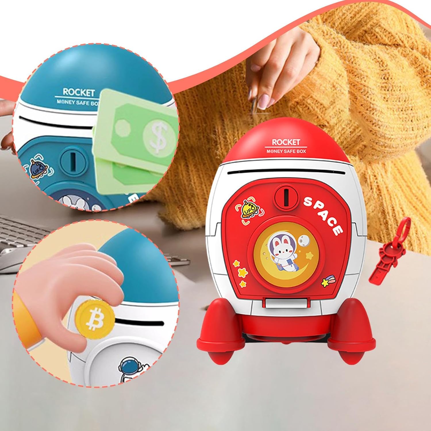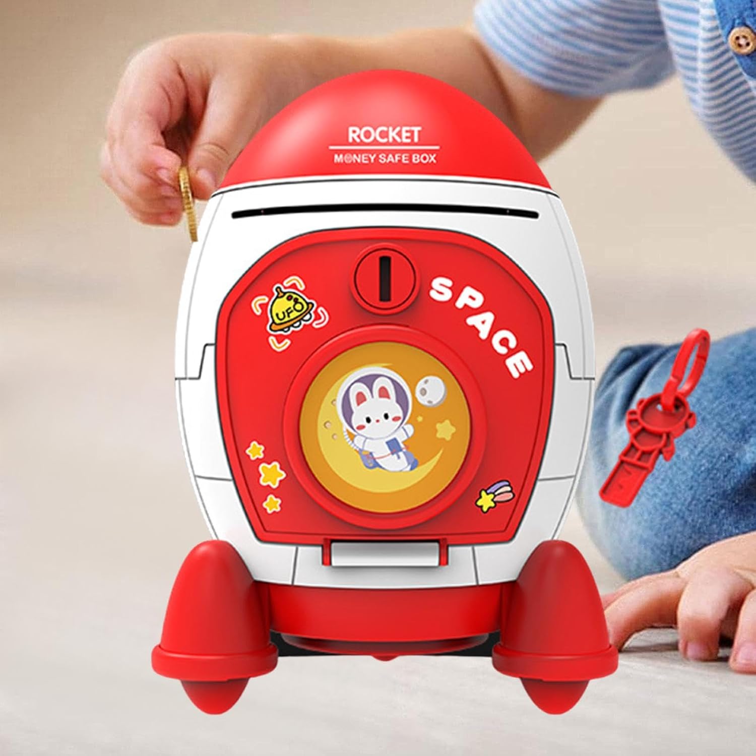 【Interni spaziosi】: l'ampia capacità della cabina del razzo permette ai bambini di risparmiare di più, incoraggiandoli a sviluppare buone abitudini finanziarie fin dalla età. È ottimo per costruire il proprio nel tempo. 【Materiale】: salvadanaio per bambini è realizzato in PP, struttura leggera e robusta, progettata per resistere alle cadute 【Informazioni sulle dimensioni】: a forma di razzo misura circa 13 cm x 13 cm x 19 cm / 5,12 pollici x 5,12 pollici x 7,48 pollici 【Adorabile design a forma di razzo】: Questo salvadanaio per bambini presenta un'affascinante forma a razzo che funge sia da pratico strumento di risparmio che da delizioso elemento decorativo. Il suo design vivace unisce creatività e praticità, rendendolo un'aggiunta accattivante alla scrivania o alla cameretta di qualsiasi bambino. 【Sicuro e pratico】: dotato di una fessura per le chiavi nella parte inferiore, questo salvadanaio garantisce che i risparmi del tuo bambino siano al sicuro e facilmente accessibili quando necessario. Niente più preoccupazioni per i soldi persi o smarriti.