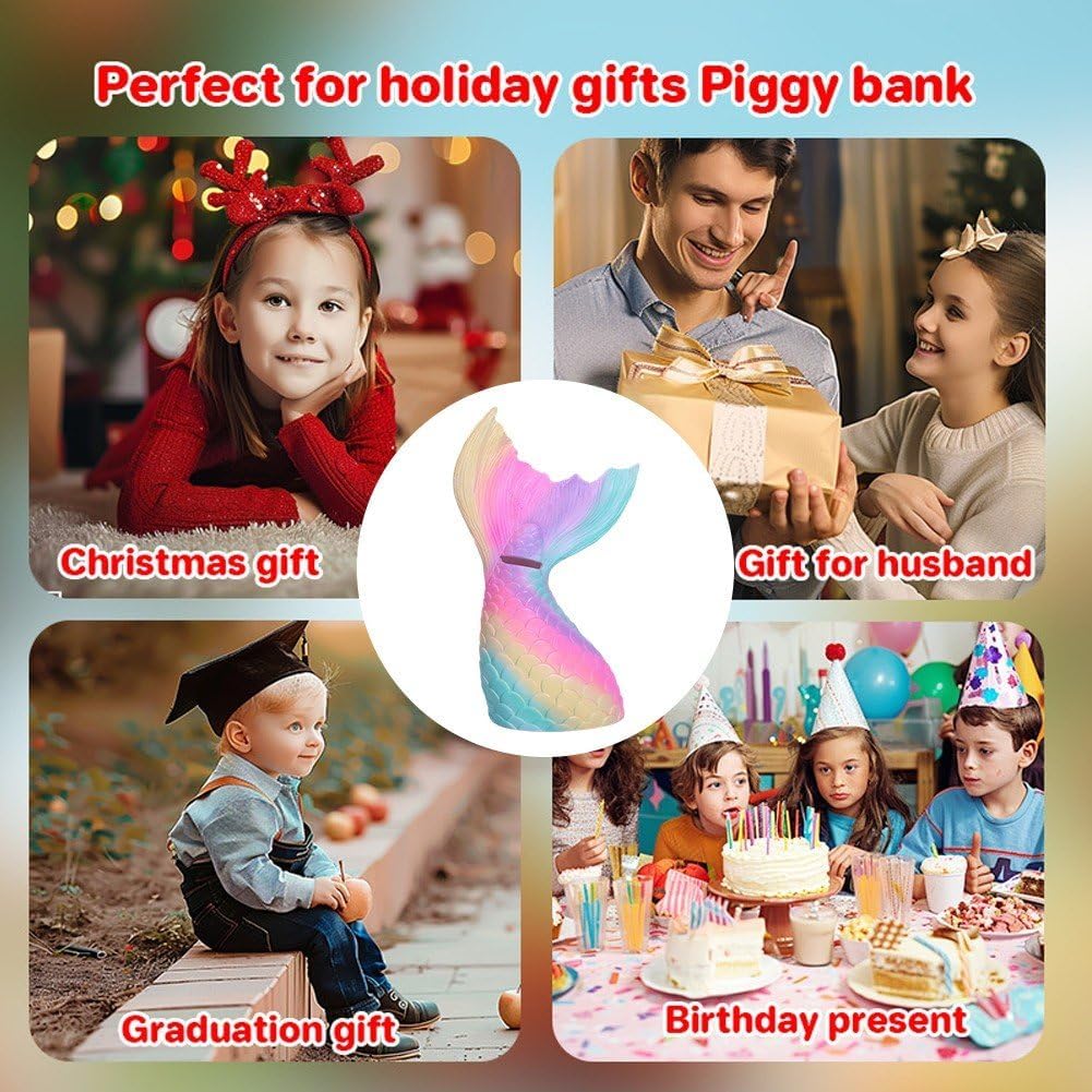 Design: Questo salvadanaio a forma di coda di sirena arcobaleno, con il suo design a forma di sirena, unisce e creatività. luminosa coda di sirena sembra trasportarti in un colorato mondo sottomarino. Sicurezza dei materiali: utilizziamo materiali di alta qualità, ecologici e non vinilici, per garantire che ogni dettaglio sia sicuro e innocuo, particolarmente adatto bambini. Che si tratti della delicata texture della ceramica o della leggerezza e resistenza della plastica, sono stati rigorosamente testati per garantirti un utilizzo sicuro. Colore arcobaleno: il design dai colori arcobaleno rende questo salvadanaio un bellissimo paesaggio nella stanza. Che sia posizionato sulla scrivania, sul comodino o in soggiorno, può aggiungere calore e vitalità spazio abitativo. Interazione: non è un salvadanaio, anche un giocattolo interattivo. Ogni volta che inserisci una moneta, puoi sperimentare meravigliosa interazione con sirena, stimolando l'interesse dei bambini per il risparmio e coltivando un buon concetto di denaro. Significato meraviglioso: sirena simboleggia bellezza e saggezza. Regalare questo salvadanaio a bambini o amici significa esprimere una speranza luminosa e infinita.
