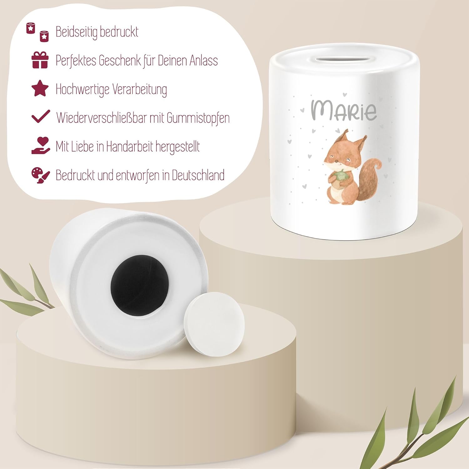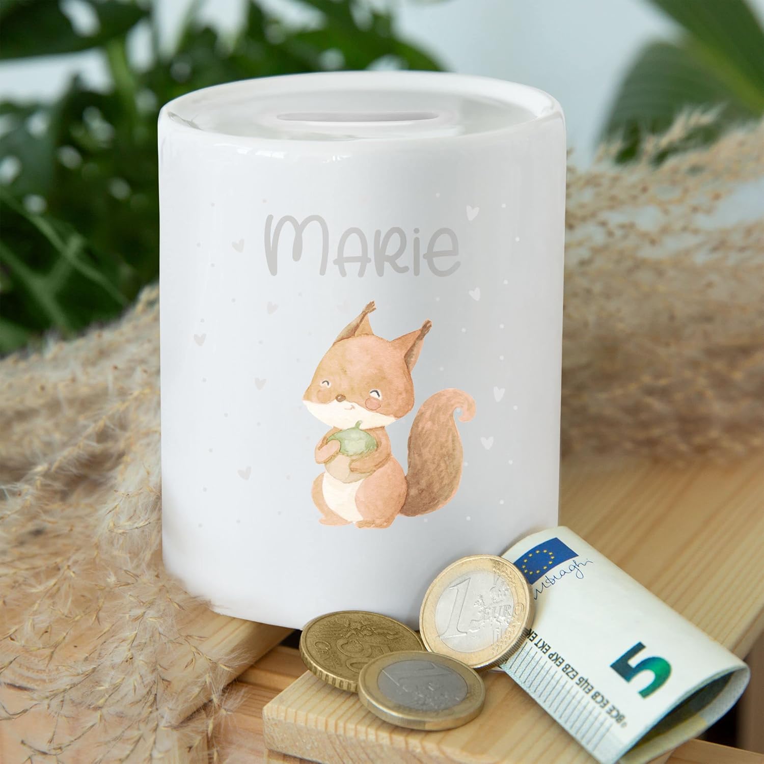 ✔️ DECORAZIONE SCOIATTOLO: dolce motivo con scoiattolo e nome desiderato per neonati e bambini Fantastico salvadanaio: stai cercando il regalo di nozze perfetto, un regalo per l'inaugurazione della casa o per l'inizio della scuola per rendere felici i tuoi cari? Questo salvadanaio stampato è perfetto come regalo in denaro o come piccolo regalo. Non importa se stai risparmiando per la luna di miele, il capitale iniziale per il tuo nuovo appartamento o come regalo per una festa scolastica: questo bellissimo cofanetto di risparmio attira davvero l'attenzione e farà sicuramente brillare tutti! Stampato su entrambi i lati: il salvadanaio bianco a tinta unita è stampato su entrambi i lati. La stampa divertente è sempre visibile e il salvadanaio fa una bella figura da ogni angolazione. Ultimo ma non meno importante, la stampa su entrambi i lati rende questo salvadanaio l'idea regalo ideale per compleanni, matrimoni e molti altri grandi eventi. Rendi felici i tuoi cari con i nostri motivi divertenti! Salvadanaio in ceramica: il nostro salvadanaio stampato è realizzato in ceramica di alta qualità. La superficie della scatola in ceramica è diritta e uniforme, il che le conferisce un aspetto di alta qualità. Insieme al motivo individuale, il salvadanaio diventa un regalo unico, che sarà sicuramente ben accolto in ogni occasione. Rendi felici i tuoi cari con questa bellissima idea regalo! Tappo integrato: il bellissimo salvadanaio ha un'apertura nella parte inferiore con un tappo in gomma. Ciò significa che il salvadanaio può essere svuotato facilmente. In questo modo puoi sempre risparmiare per nuovi sogni. Regala questo fantastico salvadanaio ad amici o familiari e fai brillare tutti!