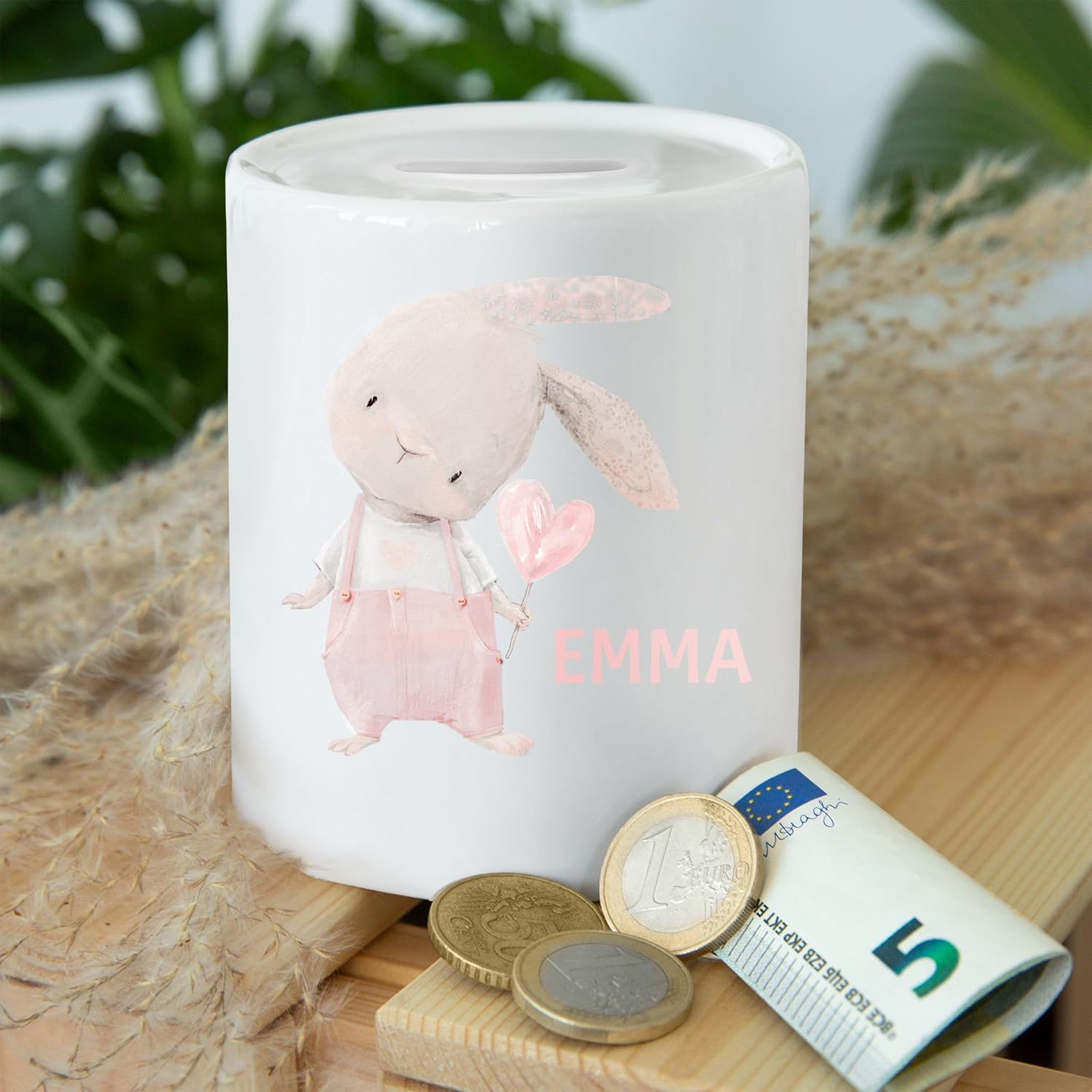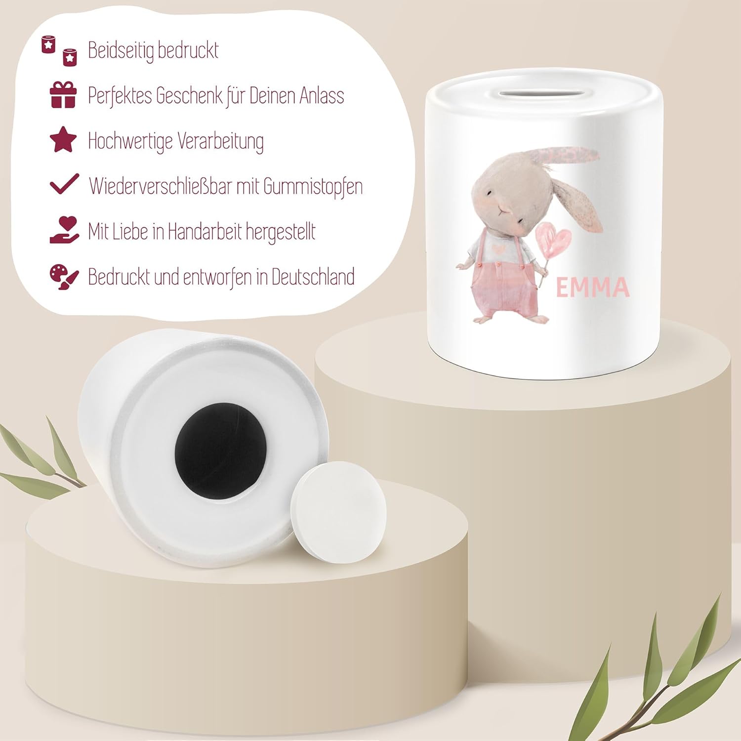 MOTIVO INCANTEVOLE PER BAMBINE: regala ai tuoi cari questo dolce motivo di coniglietto. Fantastico salvadanaio: stai cercando il regalo di nozze perfetto, un regalo per l'inaugurazione della casa o per l'inizio della scuola per rendere felici i tuoi cari? Questo salvadanaio stampato è perfetto come regalo in denaro o come piccolo regalo. Non importa se stai risparmiando per la luna di miele, il capitale iniziale per il tuo nuovo appartamento o come regalo per una festa scolastica: questo bellissimo cofanetto di risparmio attira davvero l'attenzione e farà sicuramente brillare tutti! Stampato su entrambi i lati: il salvadanaio bianco a tinta unita è stampato su entrambi i lati. La stampa divertente è sempre visibile e il salvadanaio fa una bella figura da ogni angolazione. Ultimo ma non meno importante, la stampa su entrambi i lati rende questo salvadanaio l'idea regalo ideale per compleanni, matrimoni e molti altri grandi eventi. Rendi felici i tuoi cari con i nostri motivi divertenti! Salvadanaio in ceramica: il nostro salvadanaio stampato è realizzato in ceramica di alta qualità. La superficie della scatola in ceramica è diritta e uniforme, il che le conferisce un aspetto di alta qualità. Insieme al motivo individuale, il salvadanaio diventa un regalo unico, che sarà sicuramente ben accolto in ogni occasione. Rendi felici i tuoi cari con questa bellissima idea regalo! Tappo integrato: il bellissimo salvadanaio ha un'apertura nella parte inferiore con un tappo in gomma. Ciò significa che il salvadanaio può essere svuotato facilmente. In questo modo puoi sempre risparmiare per nuovi sogni. Regala questo fantastico salvadanaio ad amici o familiari e fai brillare tutti!