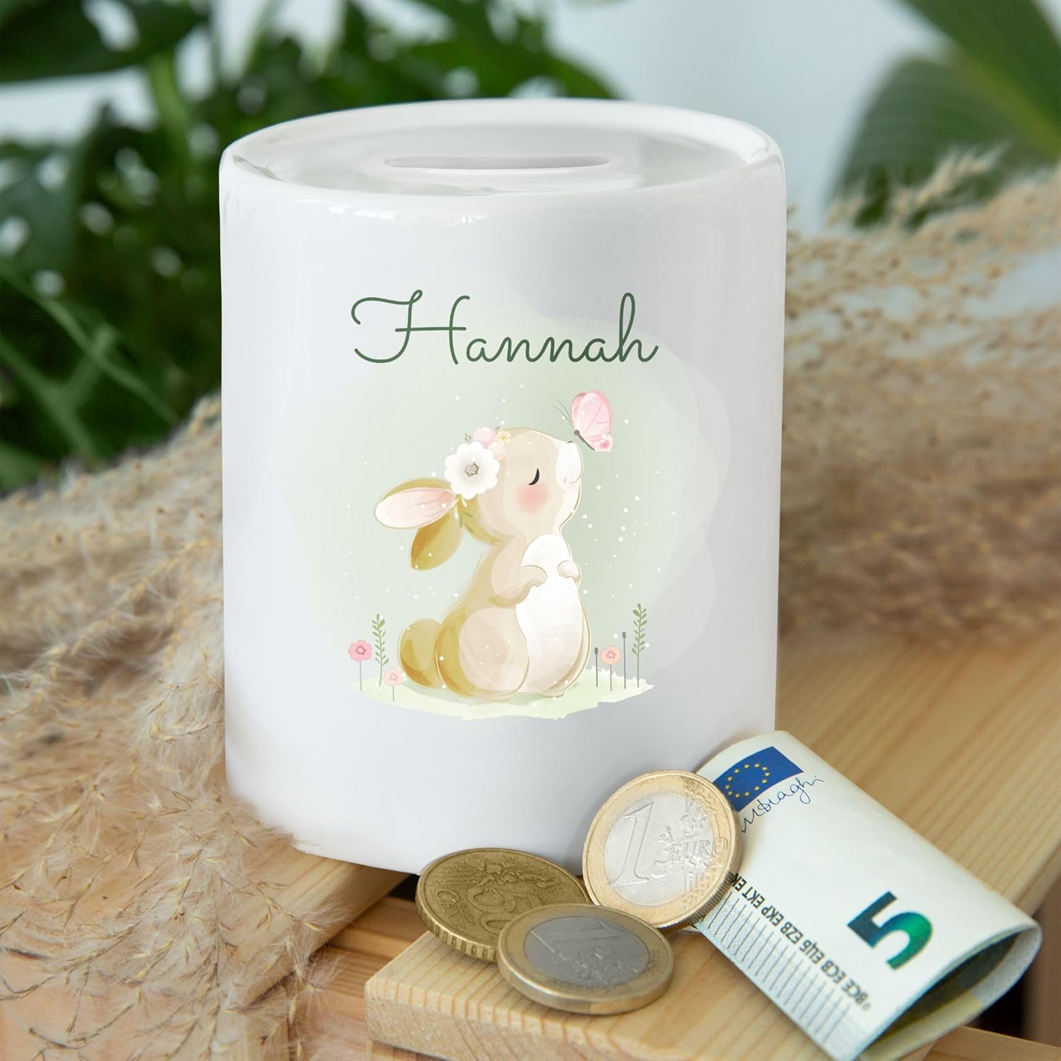 REGALO PER GLI AMANTI DEI CONIGLIETTI: bellissimo motivo con un coniglietto e il nome desiderato per neonati, bambini e adulti Fantastico salvadanaio: stai cercando il regalo di nozze perfetto, un regalo per l'inaugurazione della casa o per l'inizio della scuola per rendere felici i tuoi cari? Questo salvadanaio stampato è perfetto come regalo in denaro o come piccolo regalo. Non importa se stai risparmiando per la luna di miele, il capitale iniziale per il tuo nuovo appartamento o come regalo per una festa scolastica: questo bellissimo cofanetto di risparmio attira davvero l'attenzione e farà sicuramente brillare tutti! Stampato su entrambi i lati: il salvadanaio bianco a tinta unita è stampato su entrambi i lati. La stampa divertente è sempre visibile e il salvadanaio fa una bella figura da ogni angolazione. Ultimo ma non meno importante, la stampa su entrambi i lati rende questo salvadanaio l'idea regalo ideale per compleanni, matrimoni e molti altri grandi eventi. Rendi felici i tuoi cari con i nostri motivi divertenti! Salvadanaio in ceramica: il nostro salvadanaio stampato è realizzato in ceramica di alta qualità. La superficie della scatola in ceramica è diritta e uniforme, il che le conferisce un aspetto di alta qualità. Insieme al motivo individuale, il salvadanaio diventa un regalo unico, che sarà sicuramente ben accolto in ogni occasione. Rendi felici i tuoi cari con questa bellissima idea regalo! Tappo integrato: il bellissimo salvadanaio ha un'apertura nella parte inferiore con un tappo in gomma. Ciò significa che il salvadanaio può essere svuotato facilmente. In questo modo puoi sempre risparmiare per nuovi sogni. Regala questo fantastico salvadanaio ad amici o familiari e fai brillare tutti!