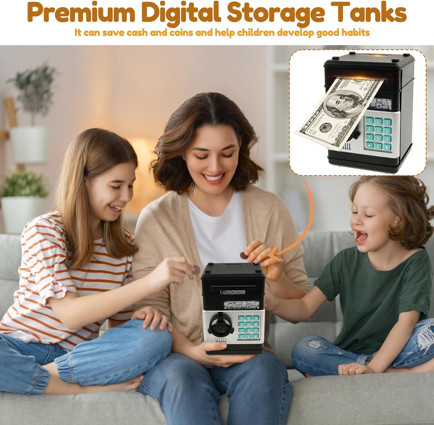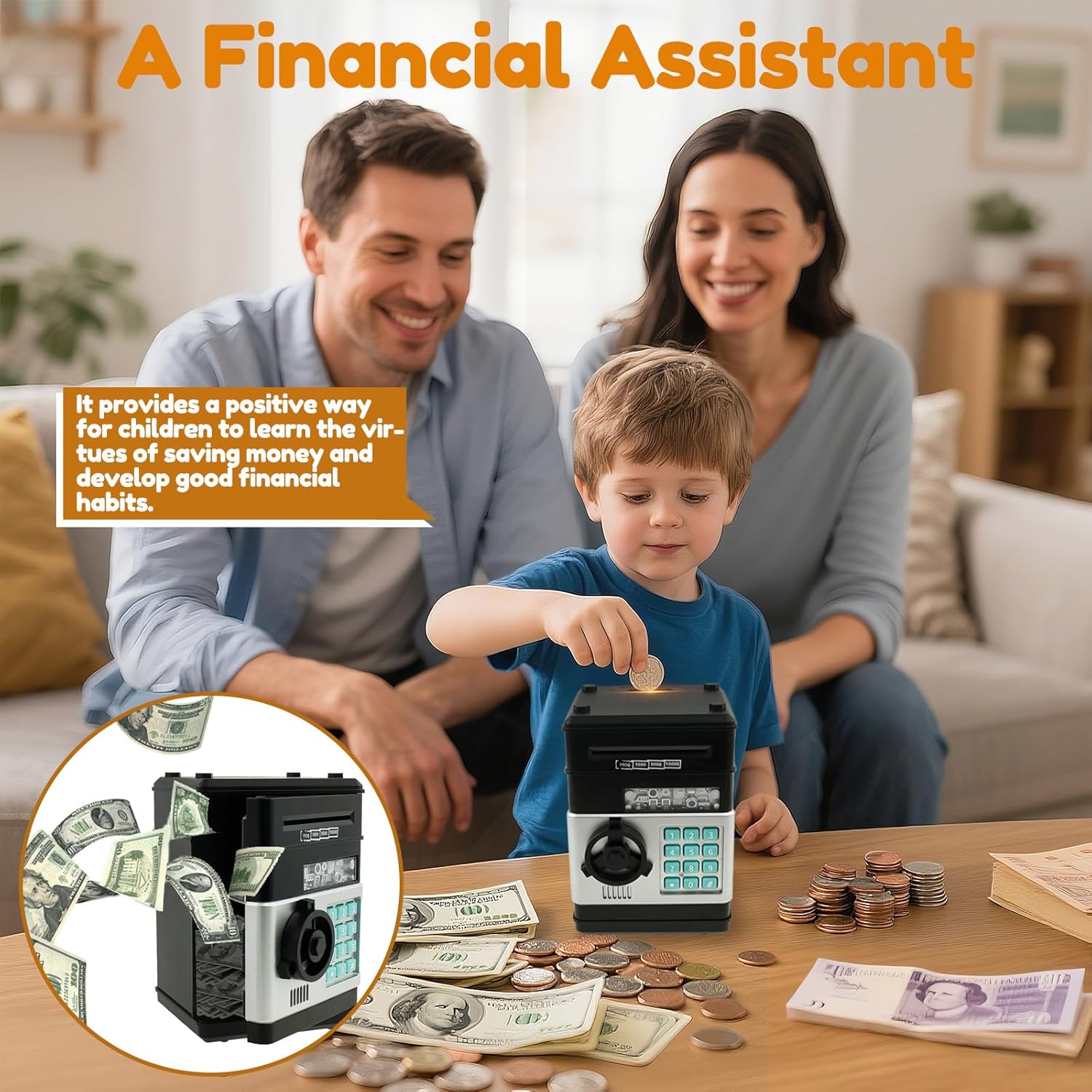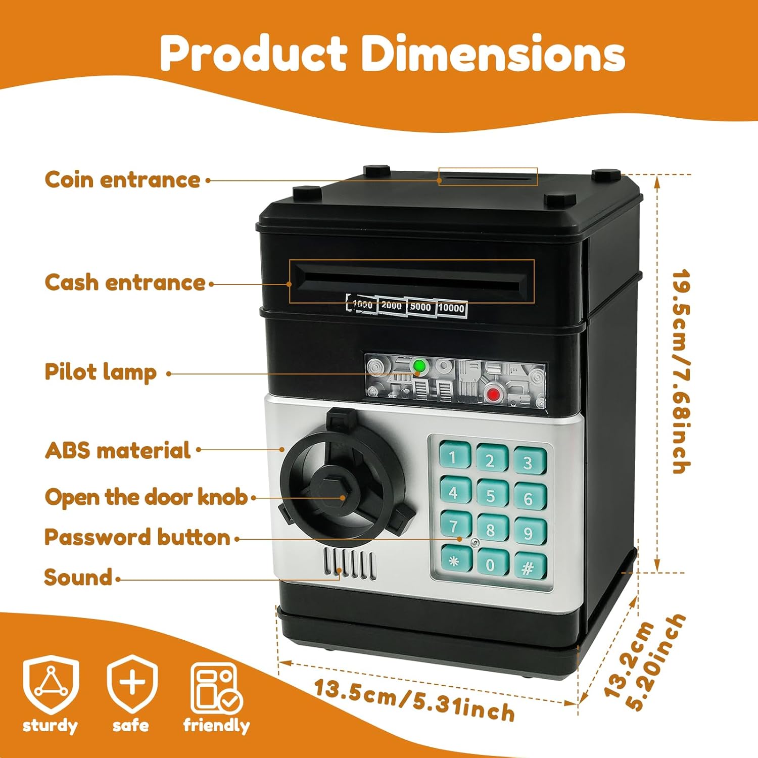 【Texture di alta qualità】 Questo salvadanaio con texture ABS garantisce un utilizzo a lungo termine, sicuro e affidabile. È un contenitore di denaro ideale per i bambini. 【Alimentazione automatica】Non appena le banconote entrano nella cassa, il salvadanaio aspira automaticamente il denaro, in modo simile a un piccolo bancomat. La fessura per le monete è nella parte superiore in modo che i bambini possano inserire facilmente i soldi. 【Protezione tramite password】 Il salvadanaio è protetto con una password elettronica a quattro cifre. Immettere la password corretta (luce verde), ruotare la manopola in senso orario per aprire la porta. La password predefinita è 0000. È possibile modificare la password: aprire il flip e premere a lungo * finché le luci rossa e verde non lampeggiano. Entro 15 secondi, inserisci la nuova password, premi # per salvare. Allentare * e chiudere la porta per completare il processo. 【Money Helper】 Questo è un salvadanaio elettronico per conservare contanti. I bambini imparano a risparmiare denaro, sviluppando così la virtù del risparmio e le buone abitudini finanziarie. 【Regalo perfetto per i bambini】 Le banconote del salvadanaio sono dotate di una bellissima scatola colorata, è il miglior regalo per compleanni, Festa dei bambini, Natale, Halloween, Ringraziamento, Pasqua, ricompensa o altre festività. Particolarmente adatto per ragazzi e ragazze dai 3 ai 12 anni.