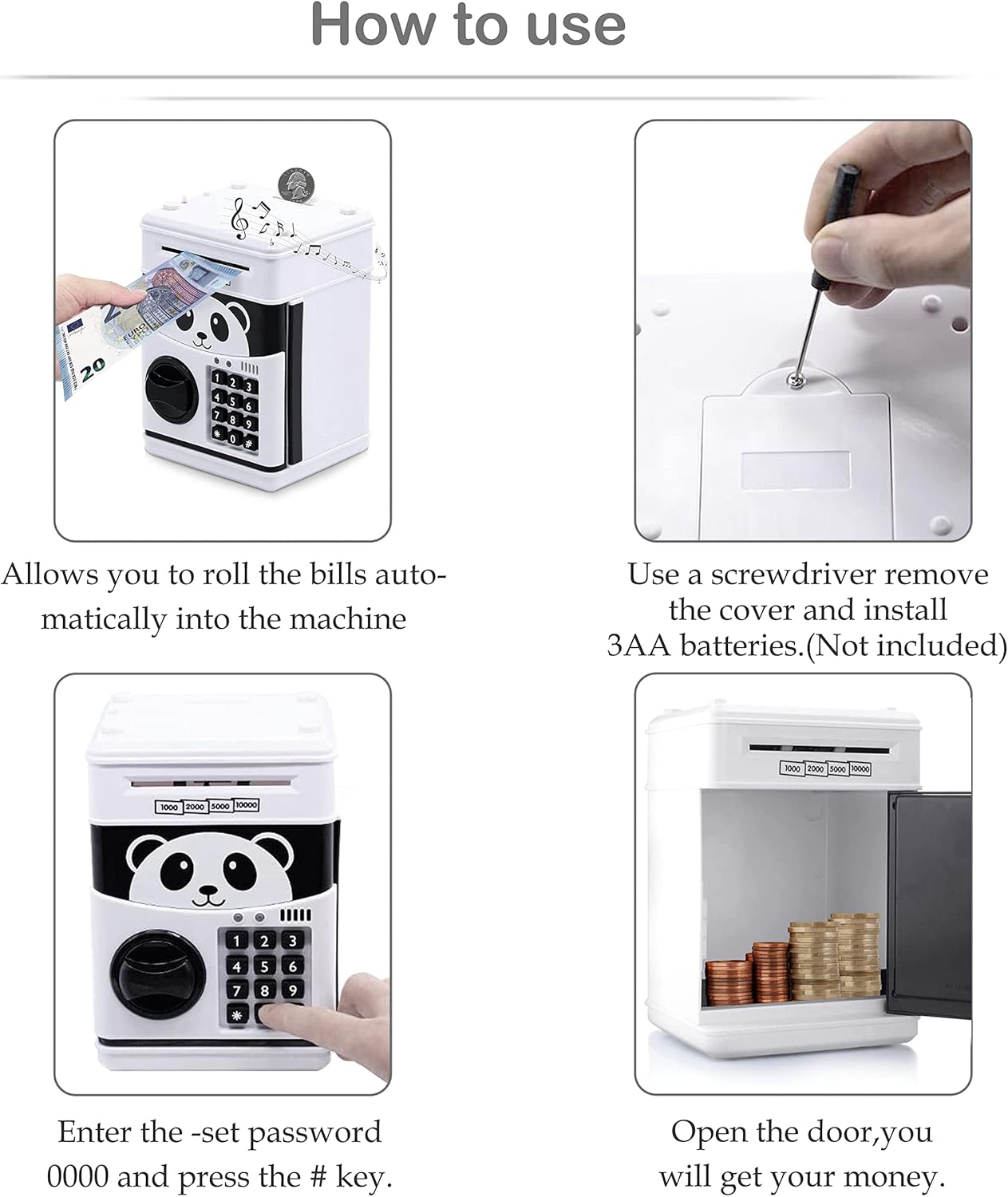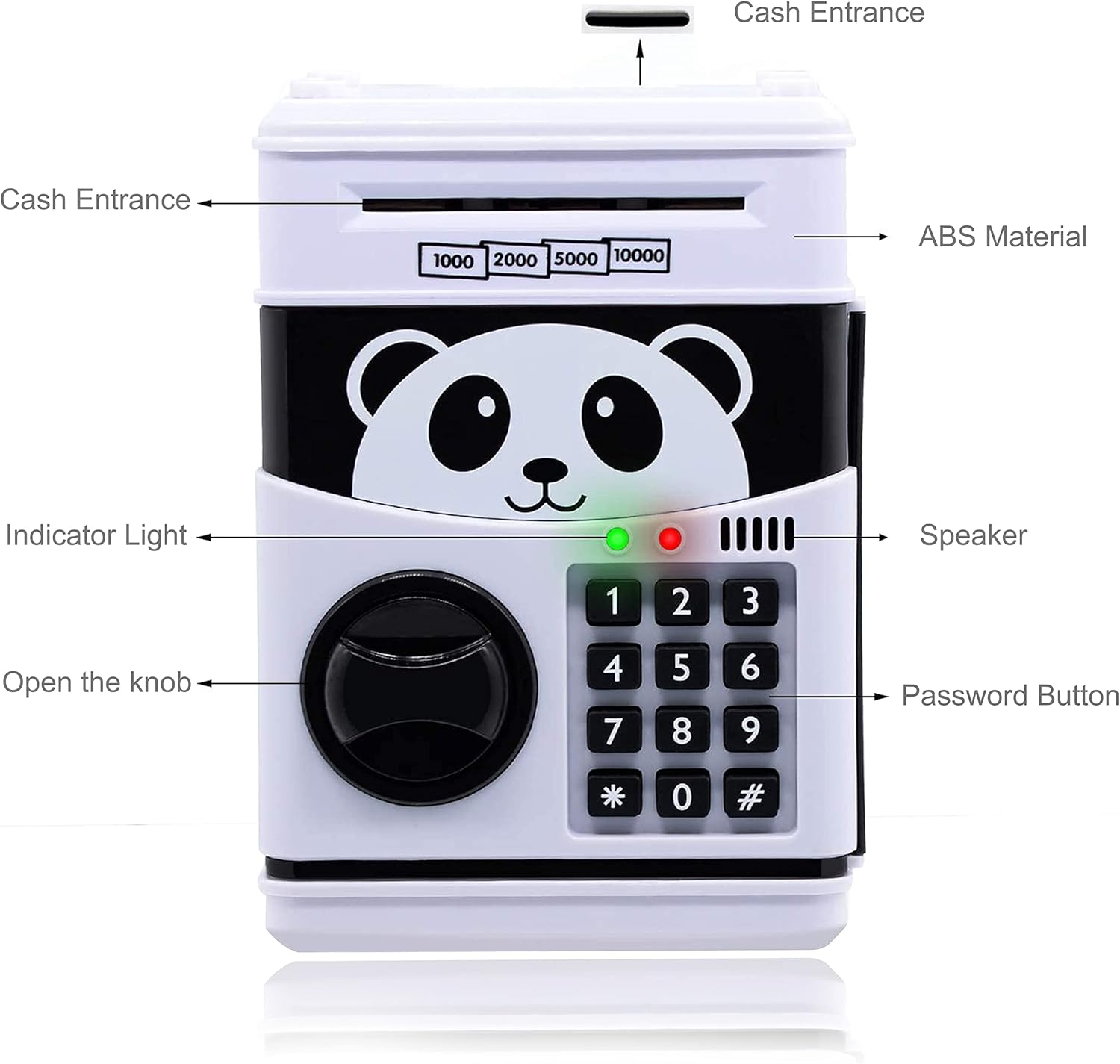 Alta qualità: il grande salvadanaio utilizza plastica ABS ecologica, nessun odore, anti-invecchiamento, durevole, adulti e bambini possono usarlo in sicurezza. Salvadanaio elettronico con password: il salvadanaio elettronico è dotato di un robusto dispositivo di protezione con password. Immettere la password di quattro cifre (predefinita 0000), luce verde. Se inserisci la password sbagliata, si accenderà la luce rossa. Ti ricorderò di riprovare. Design ATM: inserisci la carta moneta nell'ingresso del salvadanaio, può essere automaticamente arrotolata nella macchina, il che può stimolare la curiosità dei bambini. Metodo di conservazione: Le monete possono essere inserite nel salvadanaio dei nostri bambini dall'alto e le banconote dalla parte anteriore. Inoltre, alcuni piccoli oggetti di valore possono essere custoditi nella nostra mini cassaforte. Grande capacità: questo salvadanaio può contenere 600 monete o 100 banconote. Batterie: 3 batterie AA (non incluse). Promemoria: per rendere più utile il salvadanaio, si consiglia di utilizzare batterie alcaline