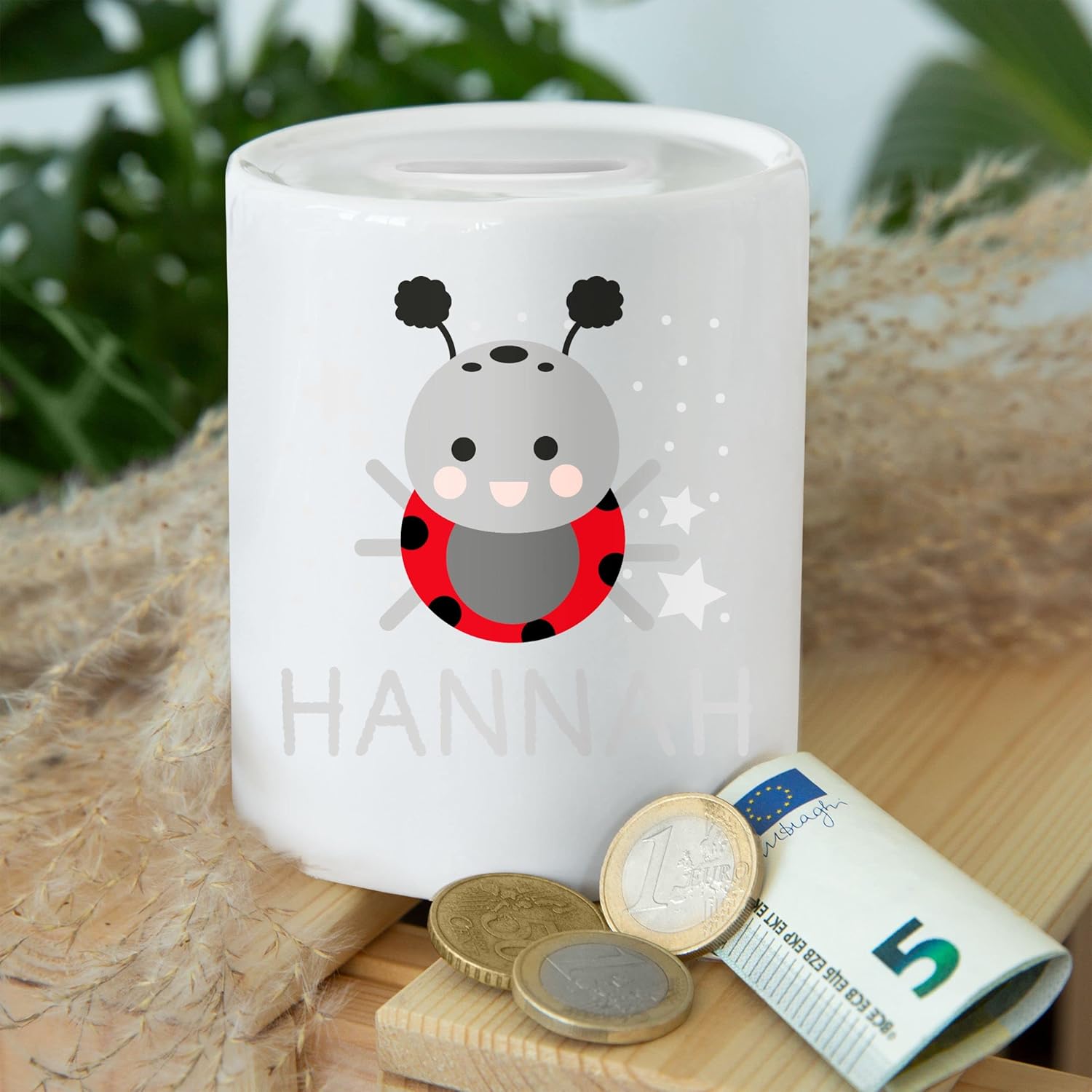 DECORAZIONE COCCINELLA: bellissimo motivo con una coccinella e il nome desiderato per neonati e bambini. Fantastico salvadanaio: stai cercando il regalo di nozze perfetto, un regalo per l'inaugurazione della casa o per l'inizio della scuola per rendere felici i tuoi cari? Questo salvadanaio stampato è perfetto come regalo in denaro o come piccolo regalo. Non importa se stai risparmiando per la luna di miele, il capitale iniziale per il tuo nuovo appartamento o come regalo per una festa scolastica: questo bellissimo cofanetto di risparmio attira davvero l'attenzione e farà sicuramente brillare tutti! Stampato su entrambi i lati: il salvadanaio bianco a tinta unita è stampato su entrambi i lati. La stampa divertente è sempre visibile e il salvadanaio fa una bella figura da ogni angolazione. Ultimo ma non meno importante, la stampa su entrambi i lati rende questo salvadanaio l'idea regalo ideale per compleanni, matrimoni e molti altri grandi eventi. Rendi felici i tuoi cari con i nostri motivi divertenti! Salvadanaio in ceramica: il nostro salvadanaio stampato è realizzato in ceramica di alta qualità. La superficie della scatola in ceramica è diritta e uniforme, il che le conferisce un aspetto di alta qualità. Insieme al motivo individuale, il salvadanaio diventa un regalo unico, che sarà sicuramente ben accolto in ogni occasione. Rendi felici i tuoi cari con questa bellissima idea regalo! Tappo integrato: il bellissimo salvadanaio ha un'apertura nella parte inferiore con un tappo in gomma. Ciò significa che il salvadanaio può essere svuotato facilmente. In questo modo puoi sempre risparmiare per nuovi sogni. Regala questo fantastico salvadanaio ad amici o familiari e fai brillare tutti!