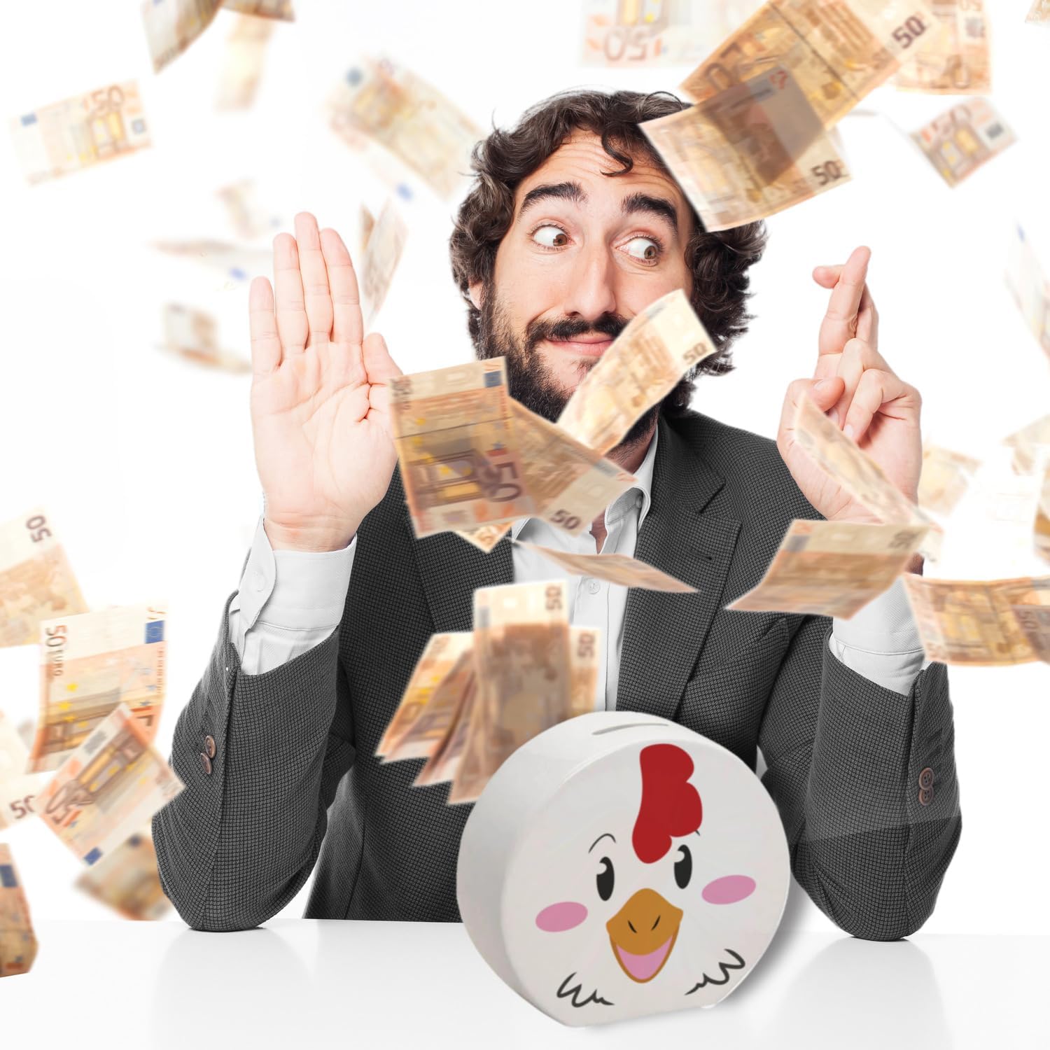 Fornitura: 1x salvadanaio in ceramica con una simpatica faccia di gallina - per bambini piccoli Questo è un simpatico salvadanaio con una simpatica faccia di gallina per i tuoi soldi risparmiati. Non solo ha un aspetto carino, ma migliora anche visivamente la stanza. Il salvadanaio è stampato con una simpatica faccia di pollo. La gallina ha la cresta rossa e il becco arancione. Per gli appassionati di pollo e i bambini come dolce idea regalo per i primi soldi risparmiati. Con questo salvadanaio risparmiare è due volte più divertente. Salvadanaio in ceramica di alta qualità con stampe colorate. Con tappi di plastica sul fondo. Altezza ca. 13 cm, larghezza ca. 14 cm e profondità ca. 5 cm. Peso ca. 380gr.
