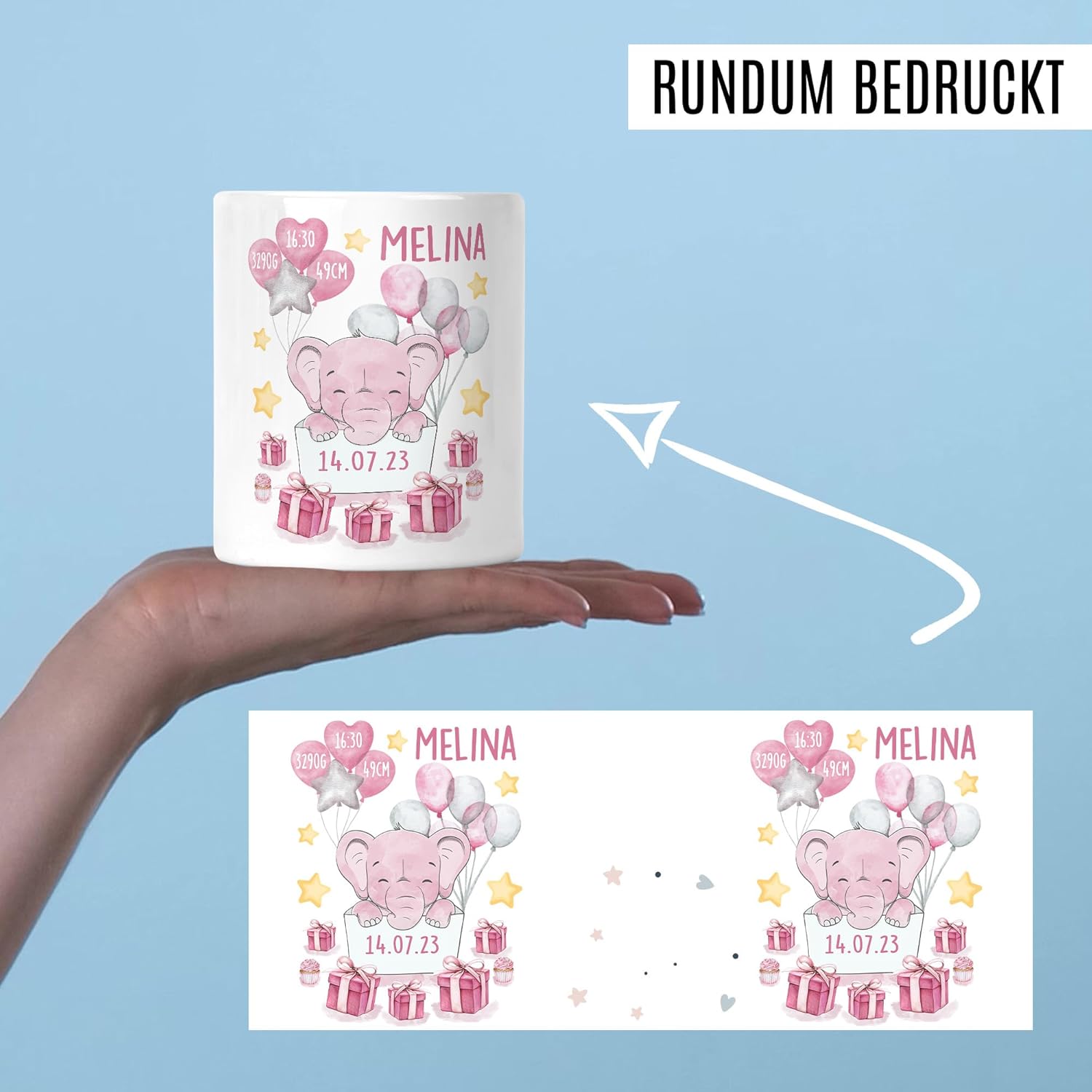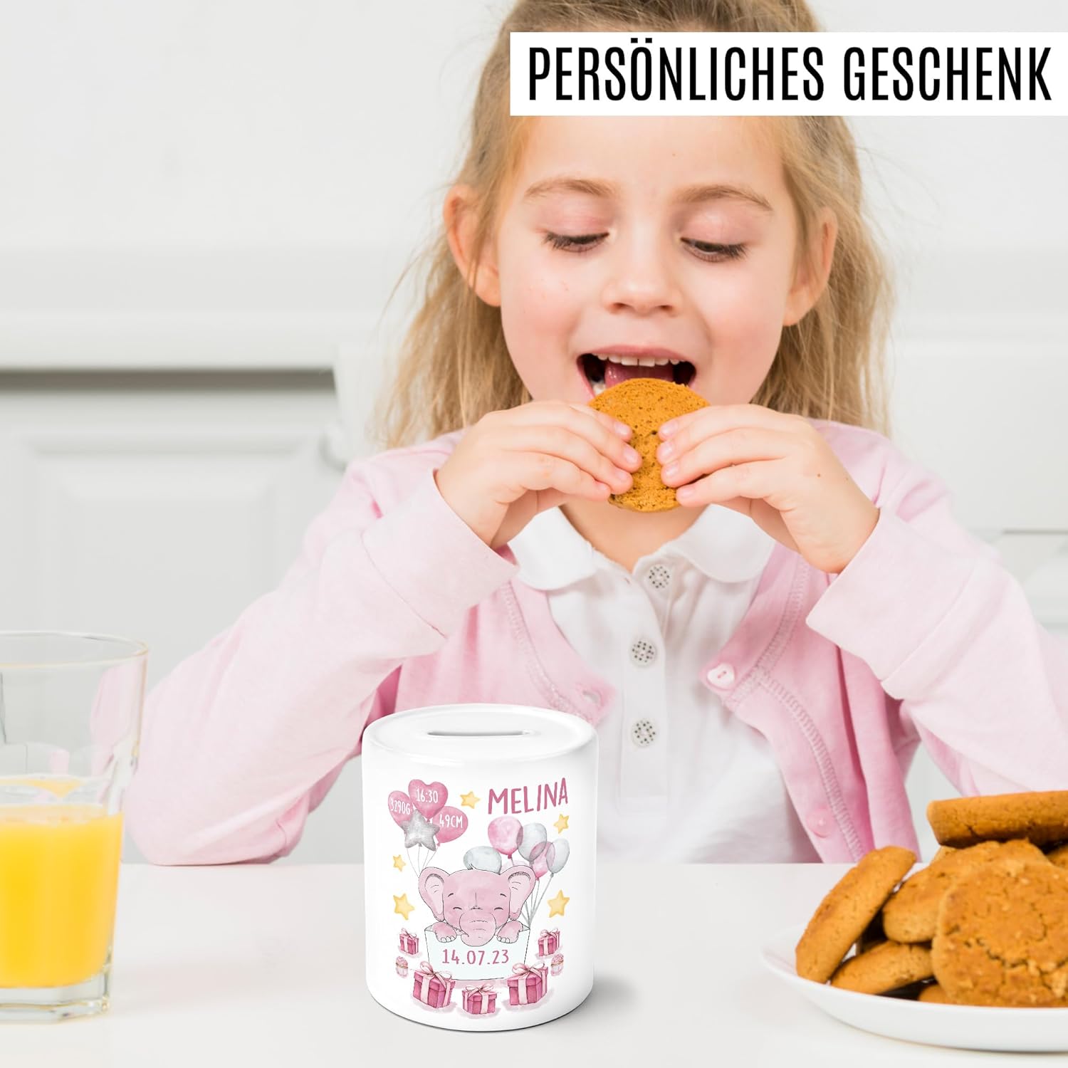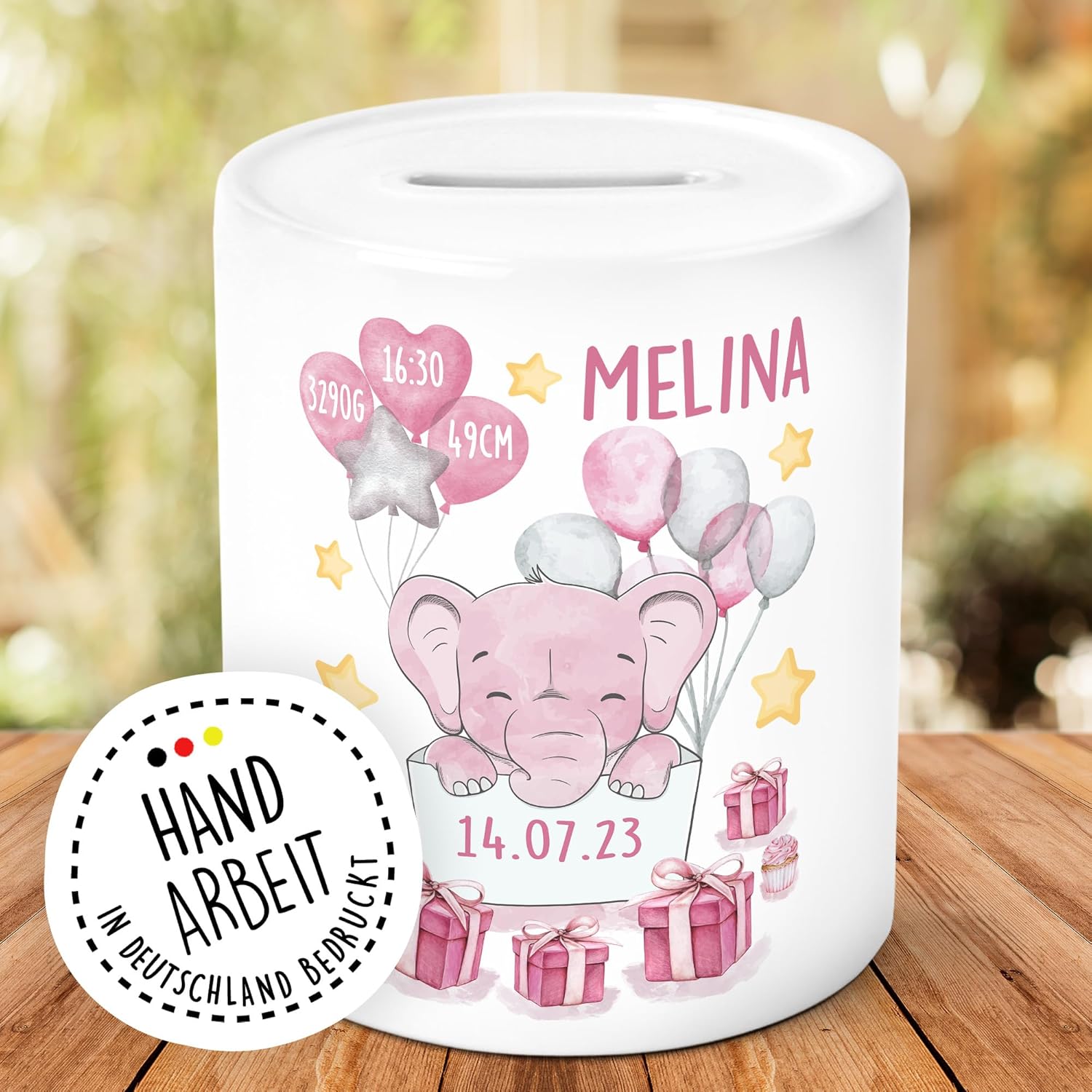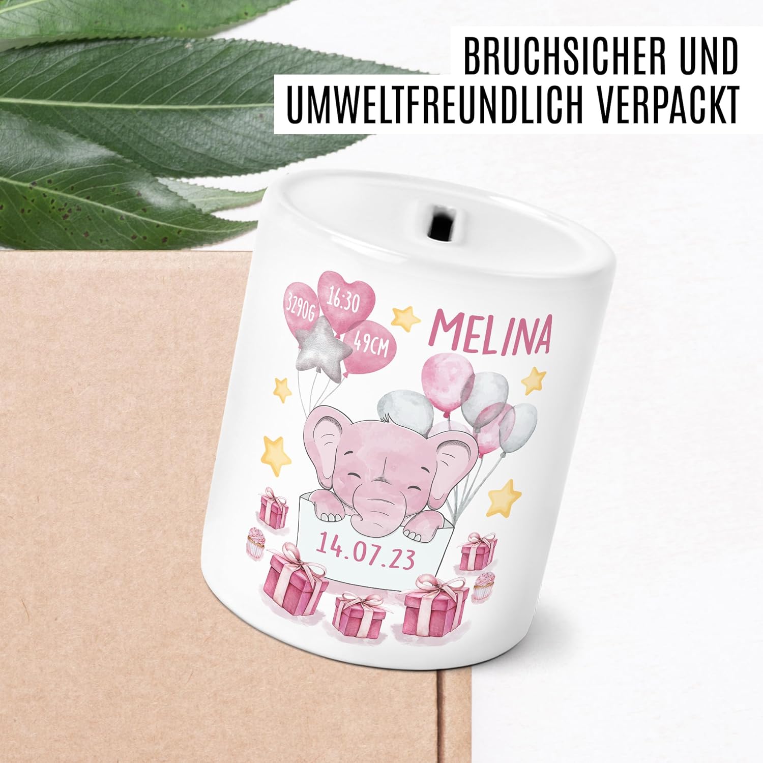 🐘 NOME DATA DI NASCITA DATI PROPRI. Salvadanaio personalizzato con i dettagli del bambino. Ideale come regalo per rendere felici i genitori. 🐘 IDEA REGALO per genitori per il battesimo del proprio figlio o anche per la nascita del proprio bambino. Ottimo come regalo personale per risparmiare denaro per tuo figlio. 🐘 ALTA QUALITÀ: superficie premium in ceramica al 100%. Richiudibile con pratico tappo in gomma sul fondo. Lavabile in lavastoviglie. Altezza: 10 cm, diametro: 8 cm, peso: 300 g. 🐘 STAMPATO SU PIÙ LATI e quindi bello da più lati. Un fantastico regalo di Natale o di compleanno. Tutti i salvadanai sono imballati con cura e stabilità. 🐘 FATTO A MANO: rifinito, stampato, confezionato e spedito in Germania. Ogni salvadanaio con stampa Pagma è progettato con attenzione ai dettagli. La stampa robusta garantisce un piacere duraturo.