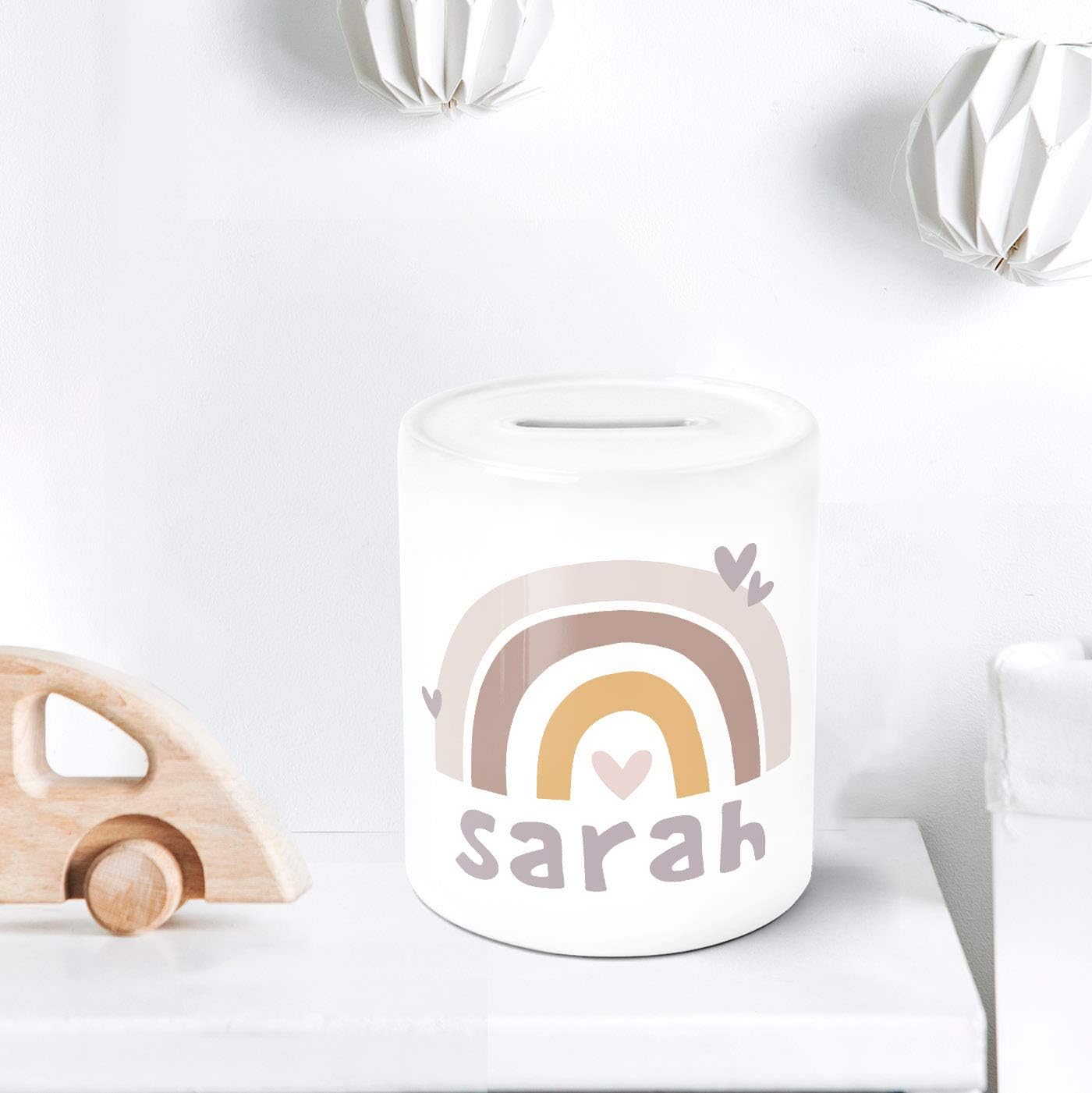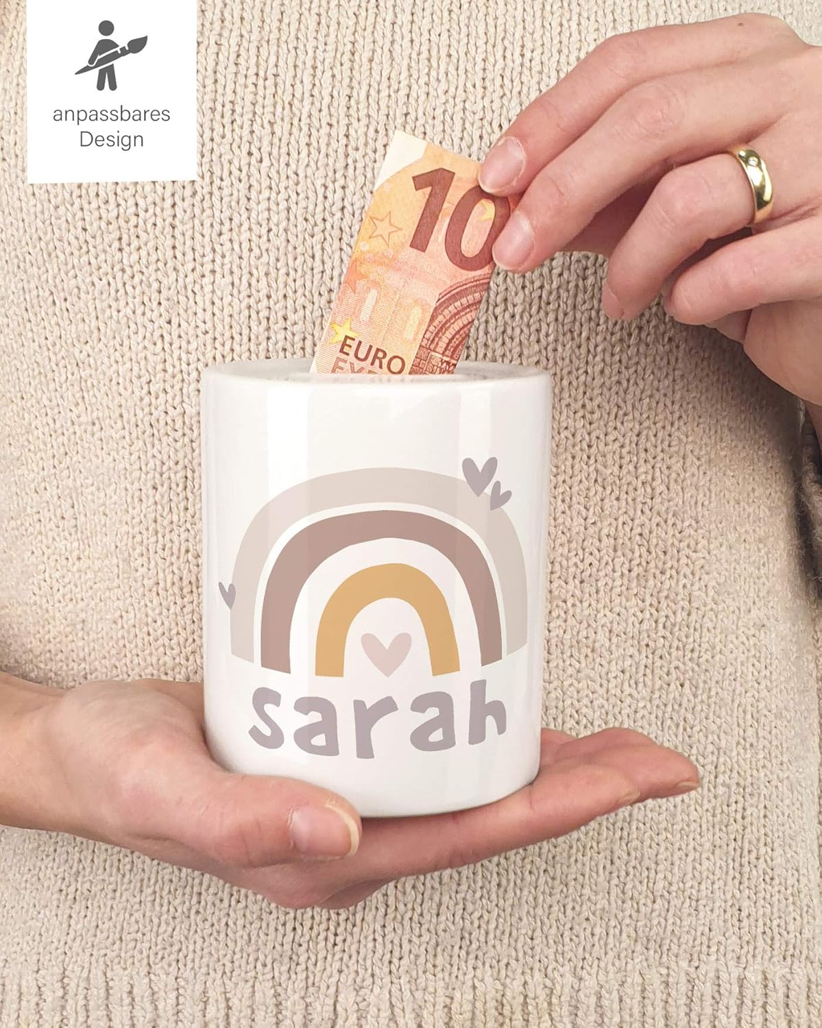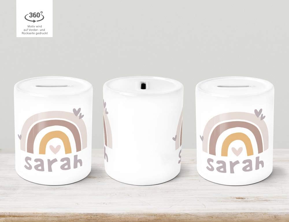 I bambini adorano gli arcobaleni. L'arcobaleno simboleggia sogni e desideri e i piccoli sognatori possono poi realizzarli con i loro risparmi... e con un salvadanaio con il proprio nome e una fantastica stampa arcobaleno, risparmiare è anche divertente. Perfetto per la prima paghetta: con un fantastico salvadanaio per bambini in regalo, i bambini imparano a usare il denaro in modo simpatico e parsimonioso – e hanno una decorazione straordinaria nella cameretta dei bambini. adatto anche come regalo. Acquistate velocemente online regali personalizzati per neonati e bambini: progettate il vostro salvadanaio e personalizzatelo con il vostro nome, ordinatelo a buon mercato e fatelo stampare. Moderno processo di stampa per colori brillanti e duraturi senza perdita di qualità Tappo in gomma per una facile rimozione