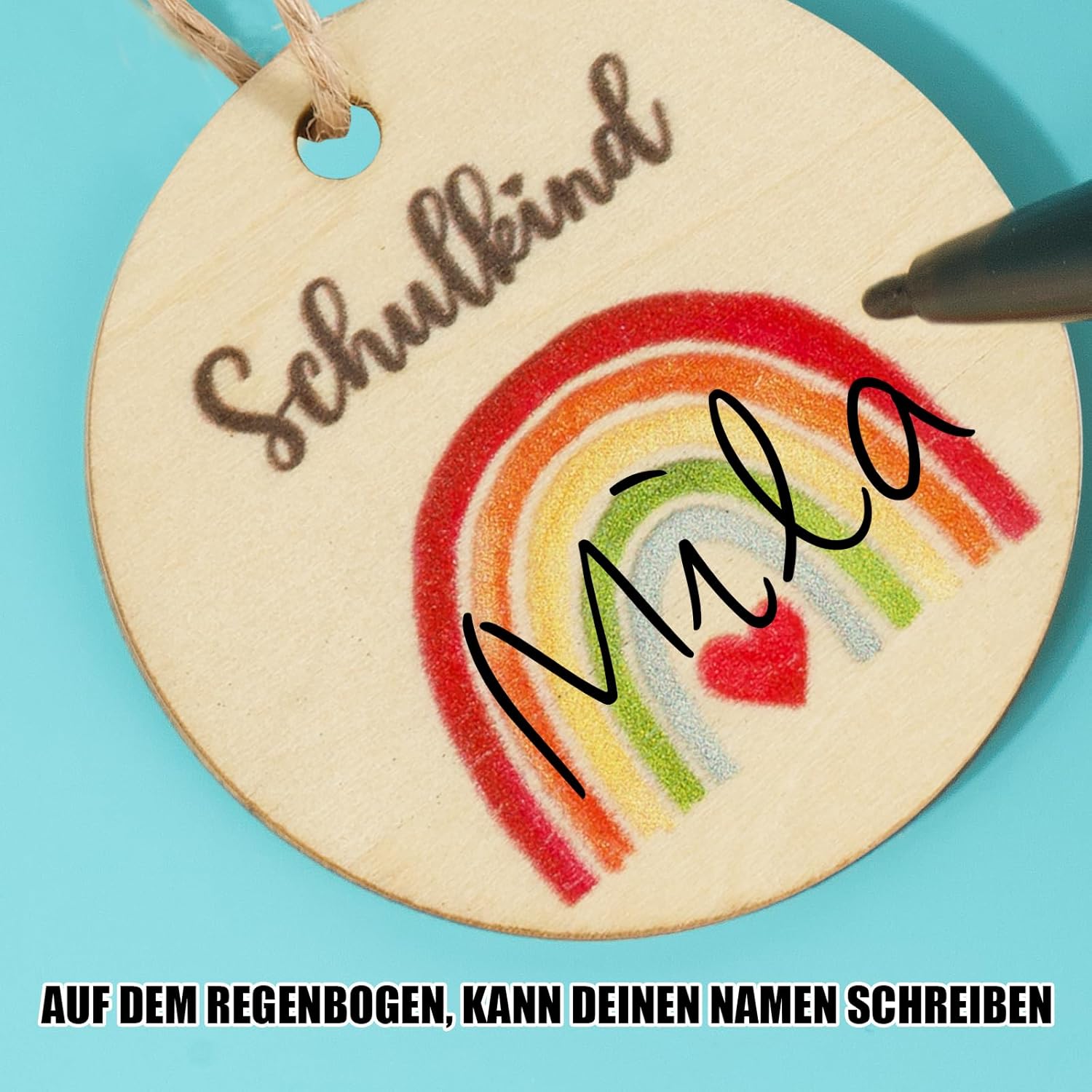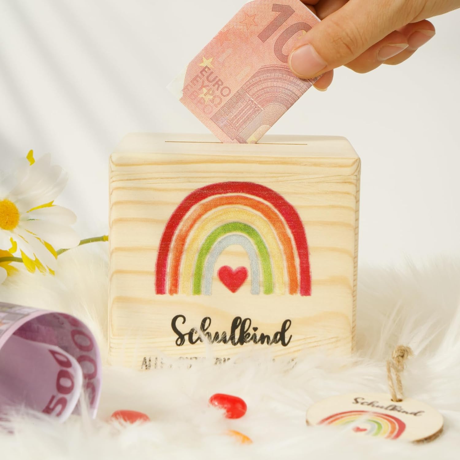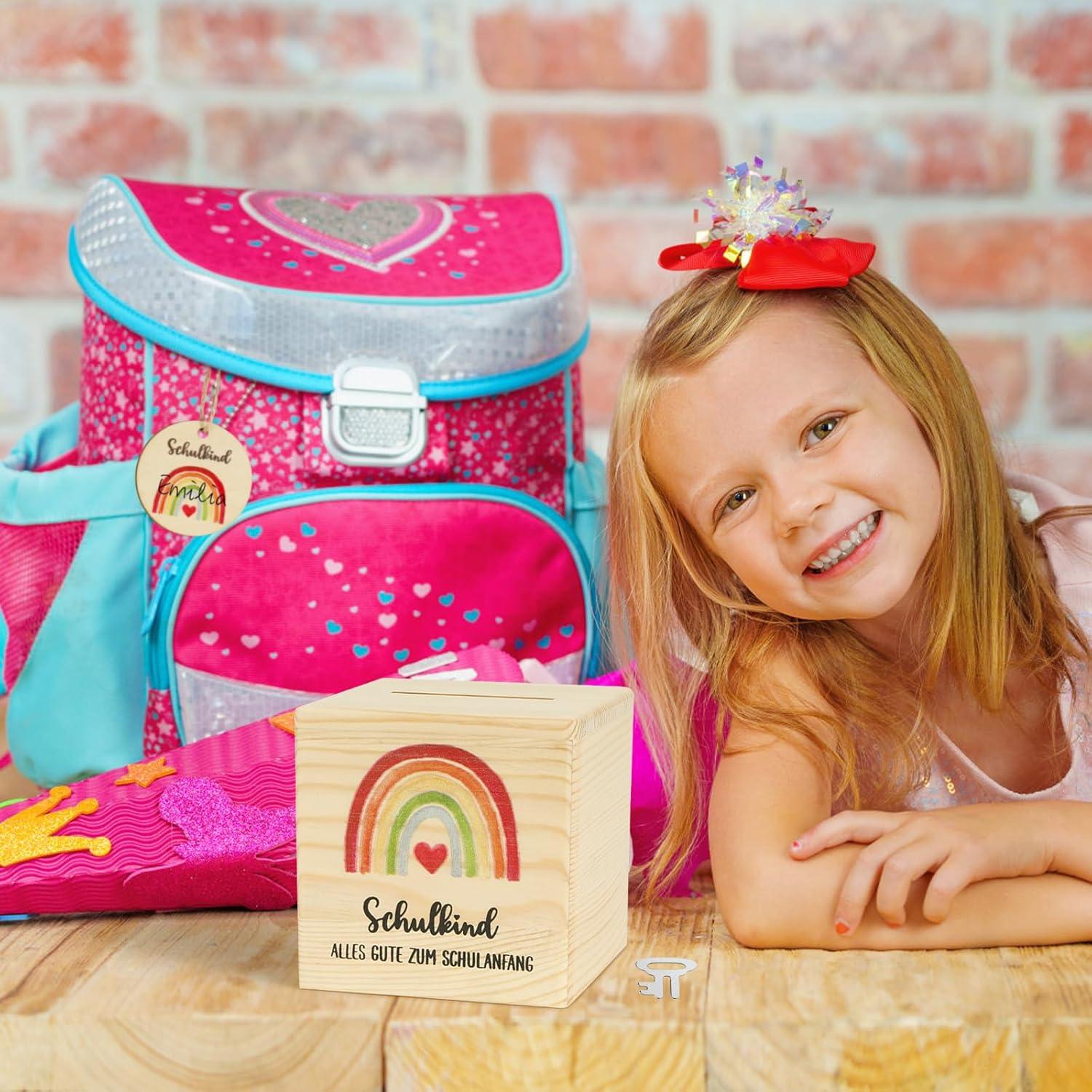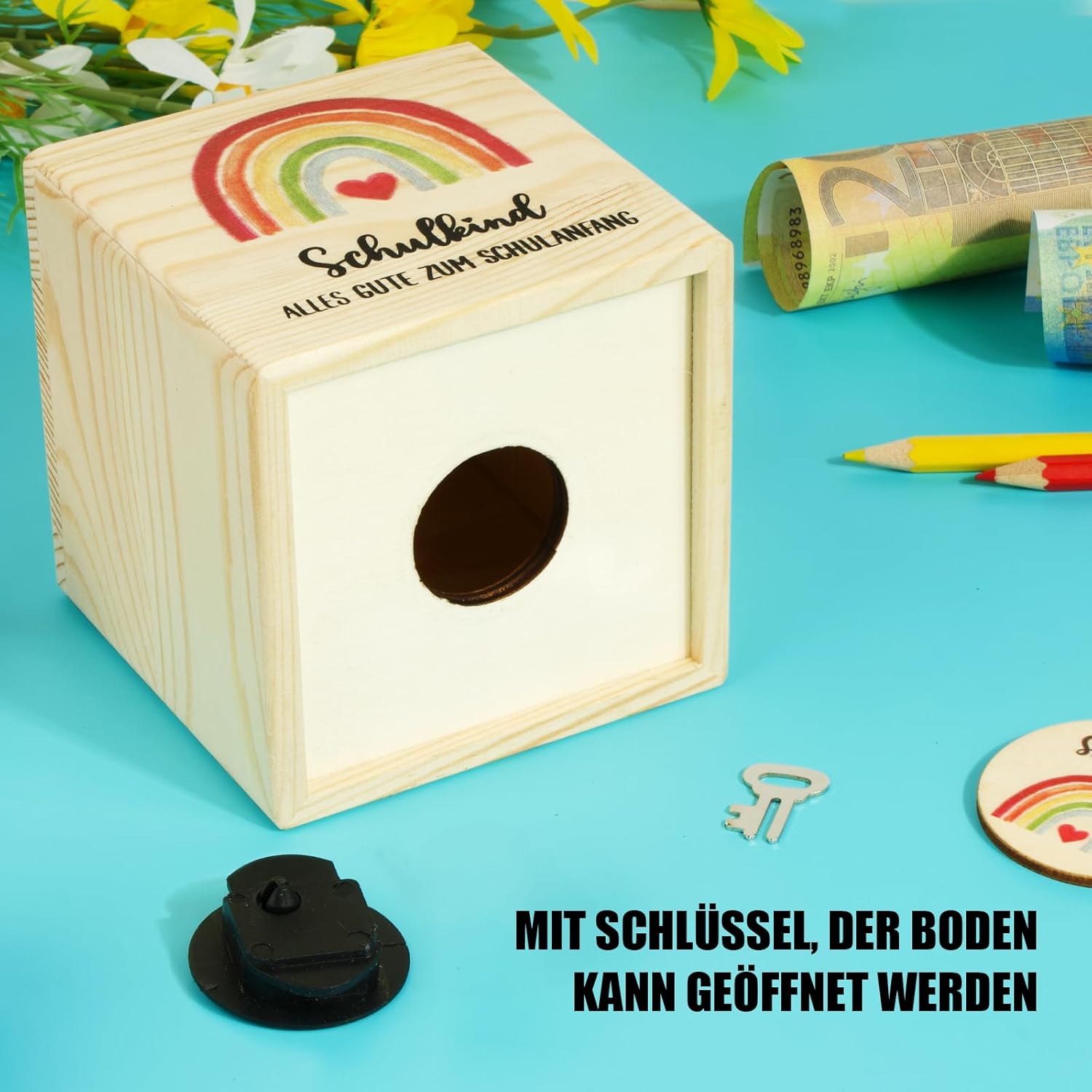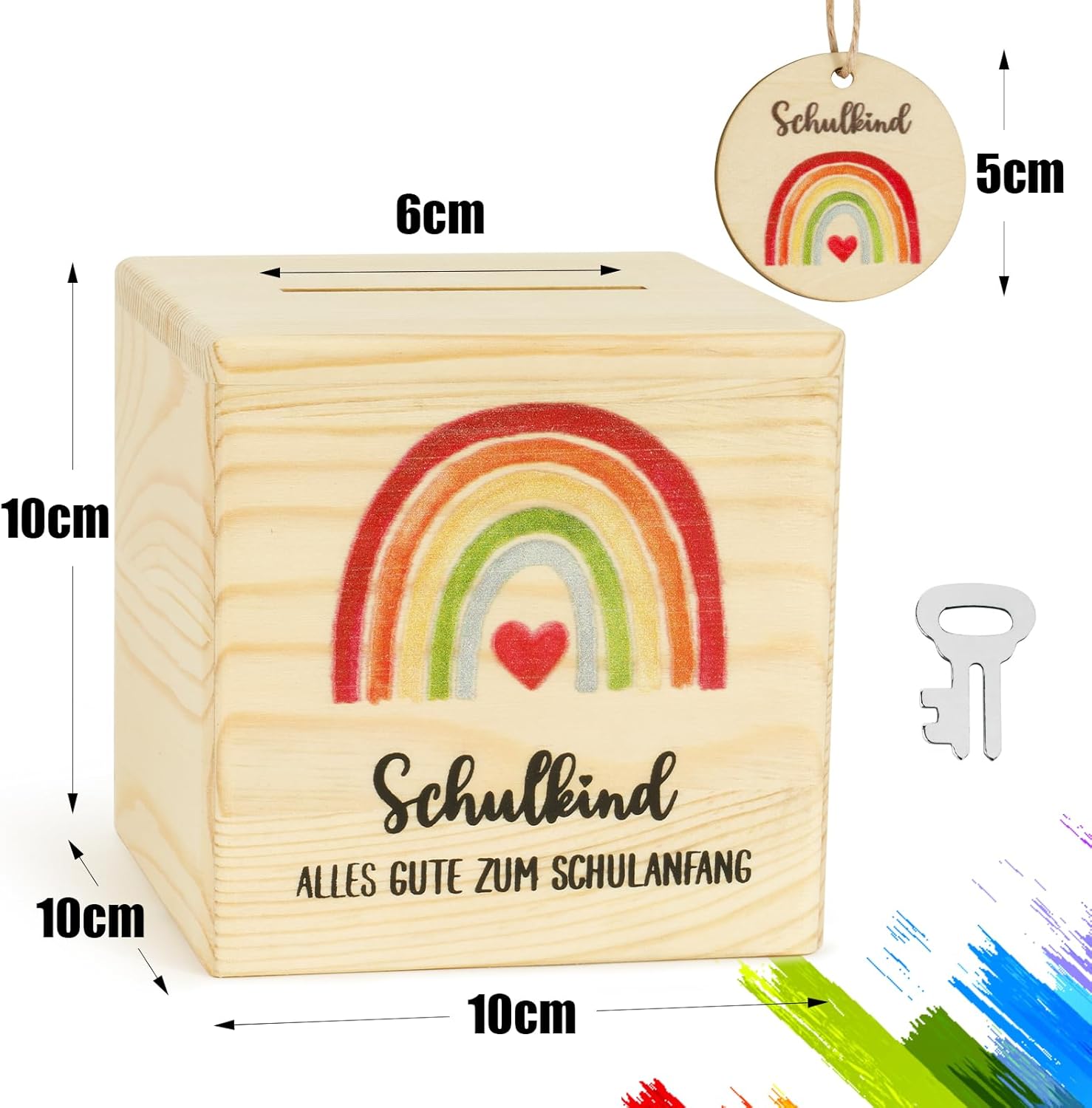 Fornitura: salvadanaio in legno per la scuola, targhetta in legno, chiave. Materiale: legno. Esecuzione squisita, stabile e durevole. Dimensioni: il salvadanaio misura 10×10×10 cm. Ciondolo in legno 5 cm. Salvadanaio per bambini con simpatico motivo arcobaleno, bambino in età scolare, stampato "Happy Back to School", sul salvadanaio è possibile scrivere nomi, date o il testo desiderato. Perfetto per i bambini in età scolare, per il ritorno a scuola, per l'iscrizione a scuola, per il primo giorno di scuola, come regalo per i bambini in età scolare.