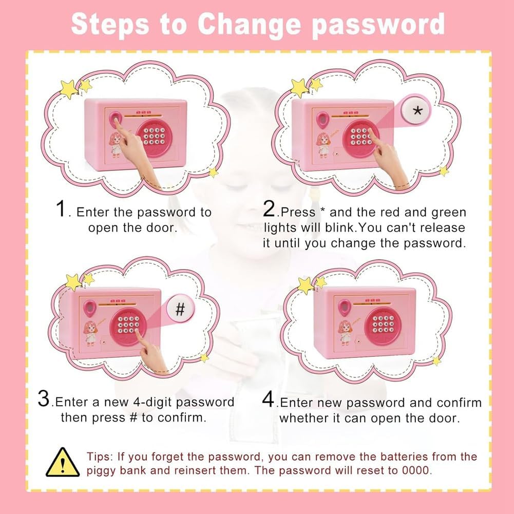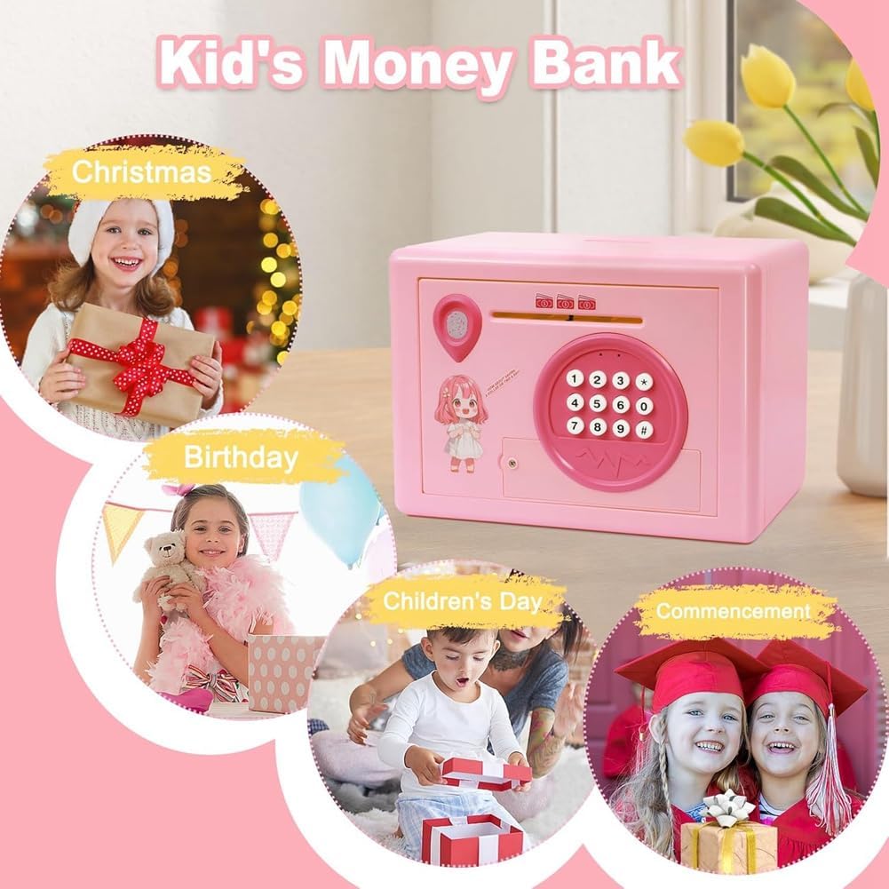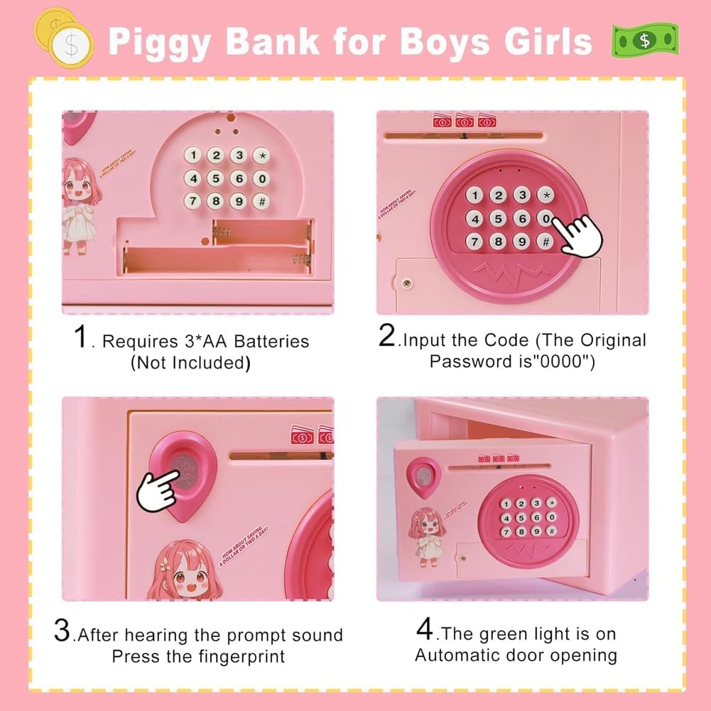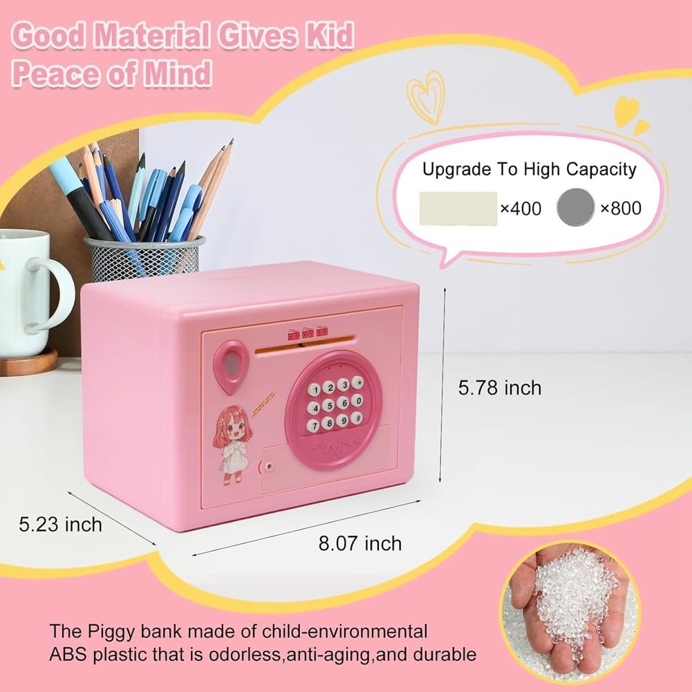 [Mini ATM]: le banconote sono allineate con la fessura per il contante, le tira automaticamente dentro come un mini ATM, rendendo il risparmio facile e divertente. Questa scatola di risparmio può contenere fino a 800 monete o 400 banconote, con ampia capacità per soddisfare tutte le esigenze di risparmio. [Salvadanaio multifunzione]: questo salvadanaio accetta contanti che monete e ha una funzione di protezione elettronica tramite password. Se viene inserita la password errata, verrà emesso un avviso. La porta si aprirà solo dopo inserito la password corretta di 4 cifre, quindi verrà eseguito il riconoscimento 'impronta digitale si accenderà la luce verde. (Password predefinita: 0000, personalizzabile). [Materiali di alta qualità]: questo salvadanaio è realizzato in plastica ABS, che è durevole, sicuro e inodore, con un design e non è facile da rompere. È una scelta divertente e sicura per i bambini. [Il giocattolo per bambini]: questo e versatile salvadanaio è più di un semplice giocattolo, è anche un compagno finanziario che aiuta i bambini a gestire i soldi. Non solo rende l'apprendimento divertente, ma favorisce anche la comprensione del valore del denaro, insegnando ai bambini le della gestione finanziaria. [Il regalo per bambini]: i bambini adoreranno ricevere questo fantastico e istruttivo salvadanaio. È ideale per l'interazione familiare e un regalo di compleanno perfetto, regalo di Natale o regalo di Capodanno per bambini dai 3 in su.