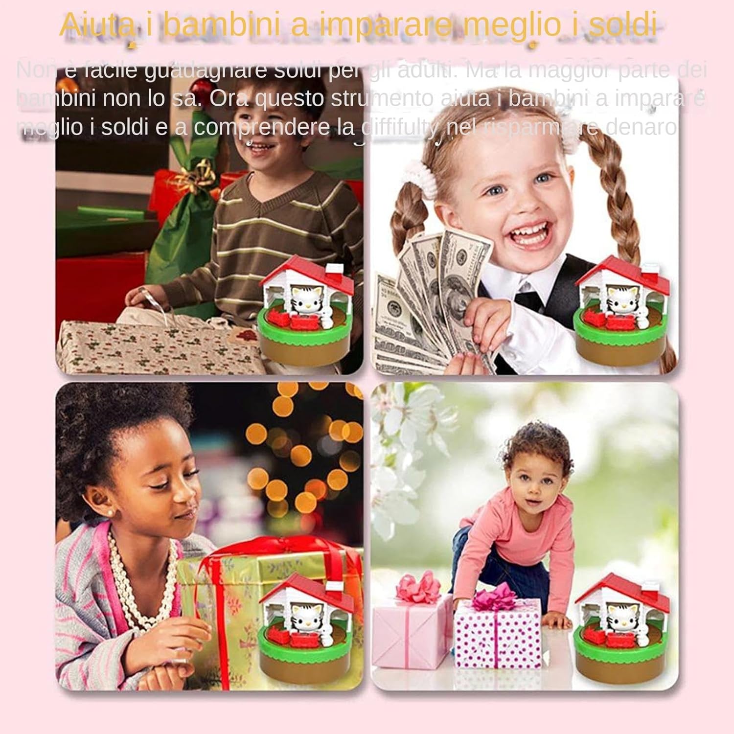 Gioco Interattivo Monete:Design coinvolgente con scorrimento automatico monete nella base: premendo il bottone rosso o inserendo una moneta, i topini si muovono sul percorso stimolando apprendimento e divertimento attraverso l'interazione tattile e visiva Concept Alla Moda: Prodotto progettato come casetta per gatti salvadanaio, integra creativamente la funzione di risparmio con un trenino di topini che consegna le monete rendendo divertente l'abitudine a conservare Design audio coinvolgente: audio interattivo con effetti sonori giocosi e brani musicali che catturano l'attenzione dei bambini, arricchito da simpatici miagolii per rendere il momento del risparmio più piacevole e divertente. Approccio Giocoso: Coinvolge le giovani menti nell'apprendimento del risparmio e della consapevolezza finanziaria con metodi ludici ma , migliorando in modo significativo la loro esperienza educativa quotidiana con semplicità Regalo : Salvadanaio ideale come premuroso per famiglia, colleghi o amici, unisce utilità e affetto. Ottimo per uso quotidiano o occasioni speciali, diventa un ricordo prezioso per chi lo riceve.