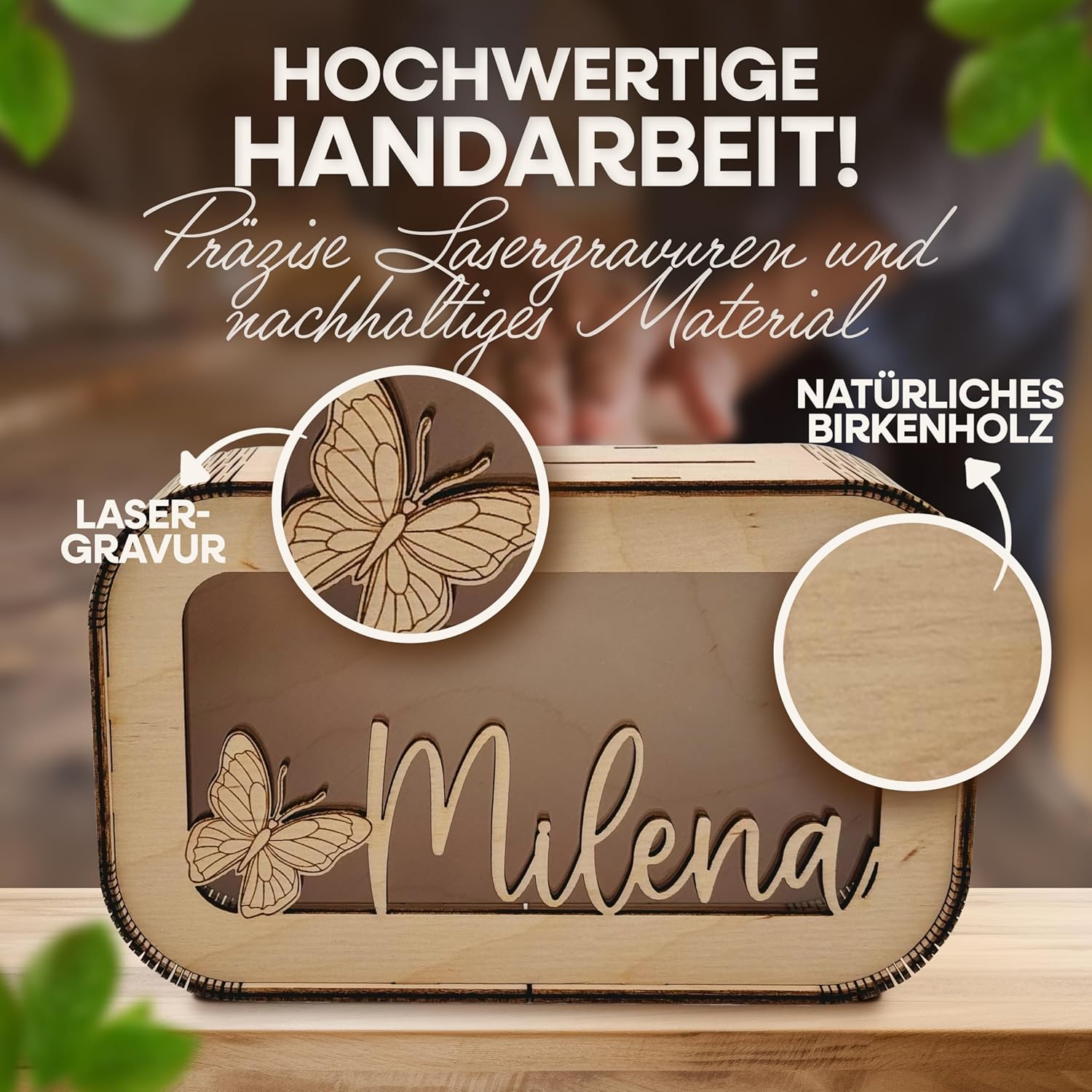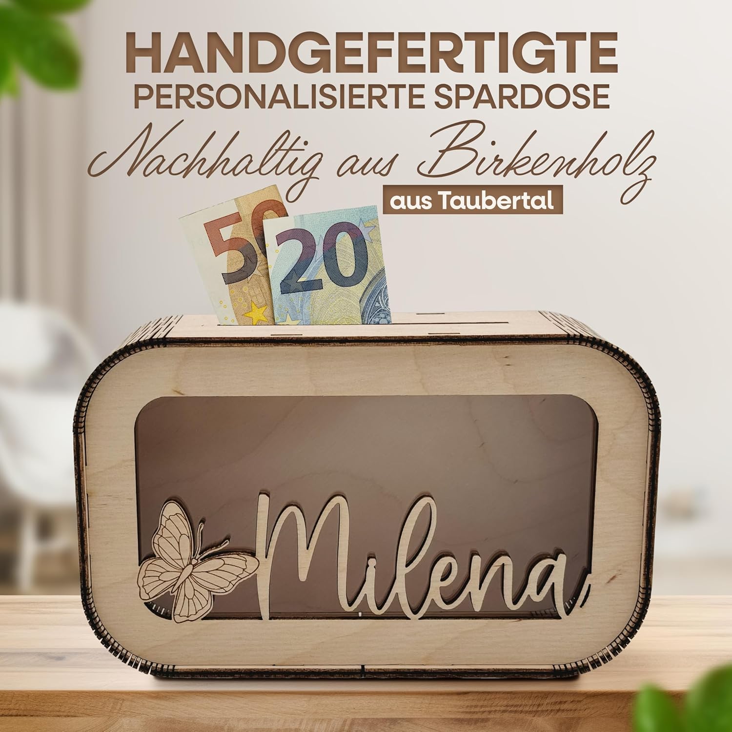 Il salvadanaio è progettato con un motivo allegro e adatto ai bambini ed è ideale come regalo per compleanni, battesimi, comunioni, Natale, Pasqua, inizio della scuola o inizio della scuola. Porta grande gioia sia alle ragazze che ai ragazzi di tutte le età. Grande valore: questo salvadanaio promuove l'esperienza sensoriale e il risparmio consapevole attraverso funzioni semplici e chiare. Con l'aiuto della finestra trasparente la comprensione del denaro è supportata attraverso il controllo visivo. Design unico: il salvadanaio per bambini può essere personalizzato con il nome del bambino e potete scegliere tra molti popolari motivi per bambini. In questo modo il salvadanaio si adatta perfettamente a ogni camera dei bambini, dei ragazzi e del soggiorno e attira l'attenzione in ogni stanza. Alta qualità: per la realizzazione del salvadanaio utilizziamo solo legno di betulla senza vernici e additivi nocivi e una finestra in acrilico per un utilizzo ecologico e duraturo. Qualità eccellente: Birdart Box è sinonimo di un eccellente rapporto qualità-prezzo e di alta qualità a prezzi equi. Questo prodotto è realizzato a mano in Germania. È pensato fin nei minimi dettagli e progettato con amore.