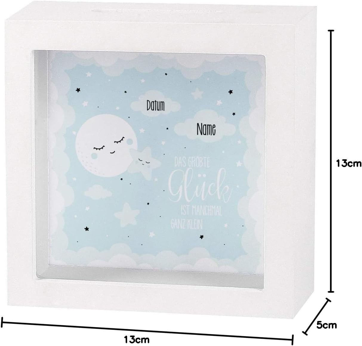 Regalo per la nascita - Se stai cercando un regalo per un bambino, è una buona idea fare un regalo in denaro, perché non sai se incontrerai il gusto dei tuoi genitori in fatto di tutine ecc. o se consegnerai l'ennesimo piumino. Regalo personale - I regali più belli per la nascita di un bambino sono sempre quelli che portano il nome del piccolo sole. Ecco perché stampiamo su questo salvadanaio i dettagli più importanti della nascita. Primo salvadanaio - Questo regalo in denaro per la nascita è ideale come primo salvadanaio. È bello e con la cornice bianca si adatta all'interno di ogni cameretta dei bambini e contribuisce alla decorazione. Informazioni utili - La cornice ha una dimensione di 13x13x5 cm (L/A/P). Nello spazio tra lo schienale e la lastra di vetro ci sono 4 cm di spazio, che potrebbero ospitare, ad esempio, un piccolo angelo custode. Modifica rapida - Inserisci semplicemente il nome del nuovo cittadino e le date di nascita sotto "Personalizza ora". Stampiamo e spediamo il bellissimo salvadanaio in pochi giorni.