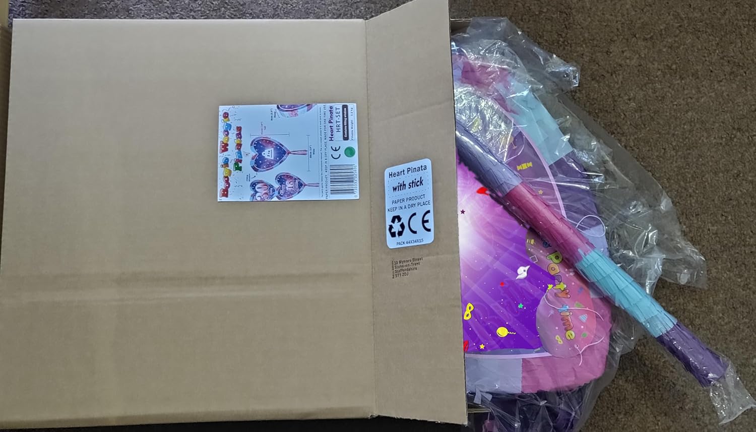 Questa pignatta a forma di cuore include un bastone e una benda abbinati. La pignatta è fatta di cartone e carta. Realizzato con colori perfetti da abbinare al tema delle feste da donna. rosa, viola e azzurro. La pignatta contiene una finestra per il riempimento. La pignatta è vuota e può essere riempita con dolci o mini sorprese. Peso di riempimento consigliato: 1-2 kg. La pignatta è alta 41 cm e larga 38 cm. È profondo 9 cm dai lati. Spazio sufficiente per aggiungere 1-2 kg di sorprese. Il bastone è lungo 50 cm ed è realizzato in materiale leggero. È facile da tenere e adatto anche per bambini e adulti. La benda è un ritaglio di carta o fatto di carta. È fatto per un uso una volta. Se i bambini indossano la benda, il gioco del colpo durerà più a lungo. Questa è una pignatta e un bastone è fornito per romperlo. La carta da appendere sotto la pignatta è a scopo decorativo. Si prega di notare che la carta da appendere o le nappe non sono cordini. Le foto mostrano la parte anteriore e posteriore della pignatta. Ogni lato ha un design leggermente diverso. Entrambi i lati mostreranno lo stesso testo in colori diversi. La pignatta è avvolta in un sacchetto di plastica. Sarà confezionato in una scatola di cartone resistente per arrivare in sicurezza.