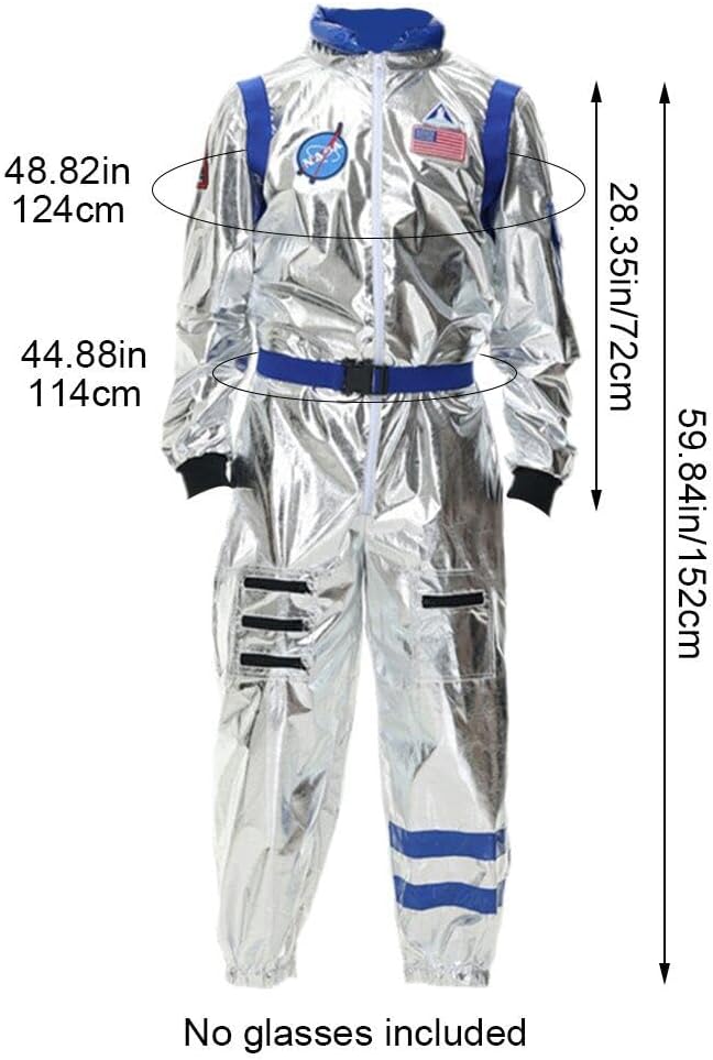 Specifica: Materiale: poliestere. Colore: argento. Dimensioni: Petto: 48,82 pollici/124 cm Vita: 44,88 pollici/114 cm Lunghezza: 59,84 pollici/152 cm Lunghezza manica: 28,35 pollici/72 cm Incluso: 1 pezzo * Costume da astronauta