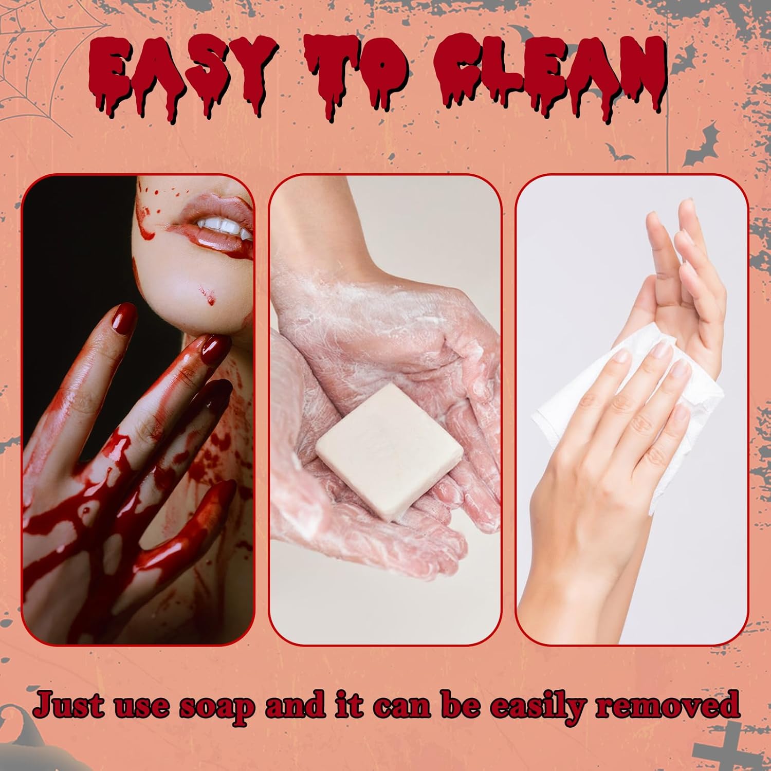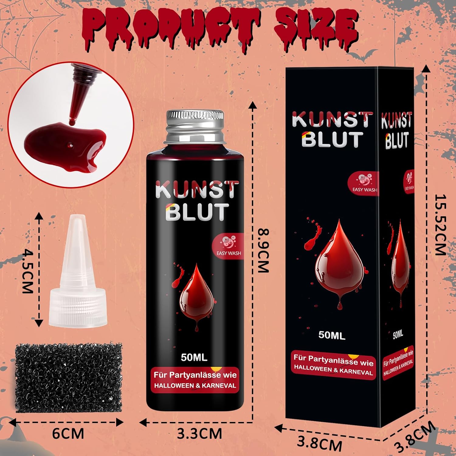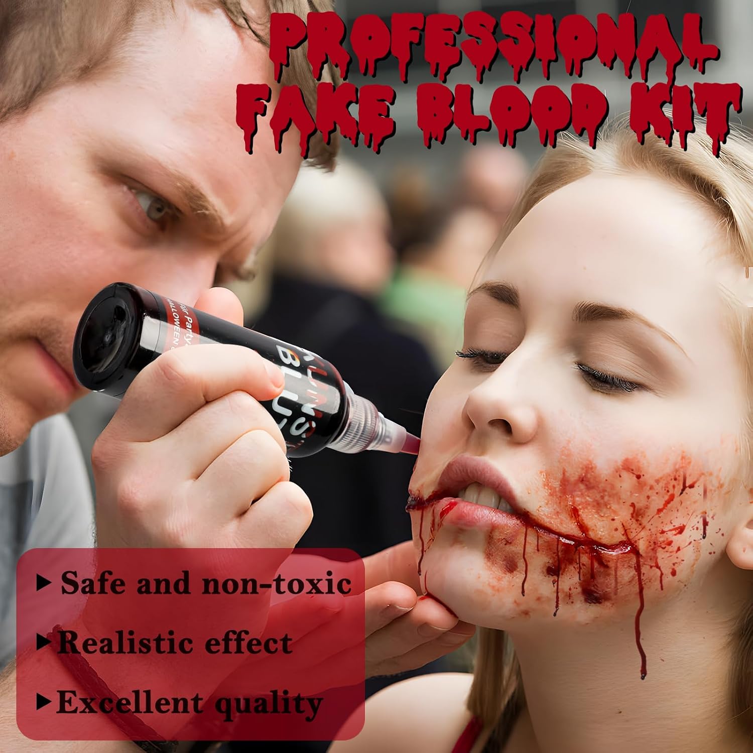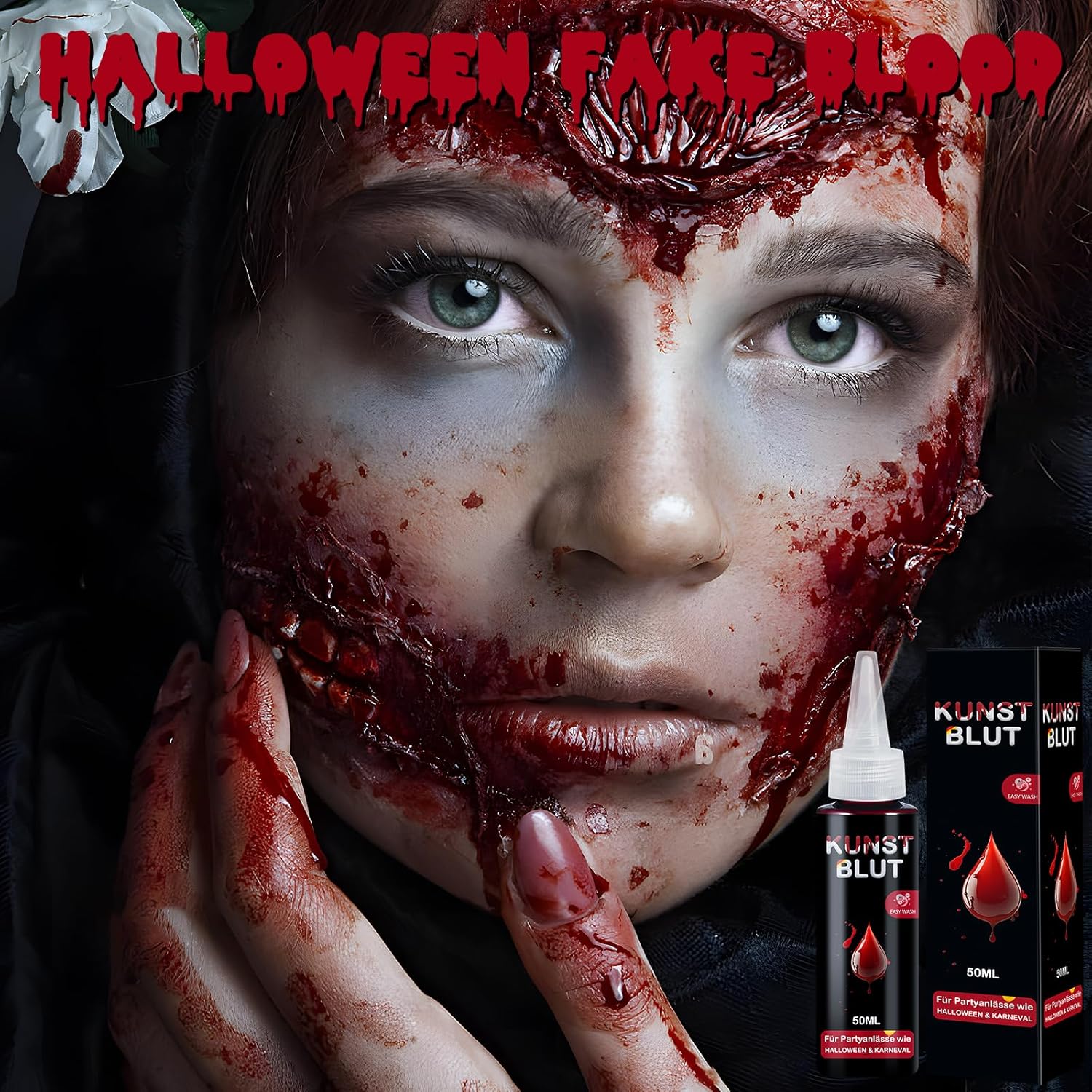 🩸【Sangue finto realistico】 Il nostro set di sangue finto di Halloween contiene: 50 ml di sangue finto + 1 spugna spessa + punta appuntita. Il sangue finto può essere spremuto per creare un effetto realistico di sangue che scorre ed è perfetto per creare una serie di ferite raccapriccianti se usato con una spugna. Sangue finto Può simulare lesioni sul viso, sul corpo, sugli oggetti di scena e sui vestiti, soddisfacendo pienamente le tue esigenze di sangue finto. 👻【Ingredienti sicuri】Il nostro sangue finto realizzato con materiali sicuri, non tossici e di alta qualità, è innocuo per la pelle, non irrita, non lascia residui e può essere applicato direttamente sulla pelle. Si consiglia un test cutaneo dietro l'orecchio prima dell'uso. Fai attenzione quando lo usi intorno agli occhi e alla bocca ed evita di metterlo negli occhi o nella bocca. 🎃 【Facile da usare】 Collega la punta inclusa e puoi facilmente spremere il sangue finto per creare un effetto sangue a flusso libero. Applicare sulla pelle con una spugna e la punta delle dita per creare abrasioni e una consistenza realistica della ferita. 🧽 【Facile da pulire】 Il sangue finto può essere facilmente rimosso con acqua tiepida e sapone. Se è presente ancora del pigmento, rimuoverlo con uno struccante. Il sangue finto sugli indumenti può essere facilmente rimosso immergendolo in detersivo e acqua tiepida per un'ora. 🤡【Ampia applicazione】Il sangue finto di Halloween è adatto per Halloween, carnevale, cosplay, feste in costume, sposa zombie, costume da clown, vampiro e altre attività. È un must per gli amanti di Halloween, degli effetti speciali e della simulazione dei traumi. Sangue finto di Halloween Può essere applicato su viso, corpo e vestiti e utilizzato per trucco, oggetti di scena e scene.