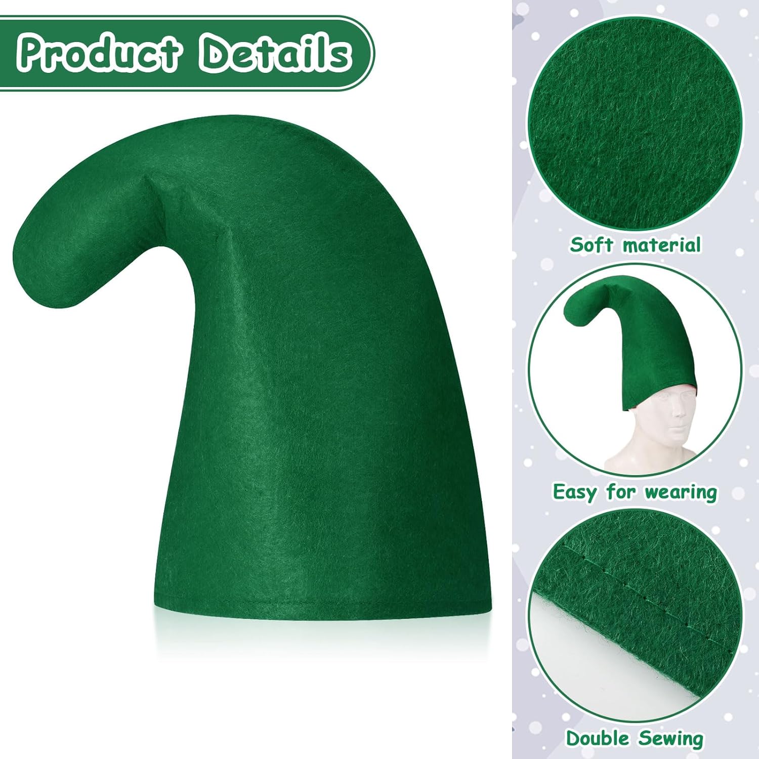 Preso per Natale per travestirci da "elfi", in realtà sembra più un cappello da nano. La qualità è un po' deludente: si tratta semplicemente di un foglio di feltro sagomato e cucito ai bordi, pertanto anche la vestibilità ne risente. Non sta su bene come nel signore della foto. Infine, poteva essere buono per travestirsi in gruppo da "7 nani", ma curiosamente dentro ce ne sono solo 6