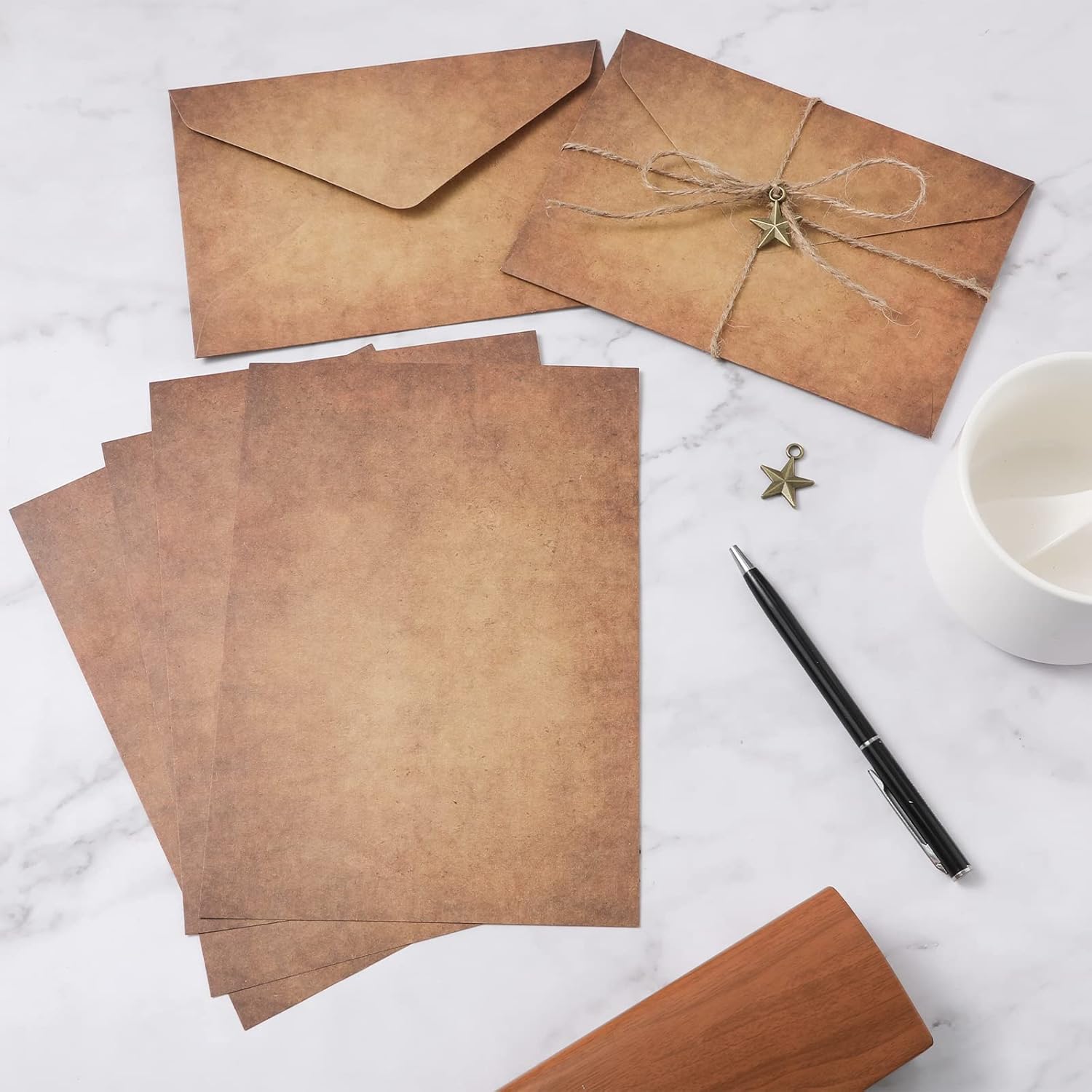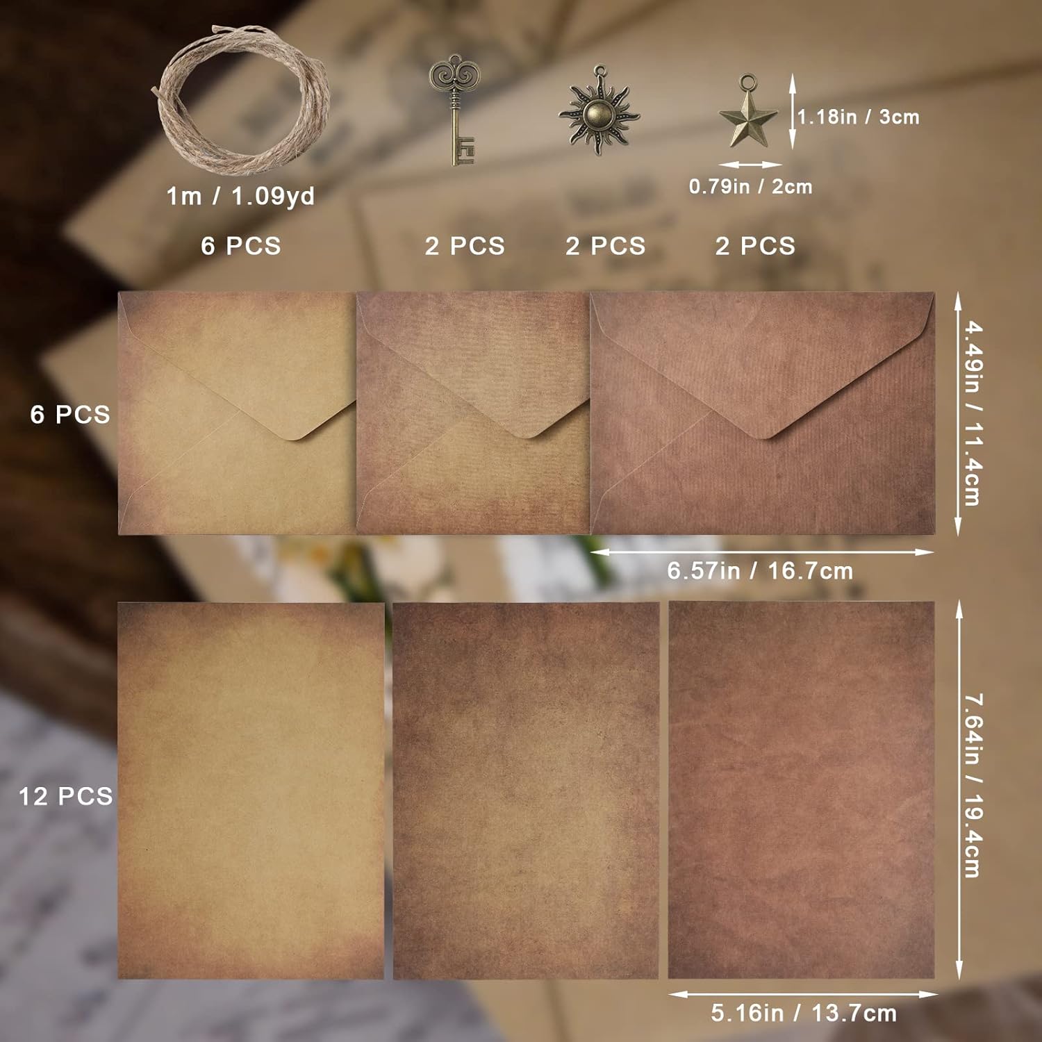 Contenuto del pacchetto: riceverai buste antiche da 6 pezzi, carta da lettere vintage da 12 pezzi, corde di canapa da 6 pezzi per sigillatura e ciondoli vintage da 6 pezzi (con 3 stili), totalmente 30 pezzi.La quantità sufficiente e la collocazione perfetta possono soddisfare le tue esigenze di scrittura. Dimensioni: i documenti anziani misurano circa 19,4x13,1 cm, le antiche buste misurano circa 16,2x11,4 cm e ogni corda di canapa misura circa 1 m di lunghezza.Si prega di controllare attentamente le dimensioni dei nostri prodotti prima di acquistare. Alta qualità: la nostra carta e buste vintage sono realizzate in carta kraft premium, piatta e liscia, spessa e robusta, difficile da strappare e confortevoli da scrivere.I ciondoli vintage sono realizzati in metallo di qualità, robusti e durevoli. Design classico invecchiato: le nostre buste antiche e set di carta sono stampate in carta Kraft vintage, che sembra molto squisita e può offrirti un'esperienza usando.Anche i ciondoli antichi metallici decorano meglio le buste. Versatile: le buste antiche e i set di carta sono ampiamente usati per la scrittura di lettere, inviti di nozze, inviti per feste, biglietti di auguri, estratti di poesie, eleganti estratti di testo, ecc. Le tue parole e testi in questi buste e documenti vintage possono portare una profonda impressione per i tuoiamici o familiari.