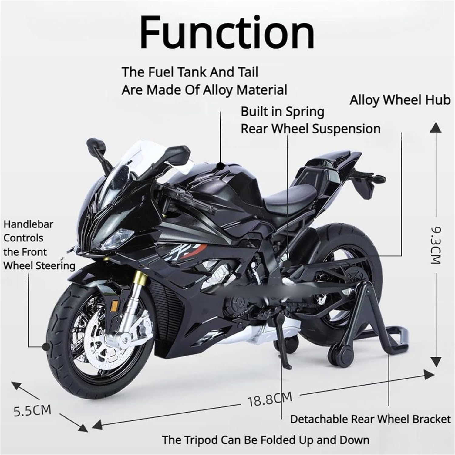 Modellini di moto giocattolo in scala 1:12 per S1000RR S 1000 RR Modello di auto di simulazione, simula l'effetto di una vera motocicletta, la maniglia della motocicletta può essere collegata alla ruota anteriore per le svolte a sinistra e a destra. Il treppiede può essere retratto e abbassato, dotato di una staffa per la ruota posteriore e può essere smontato liberamente. La combinazione di materiale in lega di zinco e materiale ABS è sia resistente che leggera, rendendo più facile giocare con i modelli di auto. Modello di moto Realizzato in resistente lega di zinco, è resistente alle cadute e all'usura, garantendo la durevolezza del modello e la sua lunga conservazione. La finitura della vernice è uniformemente liscia, con colori vivaci e duraturi che resistono allo sbiadimento e alle scheggiature, garantendo un aspetto costantemente brillante.