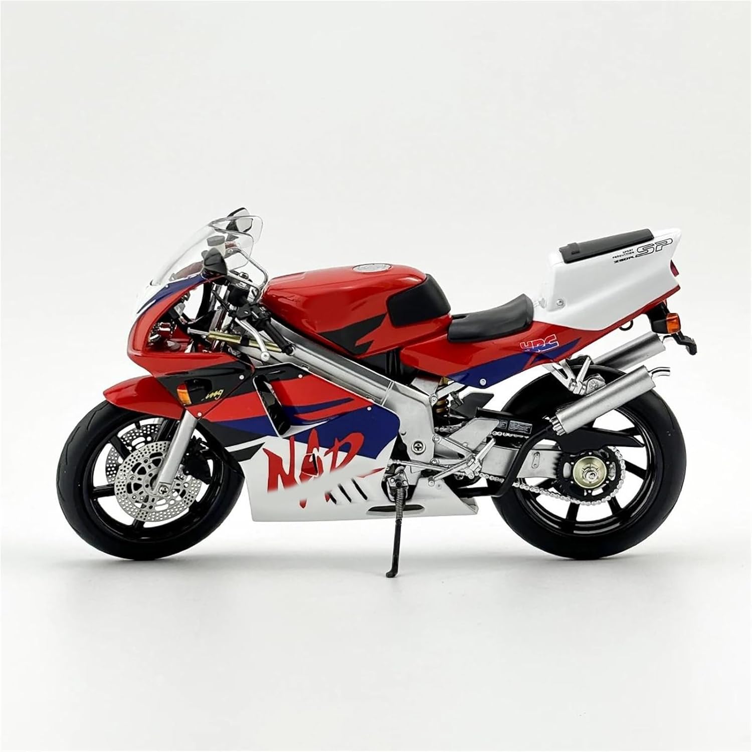 Modello di motocicletta per NSR 250R SP Fire Chariot Modelli di auto giocattolo per motociclette 1:12, caratteristiche: materiale in lega, può essere girato! Contenuto della confezione: modello di auto * 1 Il modello di motocicletta è un modello squisito realizzato in stretta conformità con la forma, la struttura, il colore, gli interni e altre proporzioni del veicolo originale. È un modello in miniatura del veicolo originale ed è progettato per riprodurre l'aspetto del veicolo originale. Modello di motocicletta in lega di simulazione La finitura liscia e senza sbavature e la vernice lucida e uniforme dimostrano una maestria artigianale eccezionale. Questo modello incarna lo stile di una motocicletta, soddisfacendo l'amore degli appassionati per i modelli nostalgici.