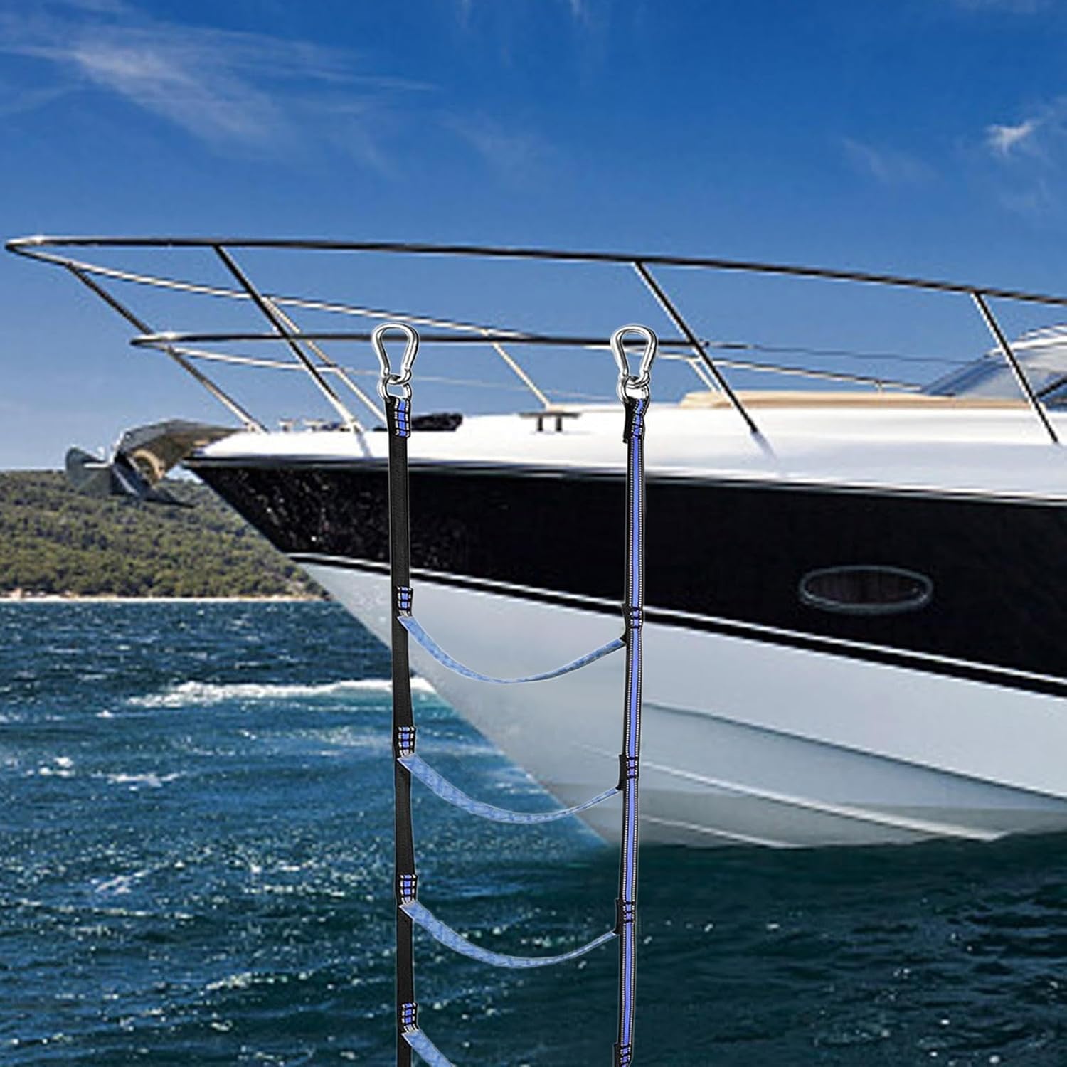 Uso ottimale dello spazio: la struttura pieghevole ben congegnata della scala della barca supporta un'applicazione flessibile e una conservazione salvaspazio, facile da usare senza attrezzi o attrezzature aggiuntive Versatilità affidabile: ottimizzata per la pesca e gli sport acquatici, fornisce un supporto sicuro per la posa in acque poco profonde e il nuoto indietro senza sforzo per un'esperienza avanzata in barca Facile accesso: ganci rinforzati e senza passaggi complicati garantiscono un facile fissaggio, mentre il sistema di cinghie regolabili consente un posizionamento regolabile per prestazioni migliori Integrazione affidabile: resiste anche in condizioni mutevoli. Garantisce un imbarco sicuro grazie alla comprovata funzione di pioli e una facile integrazione nella configurazione. Elevata capacità di carico: la tecnica di tessitura multistrato riduce l'abrasione del materiale e mantiene costante il carico di pressione. Il modello antiscivolo integrato garantisce a lungo termine salire e scendere dalla barca.
