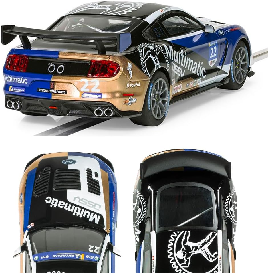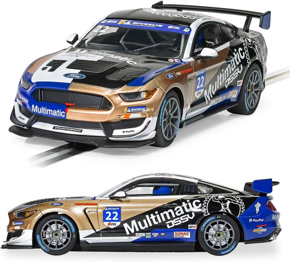 Slot car Scalextric: il campionato canadese GT 2021 ha visto questa Mustang GT4 dalla livrea sorprendente partecipare al team Mulitmatic; questa vettura si è rivelata una forte contendente nel campo GT e ha ottenuto alcuni ottimi risultati, aggiungila ora alla tua flotta di muscle car Scalextric Magnatrazione: i magneti situati nel telaio forniscono ulteriore carico aerodinamico, aiutano a mantenere l'auto in pista durante le corse ad alta velocità e impediscono alla parte posteriore dell'auto di slittare lateralmente e schiantarsi Auto resistenti: carrozzeria monopezzo ottimamente robusta, costruita per durare utilizzando materiali durevoli di ottima qualità e abbastanza resistenti da resistere alle corse a pieno impatto Cosa è incluso: 1x Ford Mustang GT4; l'auto viene fornita con un foglio di adesivi che ti permette di decorarla e personalizzarla se lo desideri