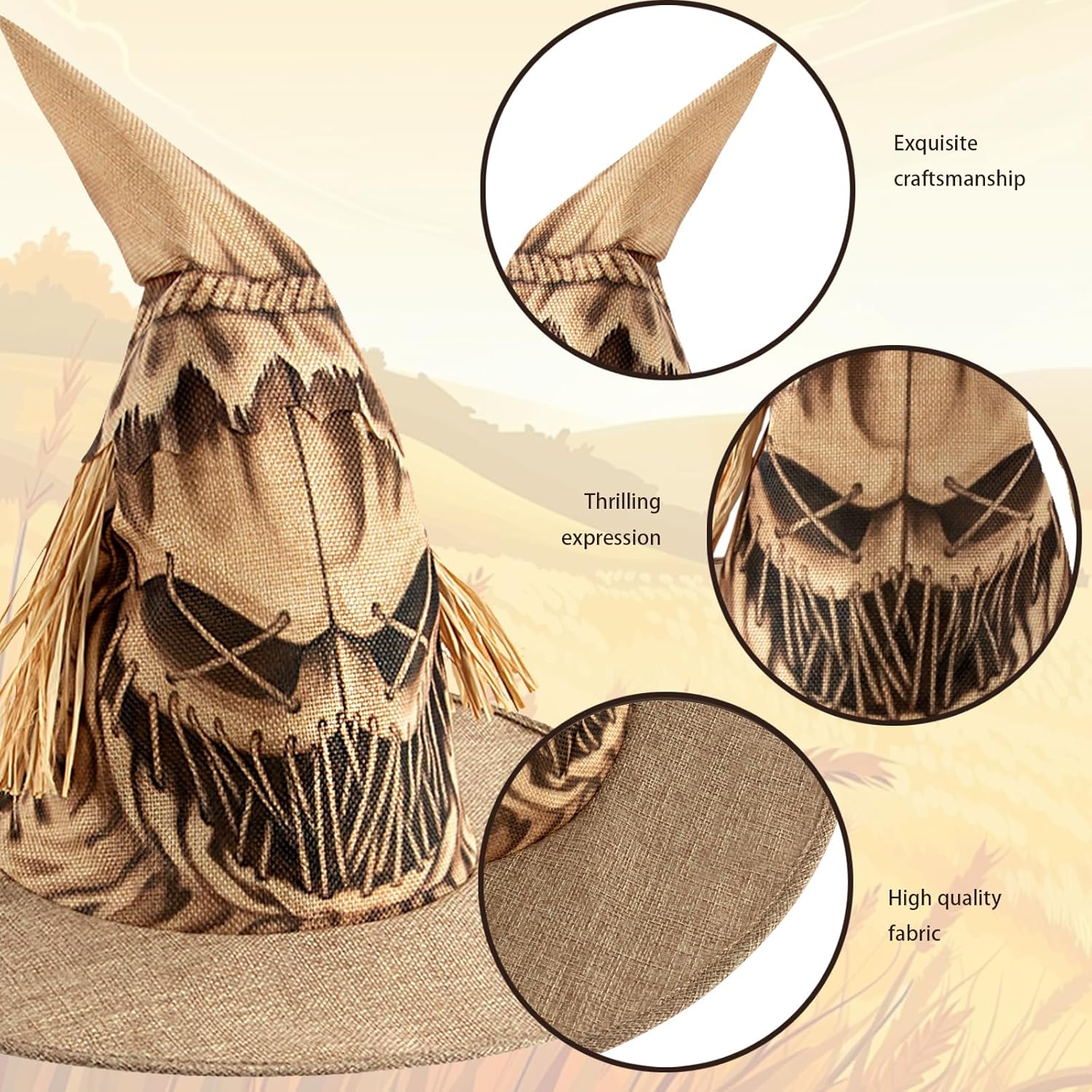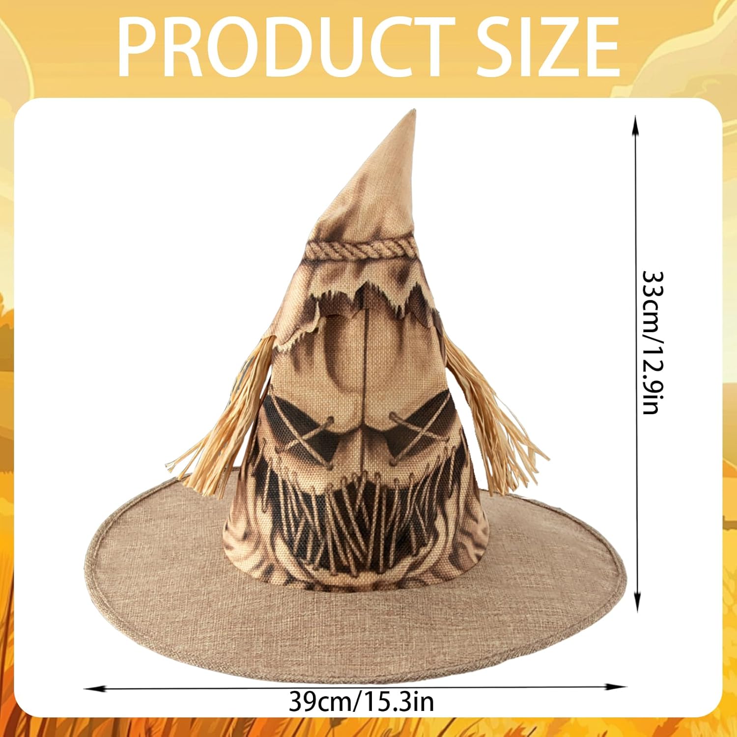 Funzione: 1.Realizzato in tessuto morbido e traspirante, il Scarecrow Witch Hat è leggero e facile da indossare per lunghe ore. 2.Il Scarecrow Witch Hat pieghevole consente di risparmiare spazio. Pulire con un panno umido o lavarlo a mano, quindi asciugare all'ombra: questo garantisce una qualità duratura senza troppi sforzi. 3.Elegante con la sua tradizionale forma appuntita e le texture rustiche, questo Cappello da Strega Spaventapasseri aggiunge fascino a festival autunnali, eventi a tema o feste in campagna con un look accogliente e ispirato alla fattoria. Specifica: Materiale: Lino Colore: Marrone Dimensioni: 39 x 39 x 33 cm Elenco prodotti: 1 x Scarecrow Witch Hat Osservazioni: 1.A causa dei diversi monitor e degli effetti di luce, il colore effettivo dell'articolo potrebbe essere leggermente diverso dal colore mostrato nell'immagine. 2.A causa della misurazione manuale, Potrebbero esserci lievi deviazioni nella misurazione, per favore capisci.