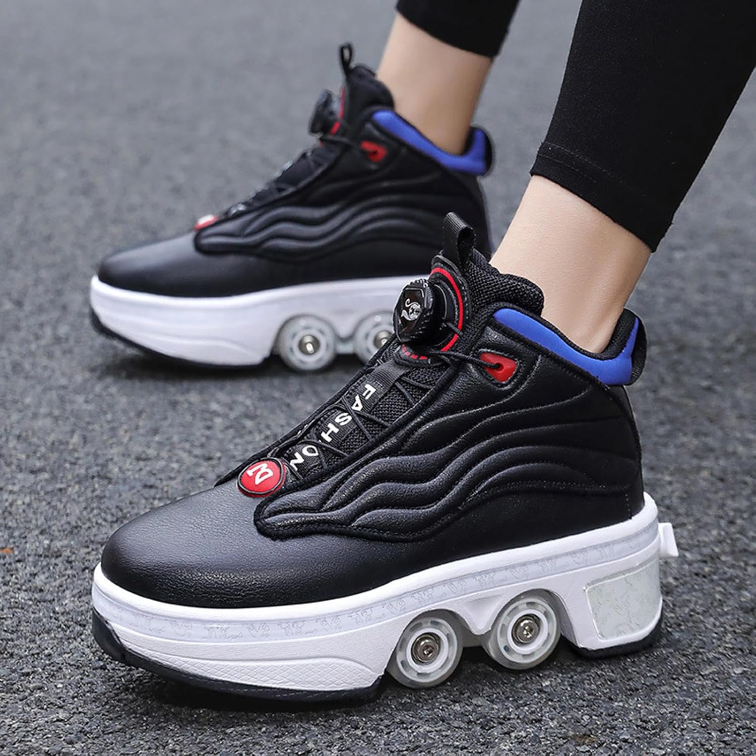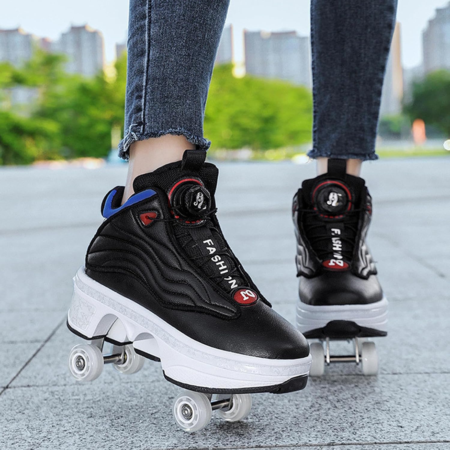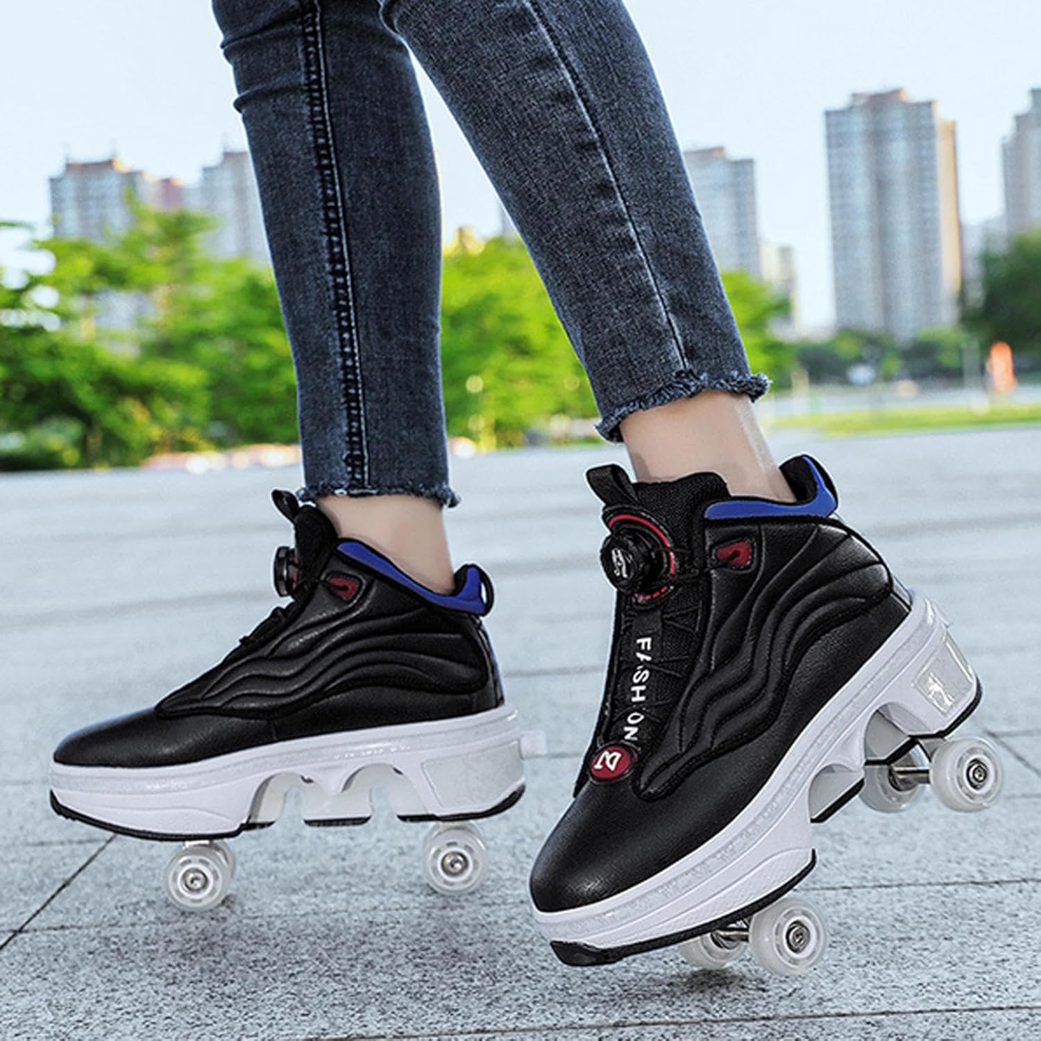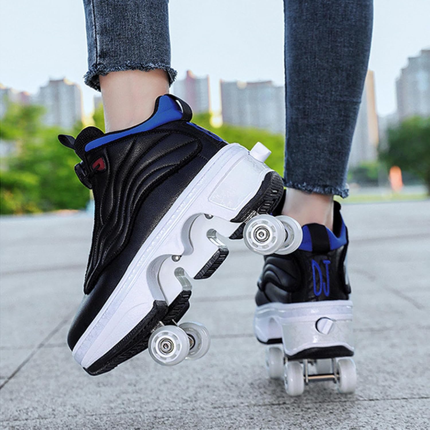 Materiali di alta qualità: la tomaia in microfibra di alta qualità è resistente agli strappi e più stabile, abbinata a un design a foro denso e traspirante, confortevole e traspirante, disperde efficacemente il calore e durevole senza rigidità. Intersuola in EVA con design della suola in gomma, ammortizzazione leggera, resistente all'usura e antiscivolo. Durevole e robusto: realizzato con ruote per infusione in PU, elevata resistenza all'usura, elevata elasticità, prestazioni di scorrimento stabili e di lunga durata. Telaio in acciaio ricamato, più stabile, portante fino a 100 chilogrammi. Pattino a rotelle due in uno: questo è un pattino a rotelle multifunzionale che combina camminata, pattinaggio e sport. Con un solo calcio si trasforma in carrucola e poi di nuovo in scarpa sportiva. È versatile e comodo da usare per bambini e principianti. Selezione della taglia: la nostra taglia è una taglia standard, puoi scegliere la taglia appropriata in base alla tabella delle taglie, si consiglia di scegliere in base alla tua situazione attuale. Se i tuoi piedi sono leggermente più larghi, si consiglia di scegliere una taglia più grande. Se preferisci indossare scarpe larghe, ti consigliamo di scegliere anche una taglia più grande. Regalo ideale: questo è un pattino sportivo molto interessante, alla moda e innovativo, con praticità, sicurezza, comfort e significato educativo. È un'attrezzatura sportiva ricreativa per adolescenti e bambini e anche il regalo perfetto per la famiglia e gli amici.
