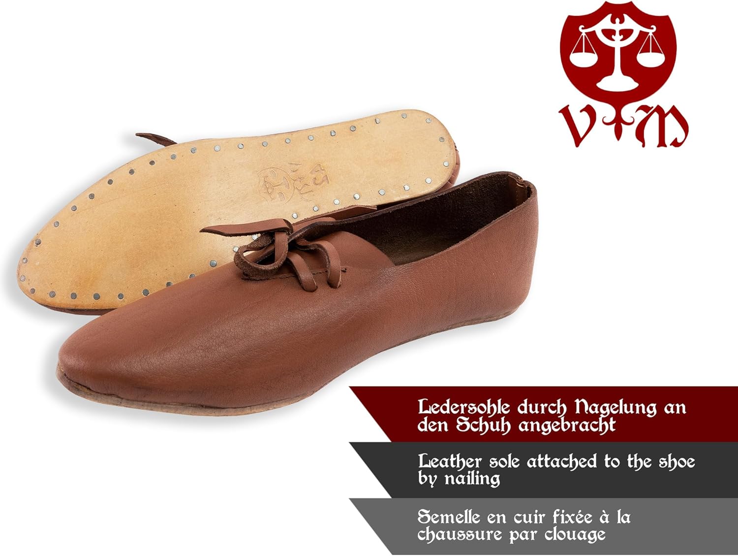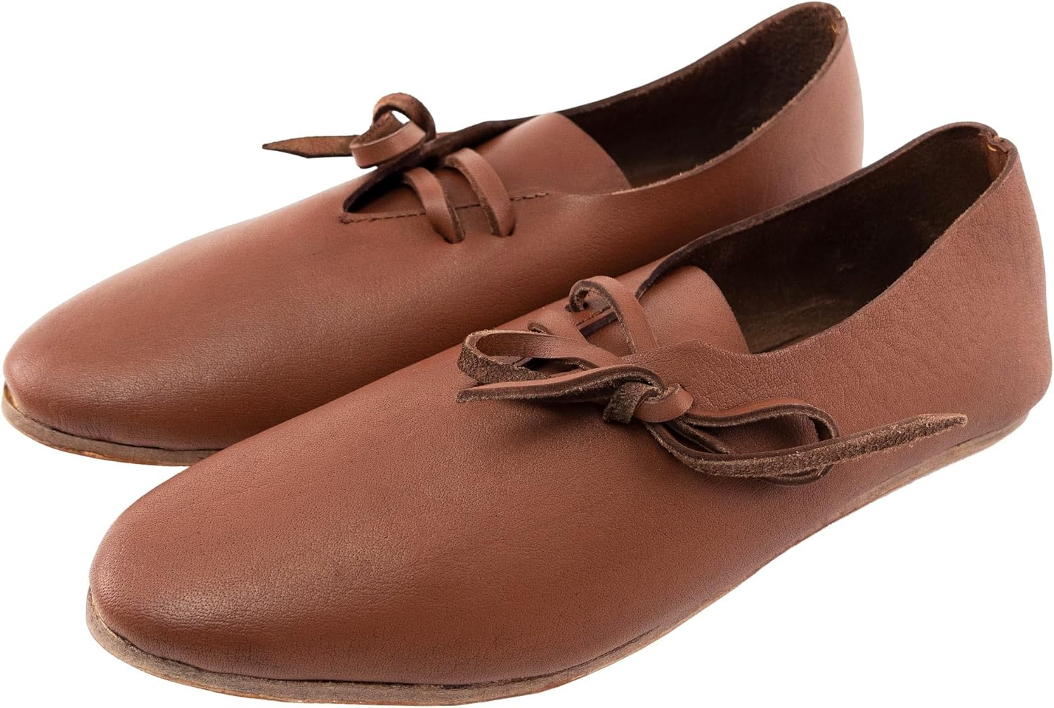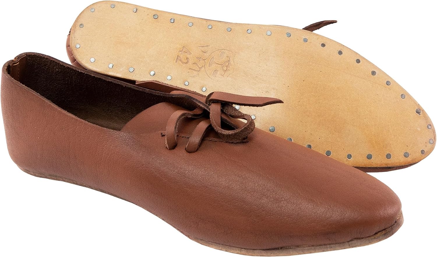 Scarpe basse alte e tardo medievali con lacci Le scarpe basse con allacciatura venivano indossate volentieri nell'alto e nel tardo Medioevo. Le scarpe erano solo alte alla caviglia e per lo più correvano appuntite davanti. Come scarpe di tutti i giorni o da lavoro, erano per lo più semplici e semplici, ma comunque robuste lavorate per durare a lungo. Le nostre scarpe medievali con lacci sono realizzate in pelle bovina, hanno una soletta interna in pelle e all'esterno una suola spessa che è stata inchiodata. Sulla parte anteriore è presente un'allacciatura con 2 fori su ciascun lato per adattare le scarpe medievali al proprio piede. L'allacciatura dovrebbe essere serrata inizialmente in modo che tu sia piatto all'interno della scarpa. Dettagli scarpe medievali con lacci: Materiale esterno: pelle Soletta: pelle Suola: pelle Spessore della tomaia: circa 2 mm. Spessore della suola: circa 5 mm. Colore: marrone scuro. Proiezione: si consiglia di utilizzare le scarpe in casa (non all'aperto) circa 10-15 minuti. Le scarpe in pelle potrebbero sentirsi piuttosto strette al primo momento, il che è anche normale. Dopo questo breve periodo di utilizzo, la pelle inizia a diventare leggermente più morbida e si ottiene una sensazione più confortevole. Taglia scarpa: le scarpe vestono normalmente, quindi la taglia abituale della scarpa da strada dovrebbe essere adatta. Tuttavia, questo è solo una raccomandazione, poiché fattori di influenza come solette, calze spesse, un piede largo, ecc. svolgono un ruolo in questo. Per i piedi molto larghi si consiglia di prendere una taglia più grande. Contenuto della confezione: 1 paio di scarpe medievali con lacci.