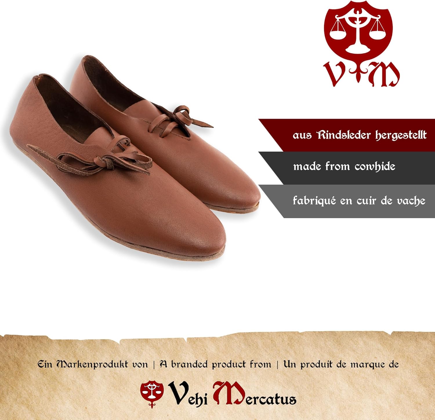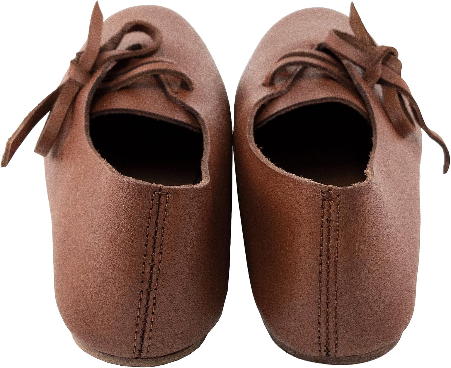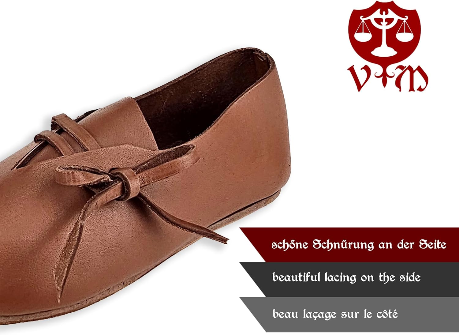 Scarpe basse alte e tardo medievali con lacci Le scarpe basse con allacciatura venivano indossate volentieri nell'alto e nel tardo Medioevo. Le scarpe erano solo alte alla caviglia e per lo più correvano appuntite davanti. Come scarpe di tutti i giorni o da lavoro, erano per lo più semplici e semplici, ma comunque robuste lavorate per durare a lungo. Le nostre scarpe medievali con lacci sono realizzate in pelle bovina, hanno una soletta interna in pelle e all'esterno una suola spessa che è stata inchiodata. Sulla parte anteriore è presente un'allacciatura con 2 fori su ciascun lato per adattare le scarpe medievali al proprio piede. L'allacciatura dovrebbe essere serrata inizialmente in modo che tu sia piatto all'interno della scarpa. Dettagli scarpe medievali con lacci: Materiale esterno: pelle Soletta: pelle Suola: pelle Spessore della tomaia: circa 2 mm. Spessore della suola: circa 5 mm. Colore: marrone scuro. Proiezione: si consiglia di utilizzare le scarpe in casa (non all'aperto) circa 10-15 minuti. Le scarpe in pelle potrebbero sentirsi piuttosto strette al primo momento, il che è anche normale. Dopo questo breve periodo di utilizzo, la pelle inizia a diventare leggermente più morbida e si ottiene una sensazione più confortevole. Taglia scarpa: le scarpe vestono normalmente, quindi la taglia abituale della scarpa da strada dovrebbe essere adatta. Tuttavia, questo è solo una raccomandazione, poiché fattori di influenza come solette, calze spesse, un piede largo, ecc. svolgono un ruolo in questo. Per i piedi molto larghi si consiglia di prendere una taglia più grande. Contenuto della confezione: 1 paio di scarpe medievali con lacci.