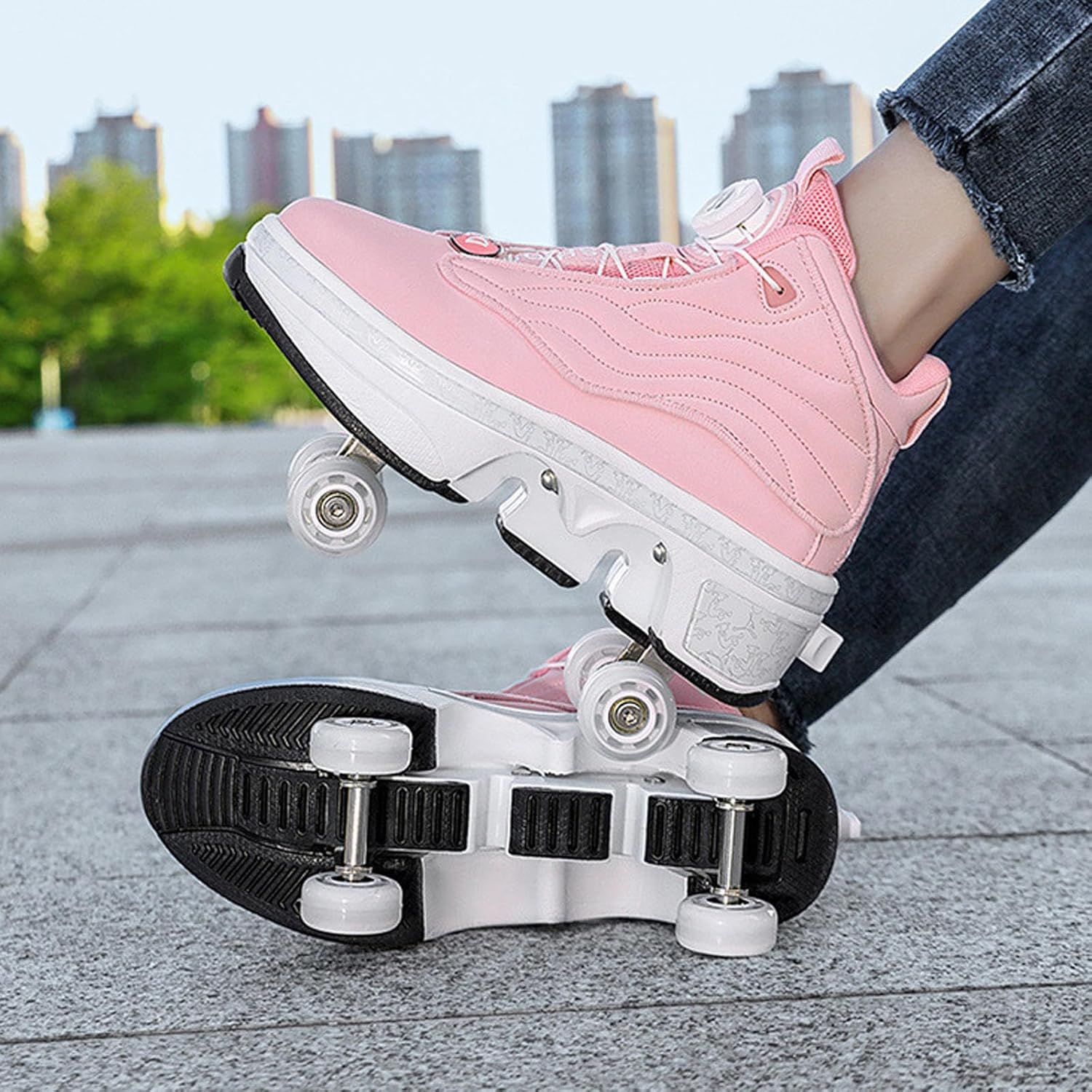 Materiali di alta qualità: la tomaia in microfibra di alta qualità è resistente agli strappi e più stabile, abbinata a un design a foro denso e traspirante, confortevole e traspirante, disperde efficacemente il calore e durevole senza rigidità. Intersuola in EVA con design della suola in gomma, ammortizzazione leggera, resistente all'usura e antiscivolo. Durevole e robusto: realizzato con ruote per infusione in PU, elevata resistenza all'usura, elevata elasticità, prestazioni di scorrimento stabili e di lunga durata. Telaio in acciaio ricamato, più stabile, portante fino a 100 chilogrammi. Pattino a rotelle due in uno: questo è un pattino a rotelle multifunzionale che combina camminata, pattinaggio e sport. Con un solo calcio si trasforma in carrucola e poi di nuovo in scarpa sportiva. È versatile e comodo da usare per bambini e principianti. Selezione della taglia: la nostra taglia è una taglia standard, puoi scegliere la taglia appropriata in base alla tabella delle taglie, si consiglia di scegliere in base alla tua situazione attuale. Se i tuoi piedi sono leggermente più larghi, si consiglia di scegliere una taglia più grande. Se preferisci indossare scarpe larghe, ti consigliamo di scegliere anche una taglia più grande. Regalo ideale: questo è un pattino sportivo molto interessante, alla moda e innovativo, con praticità, sicurezza, comfort e significato educativo. È un'attrezzatura sportiva ricreativa per adolescenti e bambini e anche il regalo perfetto per la famiglia e gli amici.
