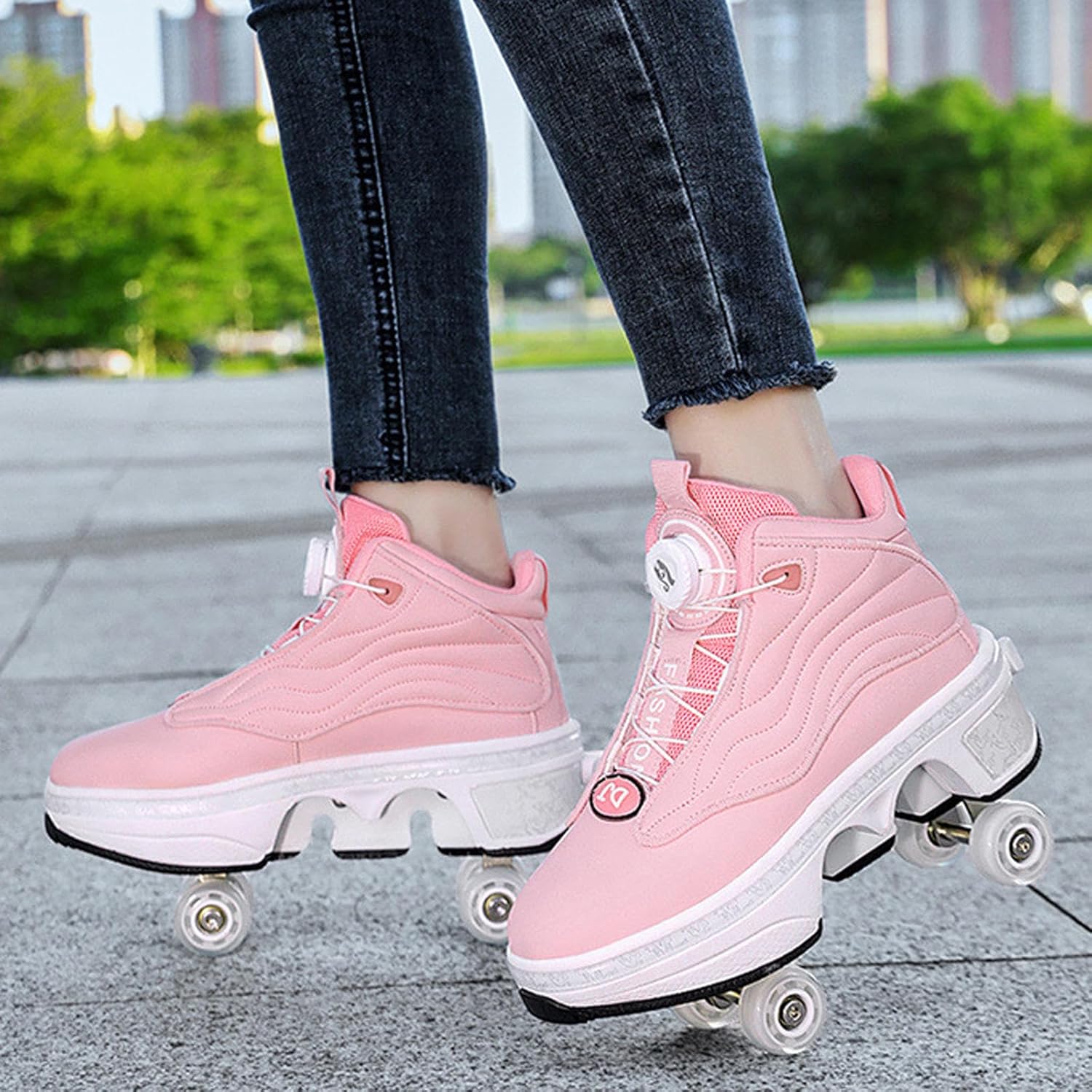 Scarpe da skate a rotelle con ruote, Scarpe da pattini a rotelle per bambini con trainer a 4 ruote retrattile, Scarpe da skateboard per trainer multifunzione a rotelle 2 in 1 Pattini a rotelle, Pink-39