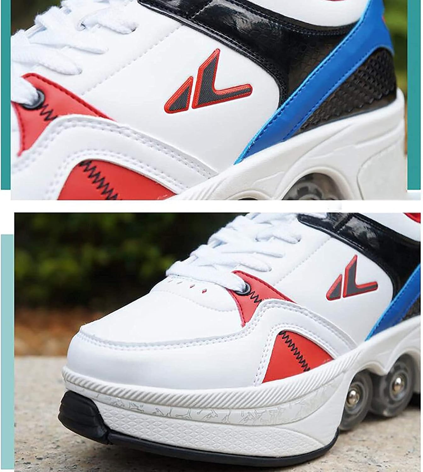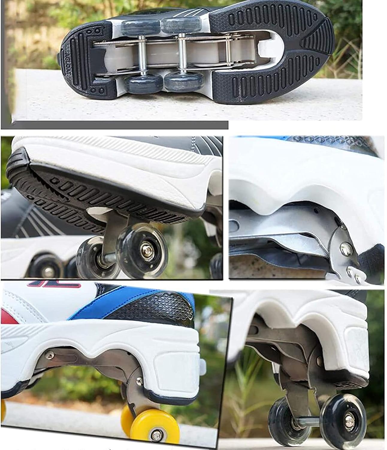 ★ Pattini a rotelle 2 in 1 la sua suola ha un paio di ruote nascoste. Questa scarpa è diversa dai normali pattini a rotelle presenti sul mercato. Non solo può essere utilizzato per il pattinaggio in linea ma può anche essere eseguito. ★ Scarpe sportive multifunzionali: Contemporaneamente a escursionismo pattinaggio sport e altri multifunzionali. ★ Conformemente al design meccanico i pattini a rotelle sono stati ripetutamente testati e innovati. ★ Materiale: Materiale superiore (microfibra) suola (gomma) materiale della ruota (pu). Utilizzare lacci tradizionali. Puoi regolare i lacci per scegliere la sensazione più comoda. ★ Spazio interno confortevole: Il tipo di materiale interno è una rete traspirante progettata per ottenere un alto grado di ventilazione e molto confortevole. Non poggia sul piede e può proteggere meglio i tuoi piedi.