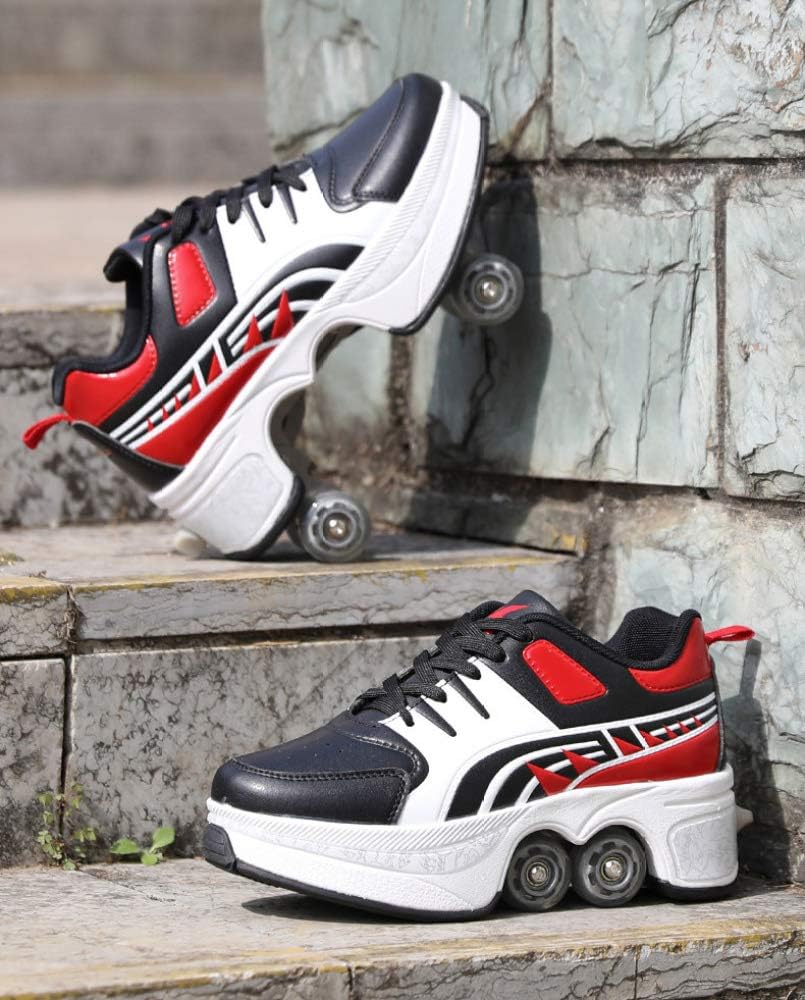 ★ Scarpe sportive deformabili multifunzionali, pattini leggeri che ti consentono di fare esercizi di fitness sempre e ovunque nella tua vita quotidiana: la combinazione perfetta di tempo libero e sport. ★ L'esclusivo design del pulsante invisibile impedisce l'apertura accidentale. C'è un pulsante sul retro della scarpa. Premilo e le ruote si apriranno. Tenere premuto il pulsante, spingere la ruota verso la piastra di base e poi rilasciarla. ★ Piccolo, leggero, facile da trasportare, può essere installato gratuitamente su scarpe basse, eliminando lo sforzo di trasporto e assemblaggio. ★ Ha un buon equilibrio e comfort, è facile controllare il centro di gravità del corpo ed è sicuro da usare. ★ Scarpe da skate moderne ed eleganti, scarpe alla moda multifunzionali per pattinaggio, feste, discoteca, ballo, compleanno, Natale.