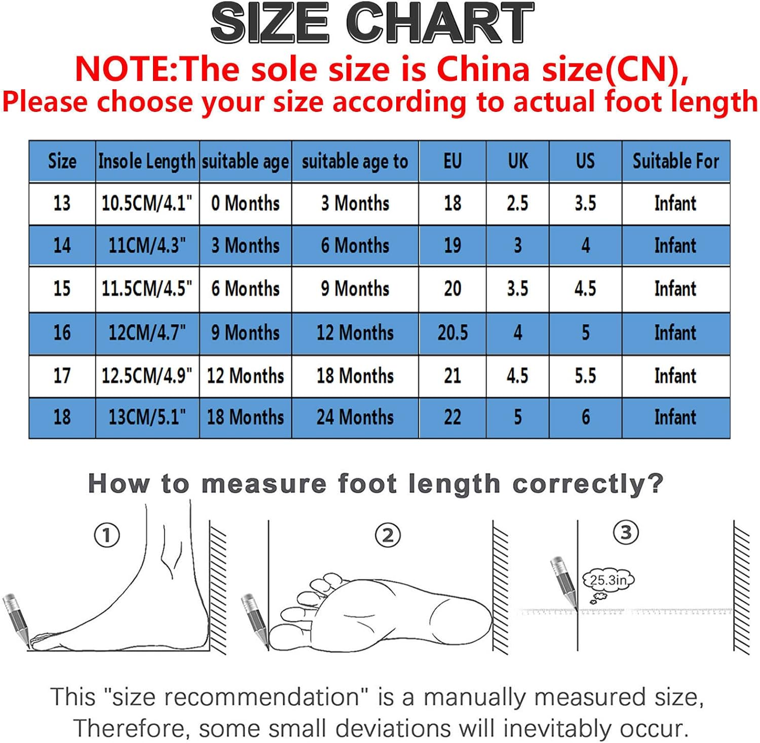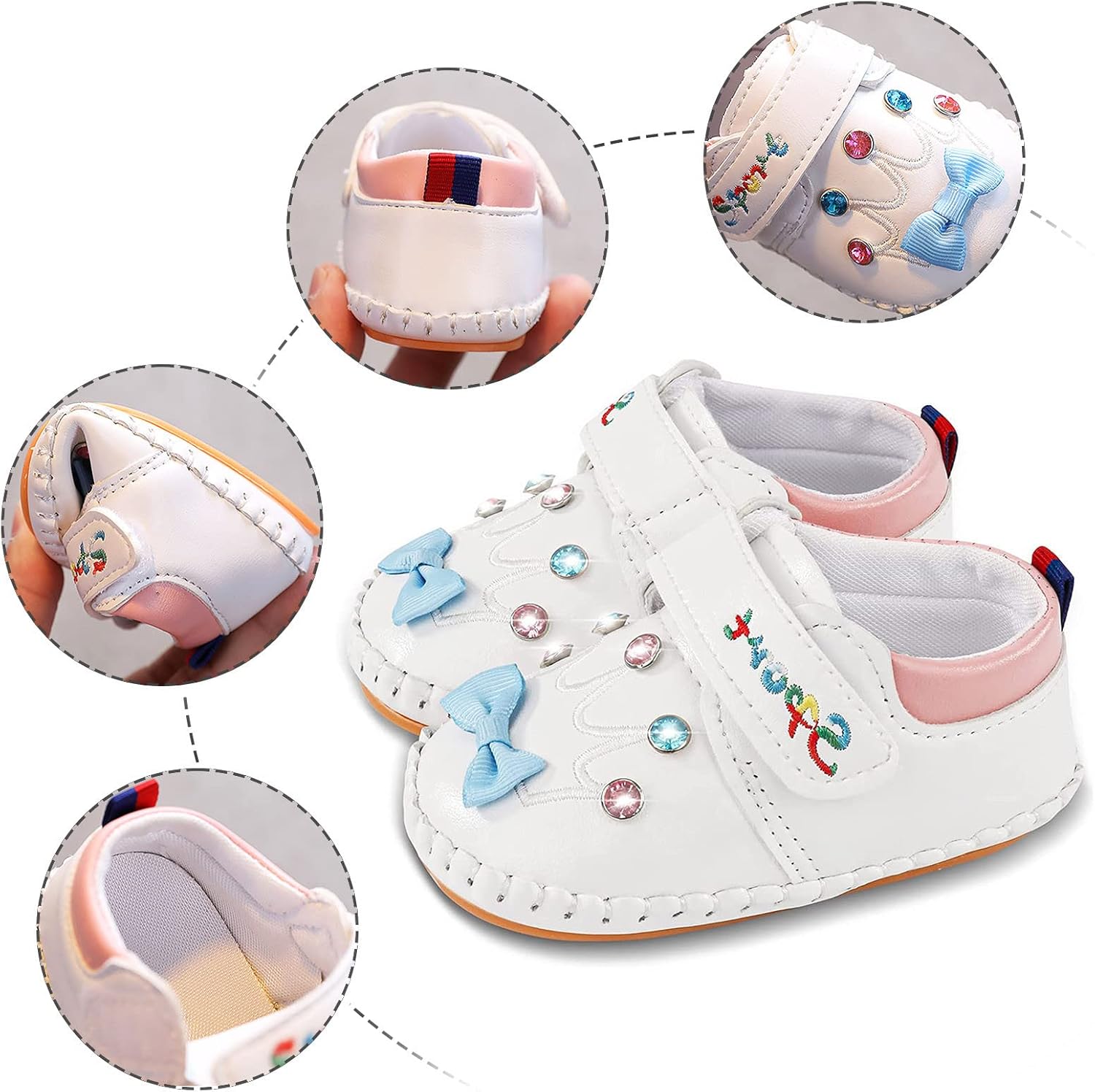 Materiale superiore della scarpa: pelle. Descrizione Materiale suola: gomma. Contenuto della confezione: 1 paio di scarpe. Lunghezza soletta = lunghezza del piede + 0,8 cm. Se non siete sicuri di quali dimensioni o altri problemi, vi preghiamo di contattarci per assicurarsi di scegliere la taglia corretta. Si prega di considerare un margine di errore di 1-3 mm a causa della misurazione manuale. Stile: casual, alla moda, feste e design affascinante, per rendere il vostro bambino più bello. Realizzato in materiali morbidi al tatto, non danneggia il bambino. Genere: ragazze e ragazzi. Tipo di chiusura: aperto.