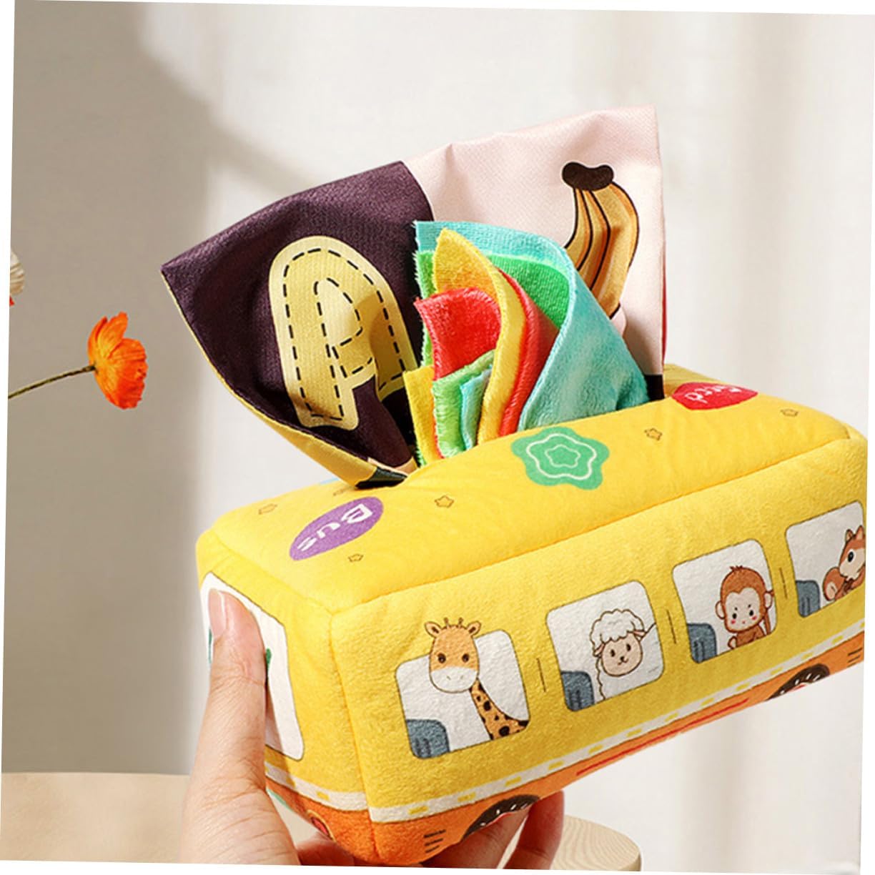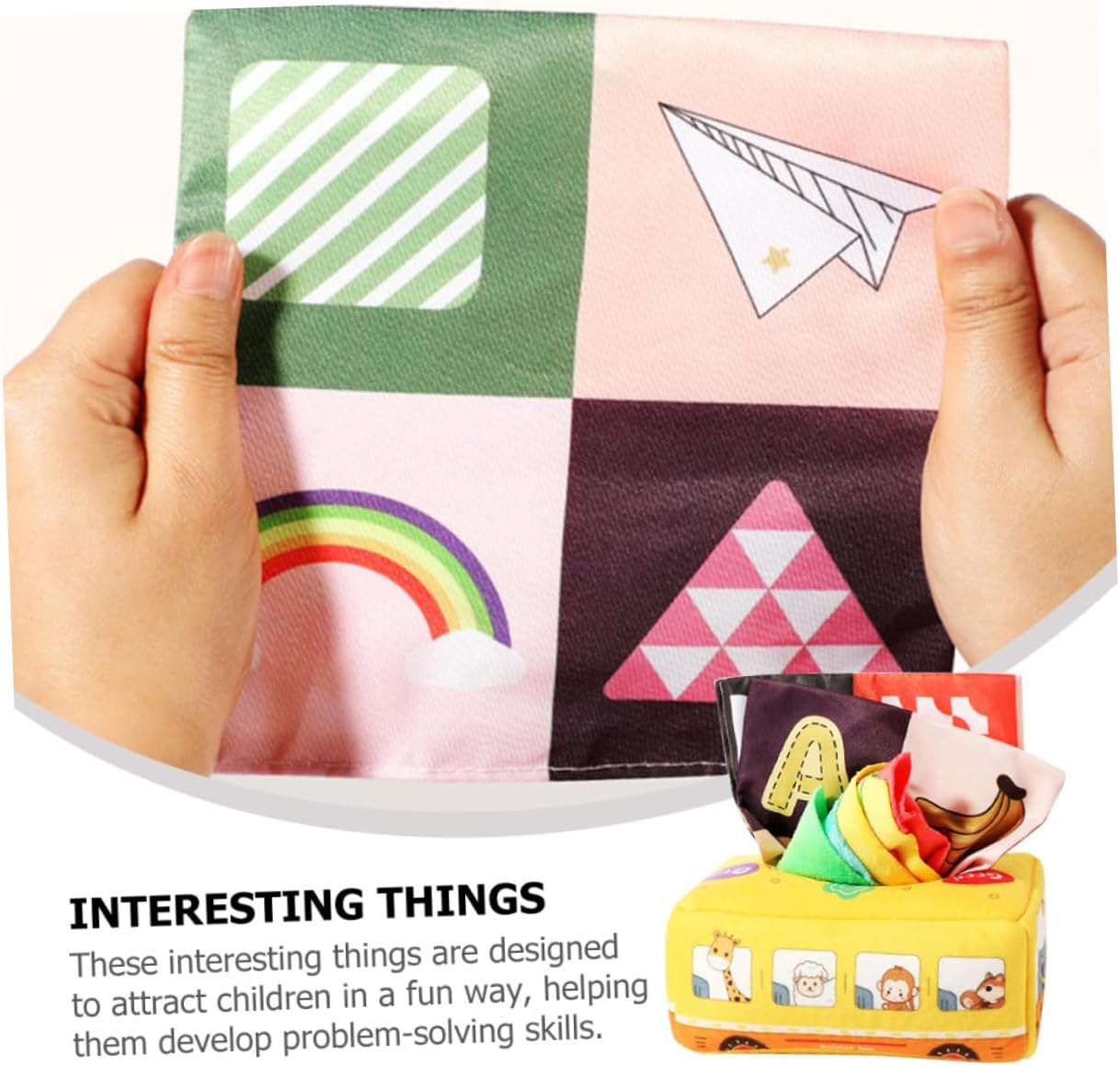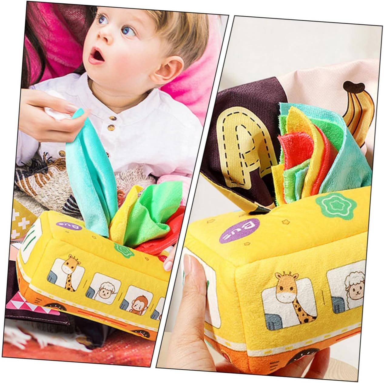 Giocattolo di fazzoletti per neonati: con questa scatola di fazzoletti puoi fare un gioco interattivo genitore-figlio con i tuoi bambini, esercitarti con le mani e utilizzare un giocattolo di fazzoletti per i fazzoletti. Sensoriale Montessori per: misura adatta alla mano dei neonati. La nostra scatola di fazzoletti attirerà l'attenzione del tuo bambino. Un buon giocattolo sensoriale per i più piccoli. Giocattolo in tessuto sensoriale non strappabile: il nostro giocattolo sensoriale per neonati e bambini piccoli ha molti giocattoli in tessuto sensoriale per stimolarli.