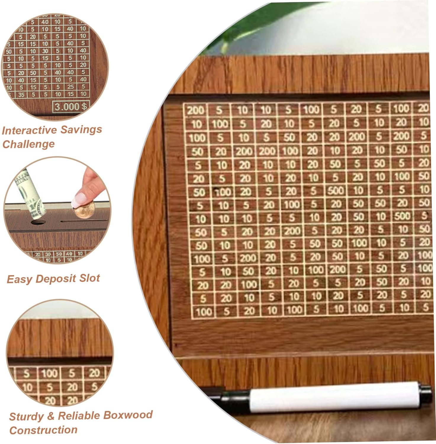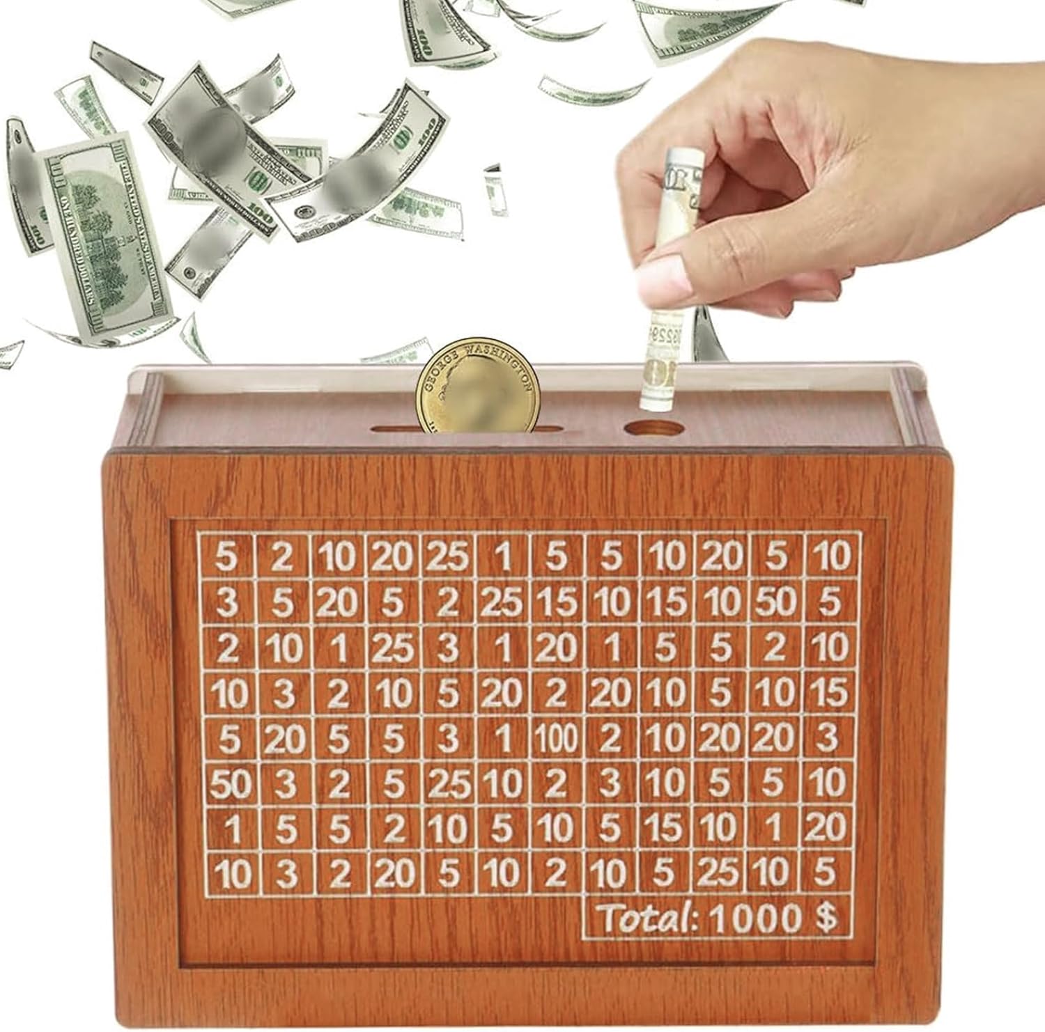 Sfida di risparmio interattivo: questa scatola per risparmiare denaro presenta un design numerato della griglia che incoraggia un approccio divertente e strutturato per raggiungere il tuo obiettivo di risparmio da $ 1000, rendendo il budget più coinvolgente. Ottimo per i risparmiatori: una riflessiva e motivazionale per chiunque cerchi di migliorare la propria disciplina finanziaria, questa scatola è perfetta per compleanni, vacanze o sfide finanziarie personali. Perfetto per adulti e bambini: che tu stia insegnando ai bambini la responsabilità finanziaria o stabilendo un obiettivo di risparmio personale, questa scatola di sfida è ideale per tutte le età e aiuta a infondere buone abitudini di denaro. Costruzione di boxwood robusta e affidabile: realizzata in bosso di alta qualità, questa scatola di risparmio è costruita per durare, fornendo una soluzione sicura ed ecologica per la conservazione di monete e banconote. Easy Deposit Slot: progettato con uno slot comodo per inserire sia moneta che moneta, questa scatola garantisce un risparmio senza problemi senza aver bisogno di aprirlo frequentemente.
