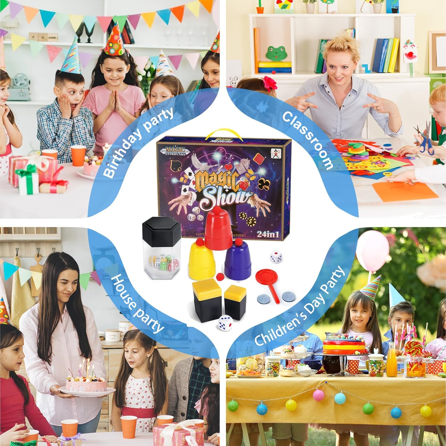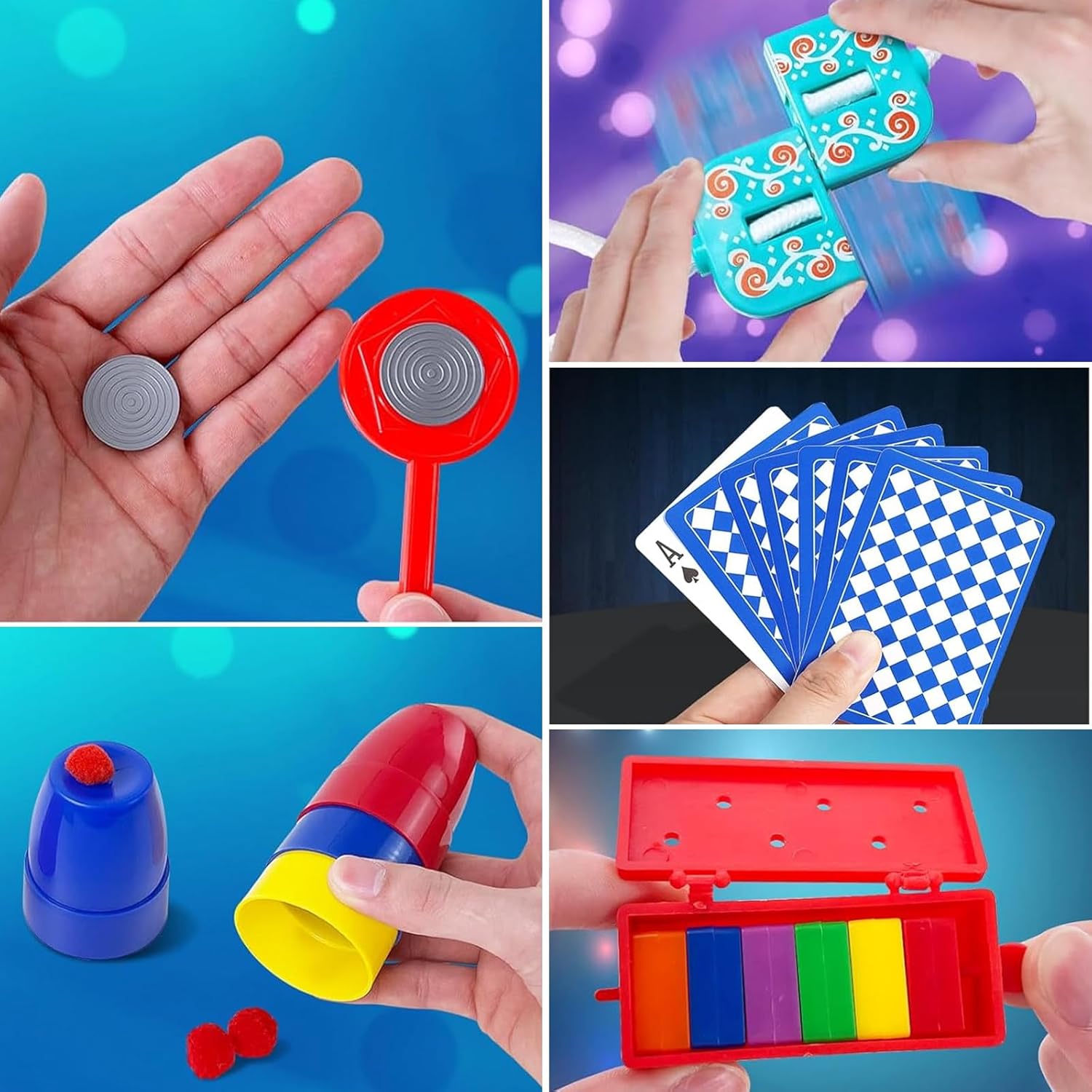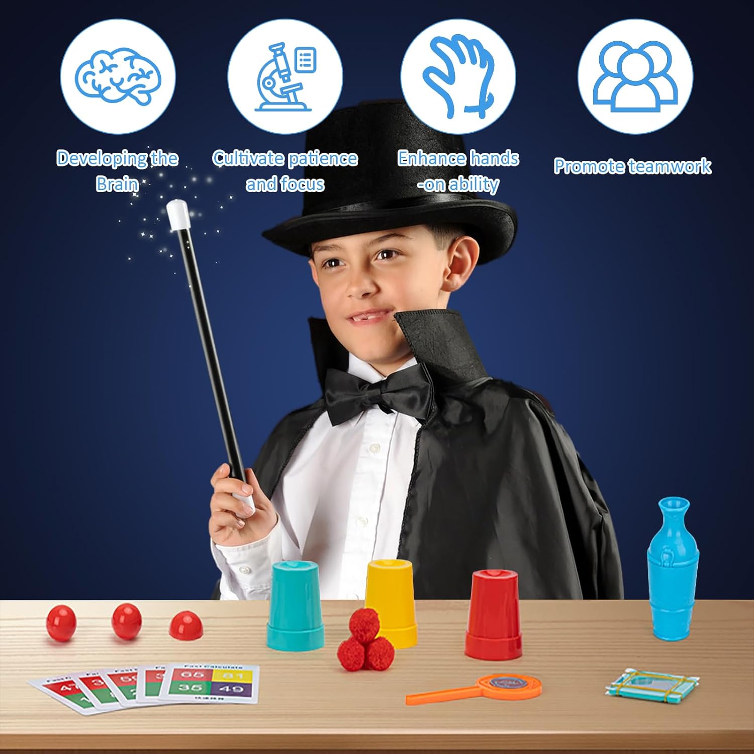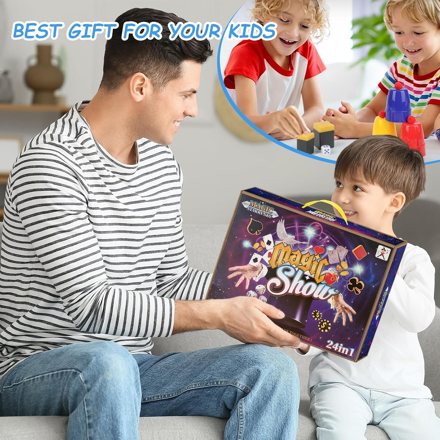 Impara diversi trucchi magici: con questa scatola magica completa per bambini, puoi introdurre il tuo bambino nel mondo della magia. Contiene 24 oggetti di scena – che si tratti di principianti o aspiranti maghi, il set soddisfa tutti i desideri. Materiali di alta qualità: la scatola magica per bambini è composta da componenti di alta qualità con bordi arrotondati e levigati, per un uso sicuro. Appositamente progettato per le mani giovani, consente ai principianti di imparare trucchi magici con fiducia e godersi la gioia di scoprire. 【Istruzioni】 La scatola magica per bambini include una guida magica e video educativi dettagliati. I bambini imparano semplicemente le basi e i trucchi complessi, migliorano gradualmente le loro capacità di esecuzione, acquisiscono fiducia in se stessi e creatività e si immergono nell'affascinante mondo della magia. Divertimento e sviluppo delle competenze: scopri con la scatola magica per bambini il potenziale di apprendimento giocoso. Diversi strumenti magici allenano la coordinazione occhio-mano, il pensiero cognitivo e la comunicazione, promuovono la creatività e consentono un'interazione allegra con la famiglia e gli amici. Il regalo perfetto per i bambini: la scatola magica per bambini è il regalo ideale per bambini a partire dai 6 anni. Che si tratti di compleanni, Natale o feste, garantisce divertimento senza fine, sorprese e suscita entusiasmo per l'affascinante mondo della magia.