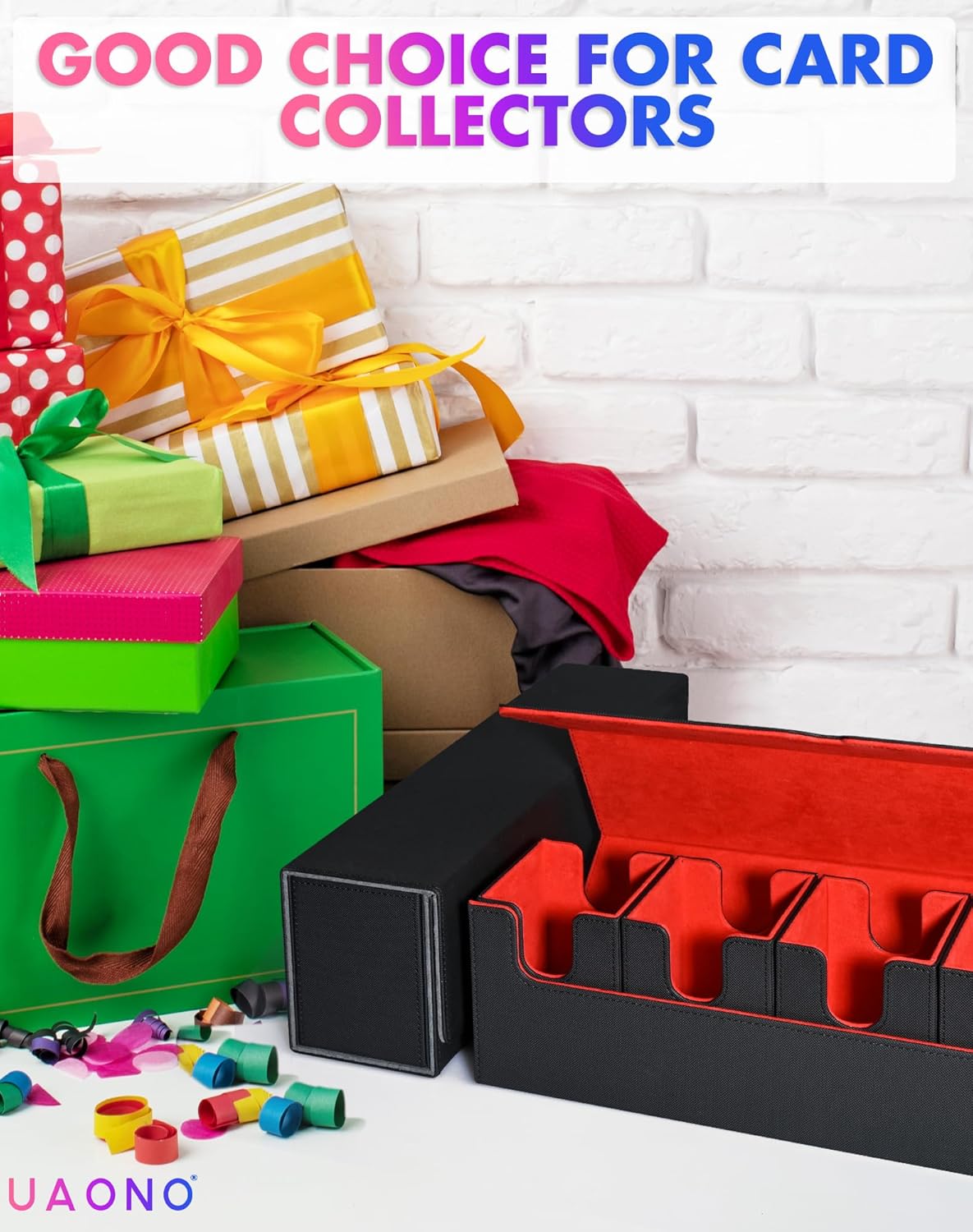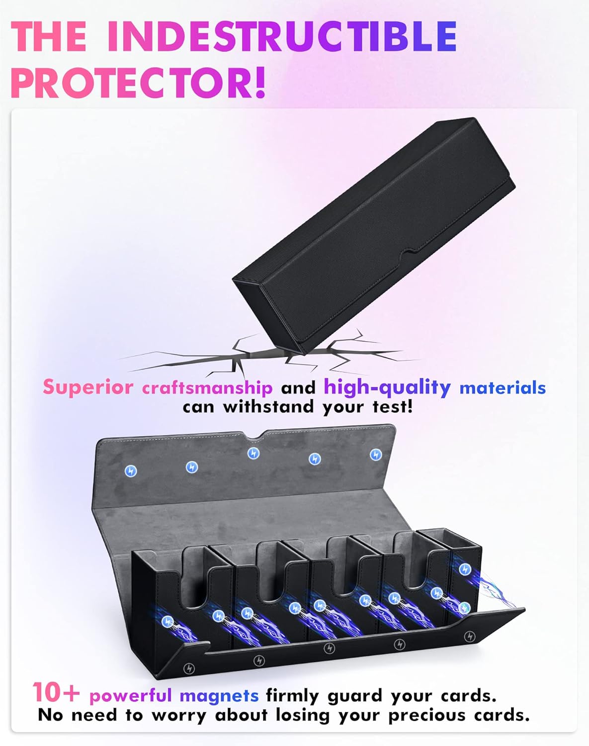 Portamazzo di carte 5 in 1: include 4 portamazzi separati, una scatola per dadi/gettoni e un coperchio. Ciò significa che puoi giocare facilmente con più mazzi e mantenerli organizzati. Il coperchio rimovibile funge anche da tappetino da gioco se dimentichi le carte a casa. Grande capacità: ogni piccola scatola per mazzi di carte misura 8,9 x 8,9 x 10,3 cm, la scatola per dadi misura 8,9 x 3,8 x 9,9 cm. Ogni set può contenere fino a 480 carte (singole, 360 carte (doppie) o 800 carte (non adatte per il caricamento dall'alto). Materiale durevole e robusto: la nostra scatola per carte è realizzata con materiali di alta qualità. La morbida fodera in microfibra e la pelle impermeabile proteggono le tue preziose carte da graffi e piegature e offrono una protezione perfetta per tutti i tipi di carte. Forte chiusura magnetica: grazie ai magneti potenti ma facili da usare, le tue carte rimangono al sicuro. La posizione del contenitore dei dadi dovrebbe essere fissa per garantire stabilità magnetica e assicurati un'apertura e una chiusura fluide. Ampia compatibilità: porta quattro mazzi Commander a una serata di gioco con gli amici Perfettamente compatibile con MTG, Yu-Gi-Oh, PKM, carte sportive e altri giochi di carte collezionabili: la scelta ideale per tutti gli appassionati di carte collezionabili.