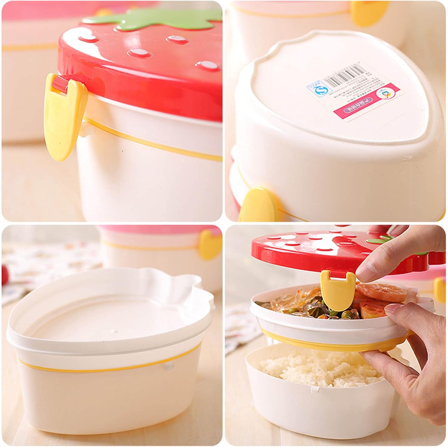 【Posate integrate】 Questa scatola per bambini viene fornita con una forchetta e un cucchiaio, che sono accessori integrati. La forchetta e il cucchiaio si adattano perfettamente al contenitore per il pranzo e sono materiali per alimenti e possono essere riutilizzati. Materiali: questo contenitore per il pranzo per bambini utilizza materiali e qualità alimentare, nessun odore particolare, ecologico per riutilizzabile, adatto per microonde, frigorifero, lavastoviglie. Design a fragola: i colori tenui e l'aspetto della fragola fanno sì che i tuoi bambini mangino meglio. Sigillatura: il coperchio con chiusura a 2 punti consente di riporlo saldamente in una borsa, uno zaino o una borsa. 【Design a doppio scomparto】Grande capacità e 2 comodi strati sono impilati uno dentro l'altro, consentendo di separare cibi diversi.