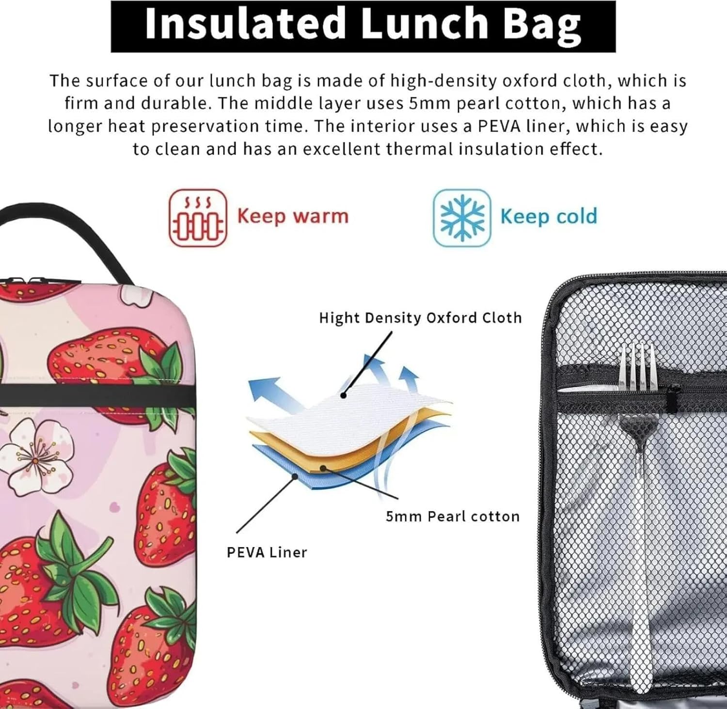 Scatola per Il Pranzo isolata per Donne Ragazze Bambini Borsa per Il Pranzo alla Fragola per Lavoro, Picnic, Scuola, Viaggi, Escursioni, Spiaggia o Pesca