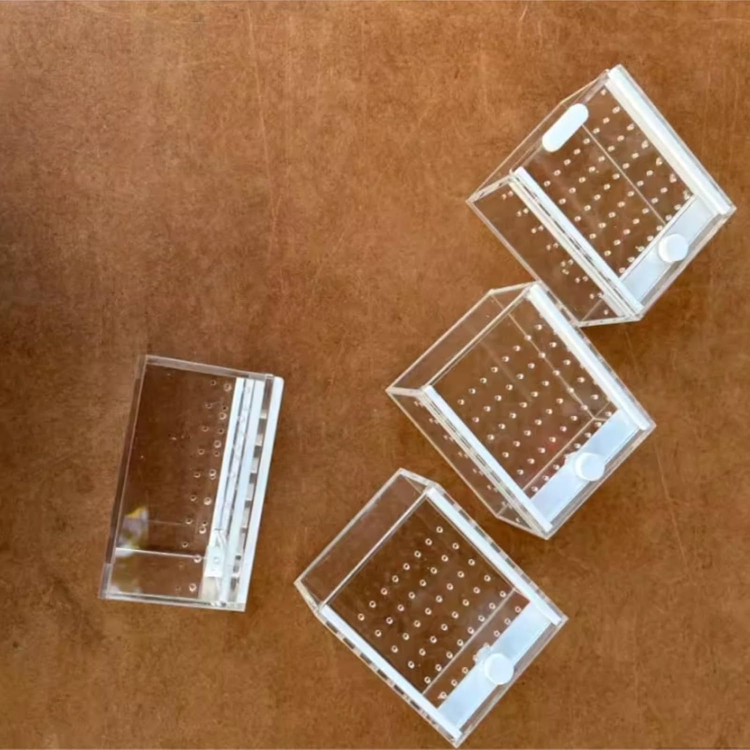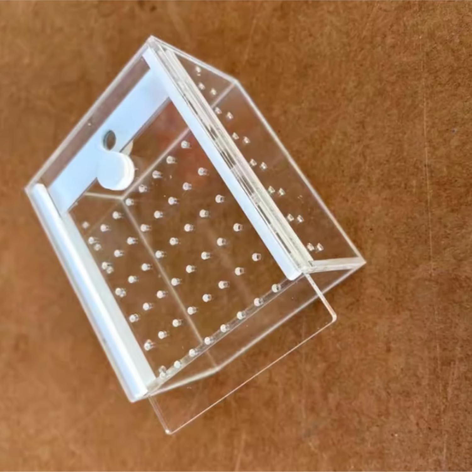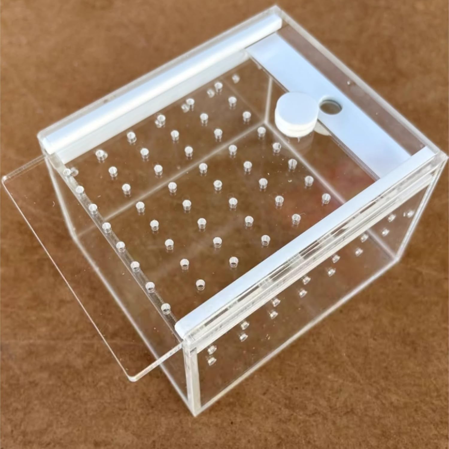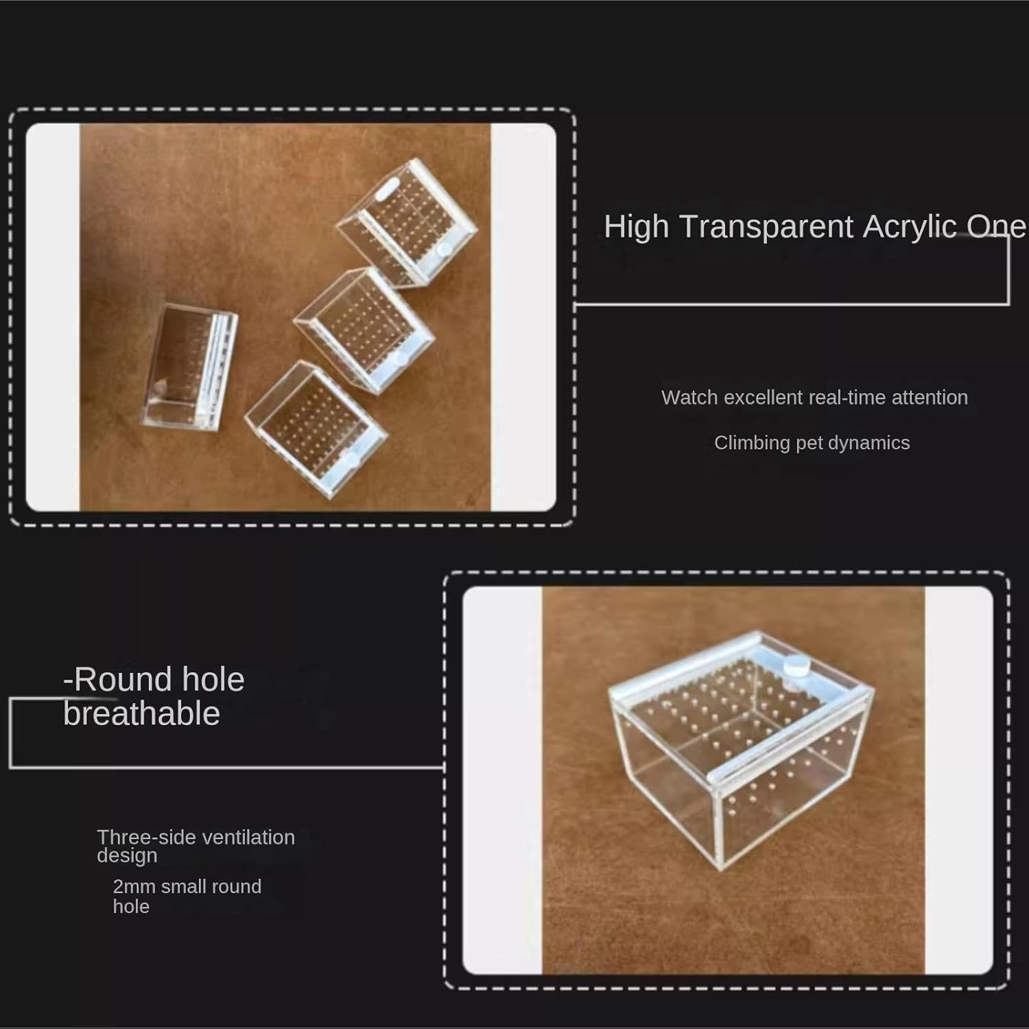 Materiale acrilico trasparente: completamente trasparente, luminoso e limpido, facile da osservare e pulire. Facile da aprire e da usare: comodo for prendersi cura di piccoli animali domestici. Fori di ventilazione: i fori disposti in modo ordinato consentono ai rettili di respirare. Dimensioni: 10x8,5x6 cm, adatto a piccoli rettili come ragni, mantidi, coleotteri e piccoli serpenti ornamentali. Spazioso e portatile: l'ampio spazio interno consente di osservare e spostare facilmente gli insetti; design leggero e compatto per un comodo trasporto e stoccaggio.