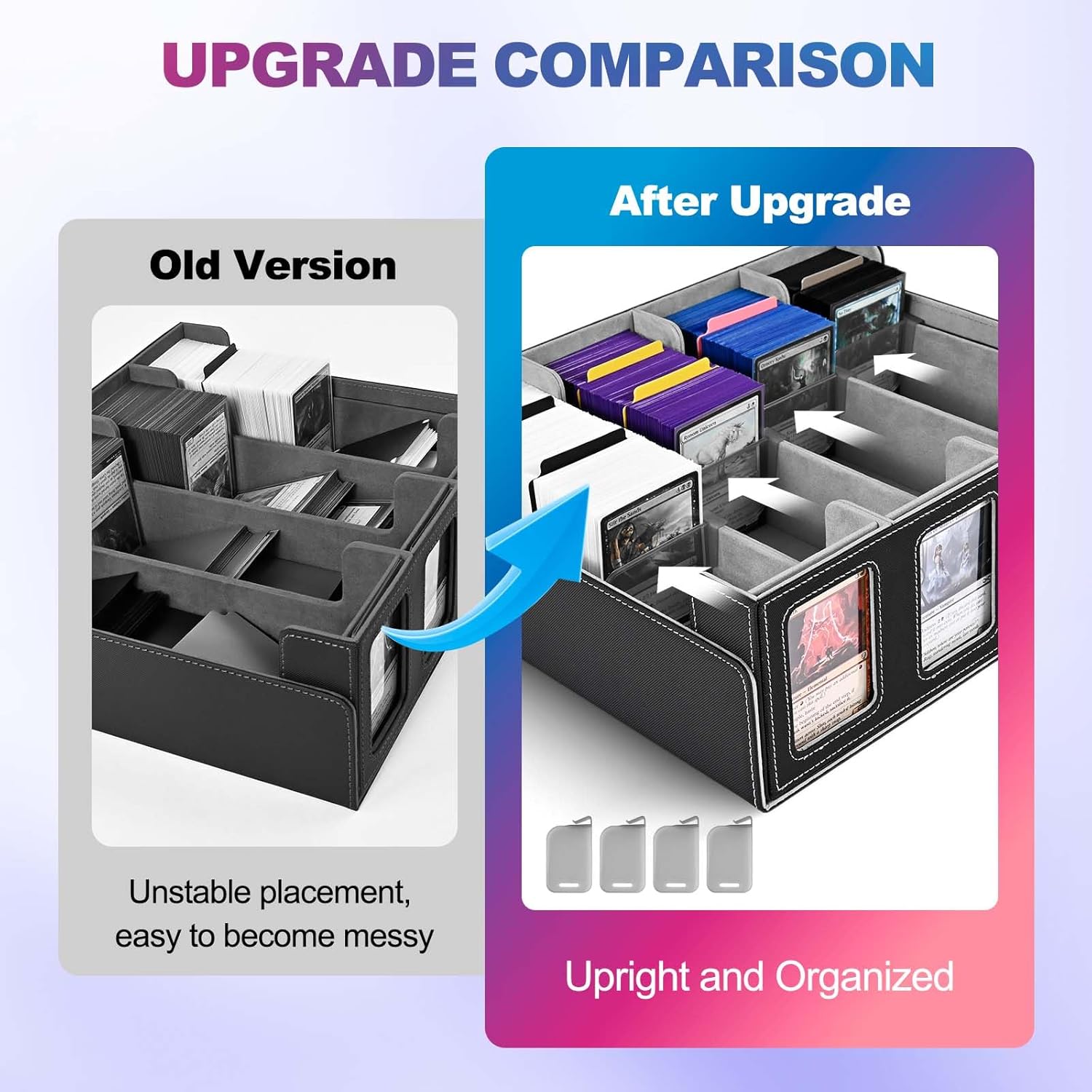 Display personalizzato: questa scatola di immagazzinaggio è dotata di slot su un lato per visualizzare 4 carte, puoi mostrare con orgoglio le tue carte Commander negli slot per carte appositamente progettati, fornendo un display personalizzato e puoi facilmente identificare il gruppo di carte in ogni scatola di carte senza aprire la scatola di carte, molto umanizzata e pratica. Super grande capacità: la scatola di immagazzinaggio delle carte mtg è abbastanza grande da contenere oltre 640 carte con caricatore superiore, 1300+ carte a doppia faccia o 3000+ per riporre carte senza maniche; Soddisfa le tue esigenze di archiviazione in un colpo solo con la sua immensa capacità Ben realizzato: lo strato esterno della scatola porta carte tcg è realizzato in pelle PU con trama antiscivolo, impermeabile e resistente all'usura, che può mantenere le tue carte ben protette durante il trasporto quando la scatola viene scossa o spostata violentemente. Inoltre il coperchio è rimovibile, risparmia spazio e può essere utilizzato anche per tappetini da gioco. Facile da organizzare e classificare: questa custodia per giochi di carte è dotata di 24 linguette divisorie per carte colorate e include 4 supporti per carte, possono aiutarti a separare diversi tipi di carte da gioco, facilitando l'organizzazione e la classificazione di carte e accessori. Questa configurazione consente di risparmiare tempo nella ricerca e migliora notevolmente l'efficienza. Ampia compatibilità: le scatole per carte sono perfette per Magic The Gathering, Duskmourn, Bloomburrow, Assassin's Creed, Modern Horizons 3, One Piece e carte sportive, come carte da baseball, basket e calcio. Che tu sia un giocatore MTG, PTCG o TCG, ti offre una gioia senza precedenti nel gioco di carte