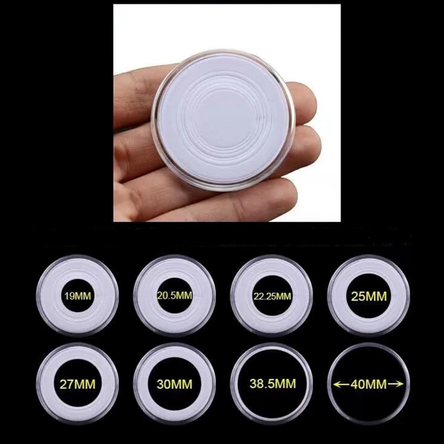 Materiale: realizzato in resistente materiale PS+PP, supporto per un uso a lungo termine. Grande capacità: con una capacità di 60 monete, questo supporto consente di riporre in modo organizzato le collezioni di monete. Design a doppia fibbia: lo stoccaggio sicuro a doppio anello e la protezione a doppio strato forniscono maggiore sicurezza e protezione per monete preziose. Cuscinetto interno regolabile: il cuscinetto interno regolabile può ospitare monete con diametro compreso tra 19/5/22,5/25/27/30/38,5/41 mm, perfetto per diverse dimensioni. COMODA SOLUZIONE DI STOCCAGGIO: Progettato pensando ai collezionisti, questo supporto offre una soluzione di archiviazione affidabile e conveniente per preziose collezioni di monete.