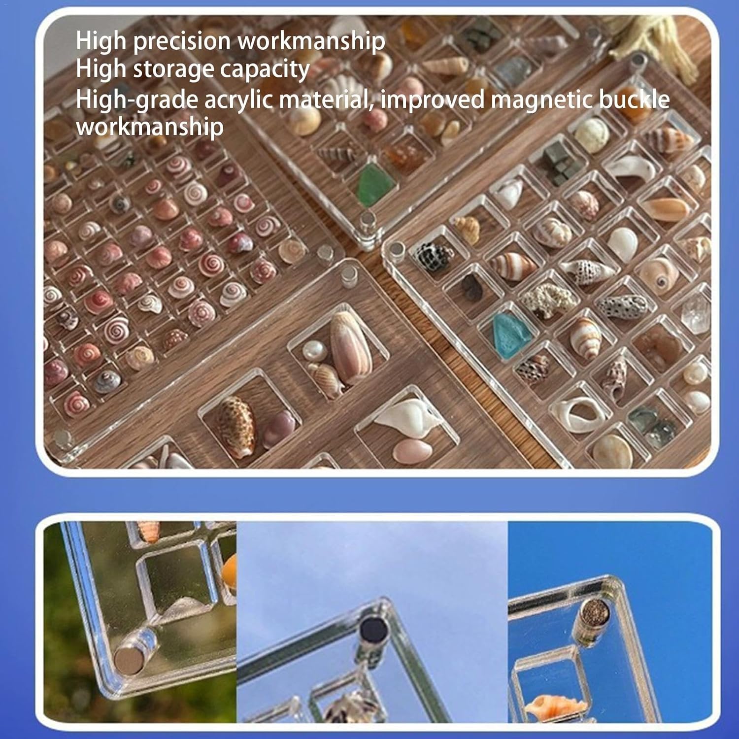 Massimizza la capacità di archiviazione: massimizza la capacità di archiviazione e migliora l'esperienza di viaggio con una grande capacità, rendendola una buona aggiunta all'arredamento della tua casa. Materiale di alta qualità: nessun compromesso sulla qualità del display. La scatola espositiva in acrilico con magnete Majestic Shell è realizzata in materiale acrilico altamente trasparente, a prova di caduta. La tua collezione di conchiglie rimarrà al sicuro e ben esposta. Ordinamento semplice: la nostra scatola magnetica in acrilico presenta 36 griglie separate perfette per organizzare i tuoi materiali creativi. Con un design unico, rende l'organizzazione semplice e senza stress. Manutenzione senza problemi: mantieni facilmente la brillantezza del tuo guscio con una semplice pulizia e assicurati che il display rimanga intatto con una manutenzione minima. Risparmia tempo e fatica e mantieni la tua collezione in perfette condizioni. Ampiamente usato: conserva i tuoi materiali artigianali nella nostra scatola espositiva magnetica in guscio acrilico. Una soluzione perfetta per risparmiare spazio, ideale per riporre perline, gioielli e materiali artistici come la pittura.
