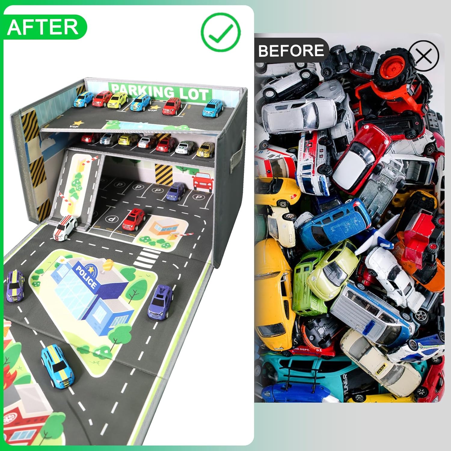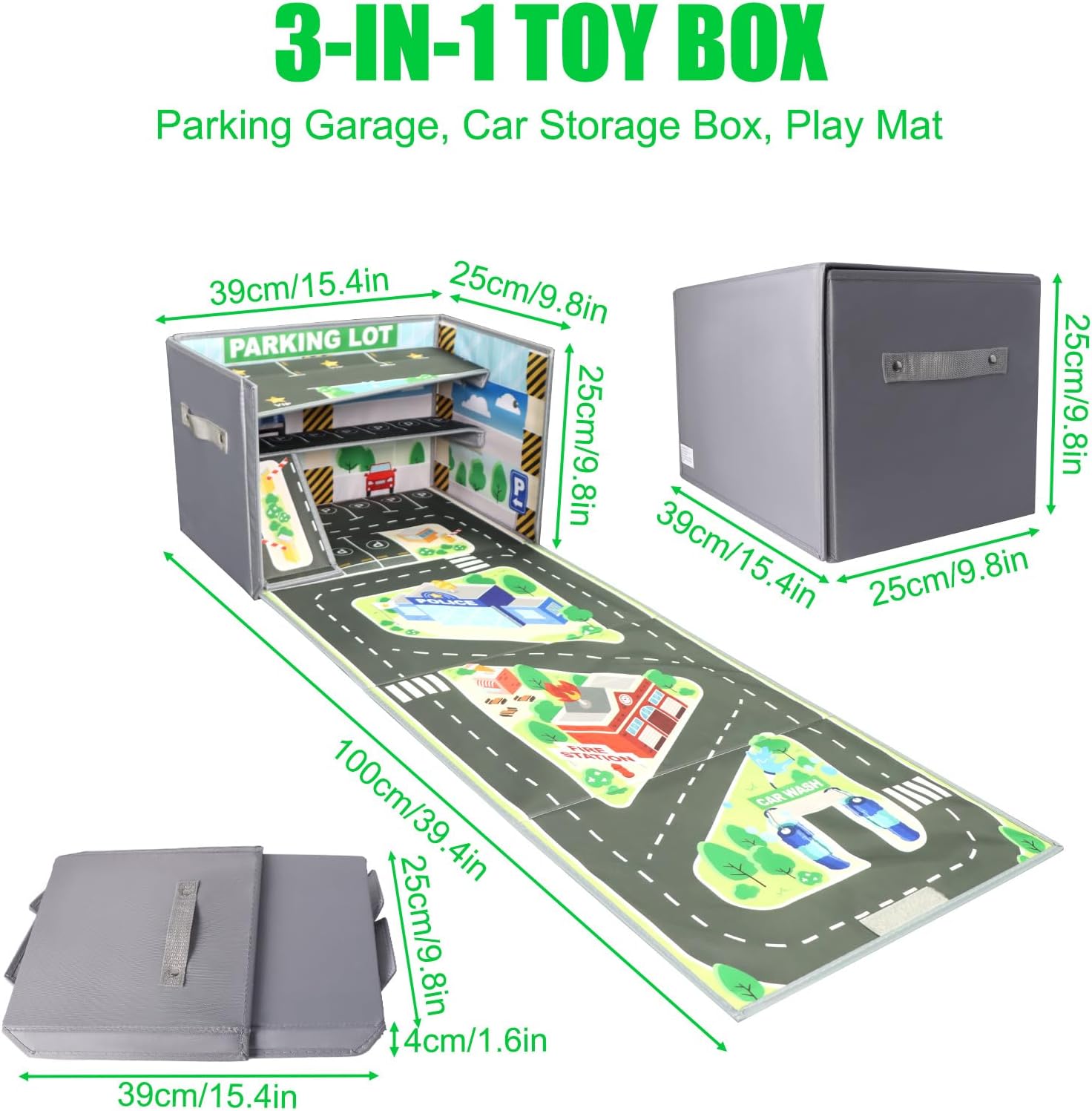 Scatola di immagazzinaggio integrata per bambini: Questo garage per bambini è dotato di un tappeto da gioco incorporato, dove i bambini possono divertirsi con le loro auto giocattolo su una strada interattiva. Aiuta a tenere in ordine le auto Hot Wheels e offre infinite possibilità di gioco. Perfetto per incoraggiare l'ordine e stimolare l'immaginazione dei bambini. Grande capacità: Questo garage può contenere oltre 200 auto Hot Wheels, garantendo che ogni macchina abbia il suo posto. Il design spazioso permette ai bambini di accedere facilmente alle loro auto preferite, mantenendo la stanza ordinata. Design compatto e portatile: Facile da piegare per un facile trasporto, questo tappeto da gioco è perfetto a casa o in viaggio. Ideale per viaggi, gite o per portare l'emozione di Hot Wheels ovunque, con maniglie laterali per un trasporto comodo. Struttura durevole e sicura: Realizzato con materiali di alta qualità e sicuri per i bambini, questo garage resiste a anni di gioco. La sua struttura robusta assicura durata anche con un uso frequente, rendendolo un'ottima scelta per i giochi intensi dei bambini. Design multifunzionale: Quando aperto, il coperchio diventa una strada di gioco, offrendo uno spazio perfetto per corse e parcheggio. Questo design multifunzionale combina gioco e immagazzinaggio in un'unica scatola compatta e facile da usare.