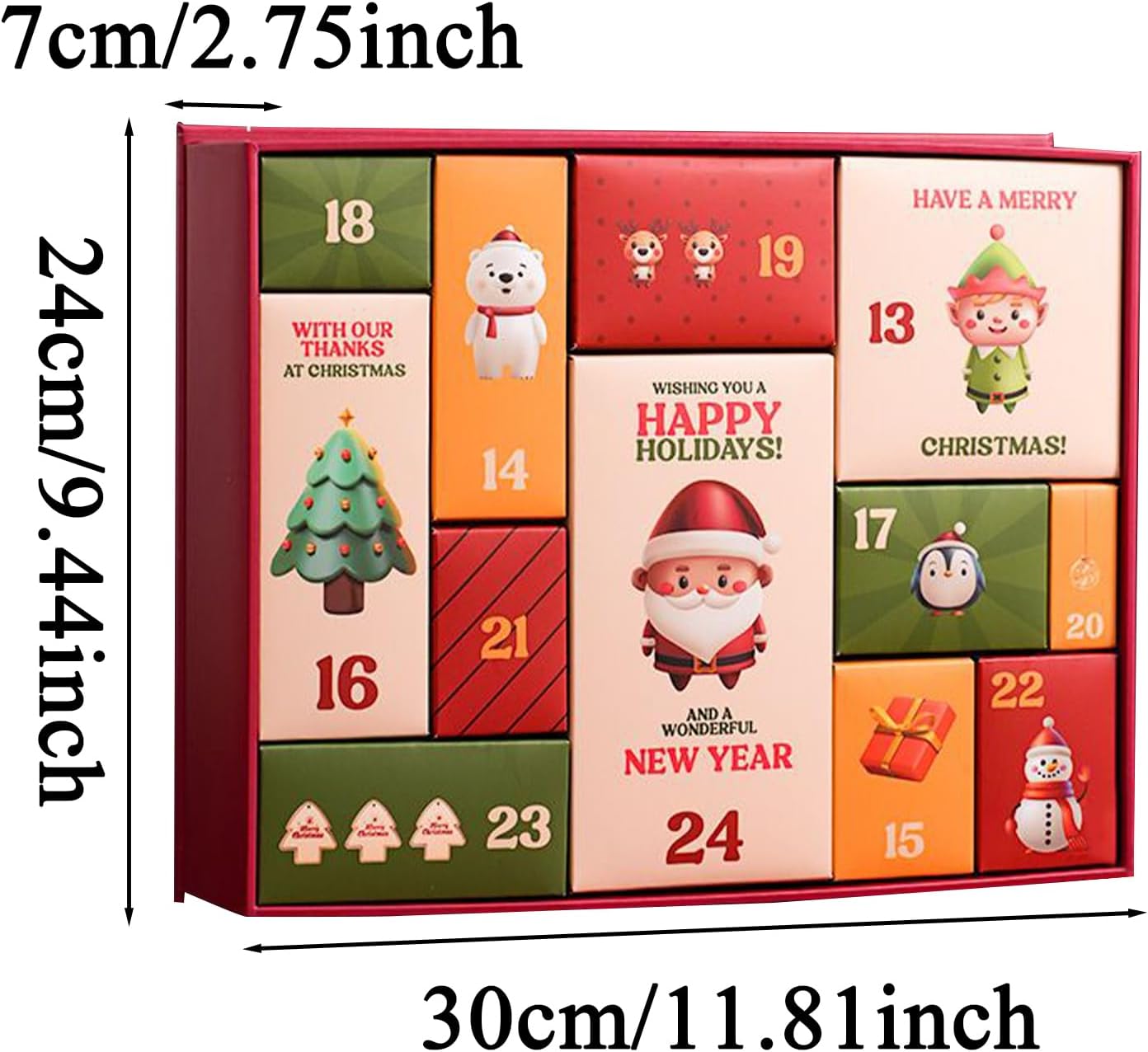 Utilizzo flessibile: riempi gli scomparti vuoti con dolci e accessori per idee regalo individuali per diverse occasioni e preferenze personali con un'ampia gamma di usi. Momenti magici dell'Avvento: apri ogni giorno un nuovo scomparto e attendi con ansia il periodo natalizio. Questo calendario trasforma l'attesa del Natale in un'esperienza interattiva piena di divertimento e sorprese. Il calendario deve essere compilato da solo. Atmosfera festosa: questa scatola natalizia crea un'atmosfera accogliente e festosa con motivi natalizi dettagliati che deliziano tutte le età e rendono le vacanze un'esperienza naturale e gioiosa, perfetta per le ore suggestive durante il periodo natalizio. Design unico dello scomparto: divisione ben studiata con scomparti variabili per regali o appunti di qualsiasi dimensione. Aumenta l'attesa ad ogni porta aperta e garantisce una presentazione organica di tutte le sorprese durante l'intera stagione dell'Avvento. Calendario dell'Avvento: il design dello scomparto per il conto alla rovescia di 12 giorni aiuta gli utenti a pianificare il proprio programma mentre si godono il rituale quotidiano di apertura dei regali che precede la vigilia di Natale, aumentando in modo naturale ed efficace l'attesa festiva