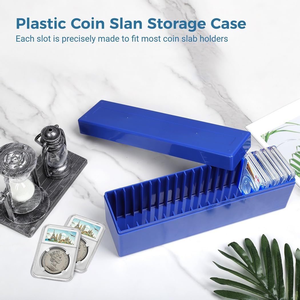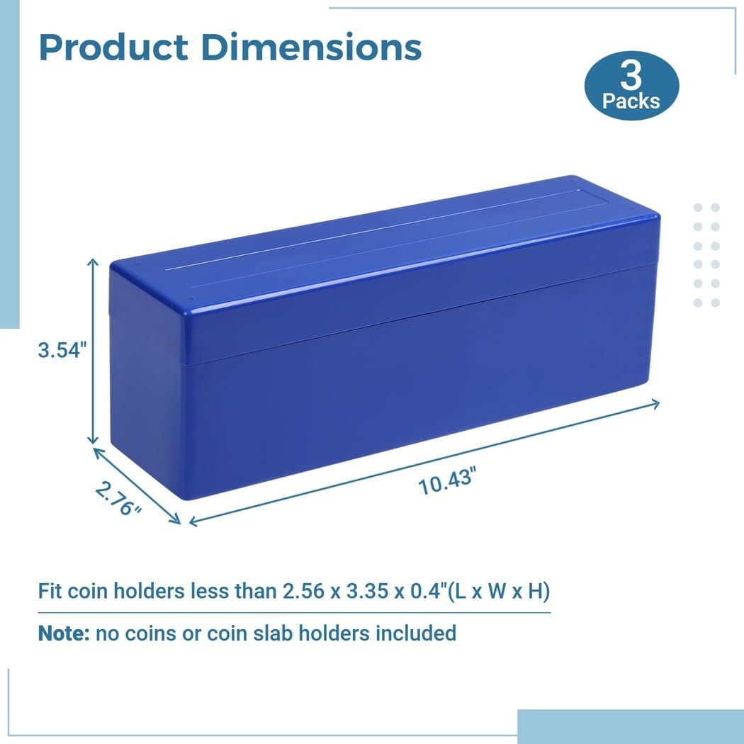 Organizzazione delle scatole: tieni i tesori delle monete disposti all'interno di queste tre scatole portaoggetti, ognuna con venti slot; organizza e mostra utilizzando i comodi organizzatori Compatibilità: queste scatole per la raccolta di monete si adattano a quasi tutte le lastre di monete più piccole di 6,5 x 8,5 x 1 cm (lunghezza x larghezza x altezza). Possono contenere ngc, pcg, pmg e supporti in stile certificato Gestione dello spazio: massimizza l'area utilizzando le scatole compatte portamonete, che sono 26,5 x 7 x 9 cm (lunghezza x larghezza x altezza); tienile nei cassetti, sulle scrivanie o sugli scaffali e conservale senza disordine Costruzione: realizzato con plastica robusta di qualità; gli organizer per lastre di monete possono gestire collisioni e salvaguardare; il loro aspetto elegante, lucido è comodo al tatto e ha un aspetto artistico Guarnizione: rimane al sicuro grazie al coperchio; sigillare il coperchio, bloccarlo e rimane chiuso, anche capovolto; rimane protetto
