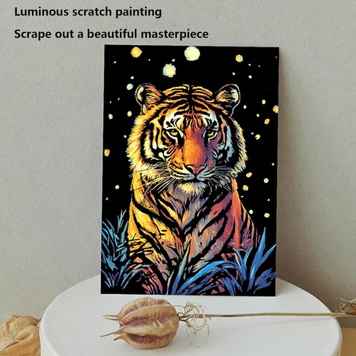 Crea un'esperienza visiva ipnotizzante: quando raschiate delicatamente le linee stampate con il raschietto incluso e fate brillare una torcia elettrica o un'altra fonte di luce brillante, la carta emette un affascinante effetto fosforescente, svelando un motivo colorato illuminato Spark Innovation: delizia i bambini con il nostro set di carta da grattare A4, questa carta da grattare da disegno con animali è piena di accattivanti motivi artistici per una maggiore esplorazione e creatività Stimola lo sviluppo cognitivo: stimola l'esplorazione creativa con i nostri biglietti da grattare per bambini, promuovendo l'uso di materiali per attività artigianali e migliorando la coordinazione occhio-mano per lo sviluppo educativo Materiale sicuro e ampio utilizzo: nessun odore o sostanze nocive rendono questa versatile carta da grattare con glitter è perfetta per un uso sicuro e ampio da parte di bambini, adolescenti e adulti Diffondi l'amore: migliora il tuo spazio abitativo con questi fogli da grattare per incisione, il regalo creativo perfetto per aggiungere un tocco artistico ed esprimere i migliori sentimenti ad amici e familiari