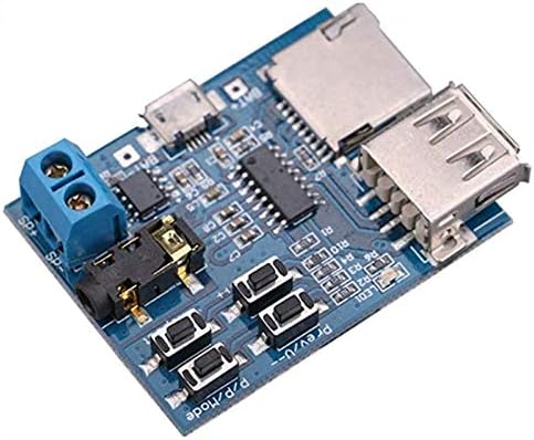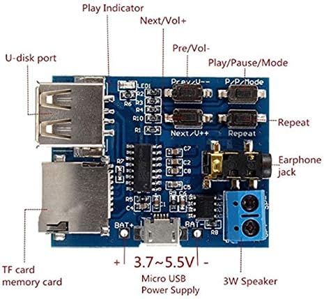 Descrizione del prodotto:1 Supporto MP3, riproduzione automatica all'accensione, l'indicatore LED rosso si aggiorna durante la riproduzione; 2. Supporta disco U (testato 32G), scheda TF (testato 16G), riproduzione; Attiva la modalità scheda TF standard, se non è presente automaticamente alcuna scheda TF nel disco U ed entrambi i dispositivi sono installati, è possibile impostare manualmente la modalità di riproduzione, fare riferimento al manuale operativo dei tasti per i dettagli. Supporta la scheda TF (scheda di memoria del telefono cellulare), riproduzione del disco U; nessuna saldatura con terminale a clacson, comoda per il cablaggio; il design modulare è semplice. Con l'interfaccia dell'adattatore di alimentazione -USB, può essere tramite alimentatore mobile o caricatore USB tramite il cavo dati del telefono cellulare. Può anche utilizzare una batteria da 3,7 V e un adattatore di alimentazione USB da 5 V. Super suono, amplificatore integrato da 2 W (alimentazione 5 V fino a 3 W) collegato direttamente all'altoparlante (consigliato con altoparlante da 4 ohm 3 W), le cuffie placcate in oro da 3,5 mm possono essere collegate a cuffie o audio esterno. 3. I pulsanti possono regolare il movimento su e giù, il volume +-, la pausa/riproduzione, il cambio di modalità, per i dettagli consultare le istruzioni di funzionamento dei pulsanti. 4. È possibile premere il pulsante per impostare "Canzone singola/intera". L'impostazione predefinita è il brano completo all'accensione e premere il pulsante "Ripeti" per modificarlo
